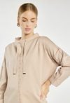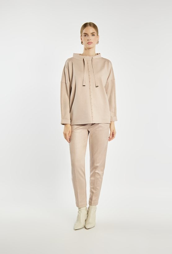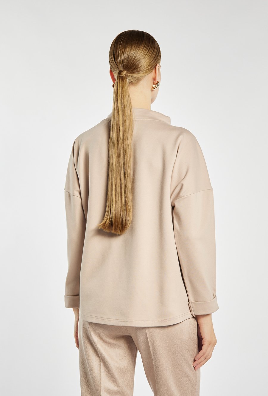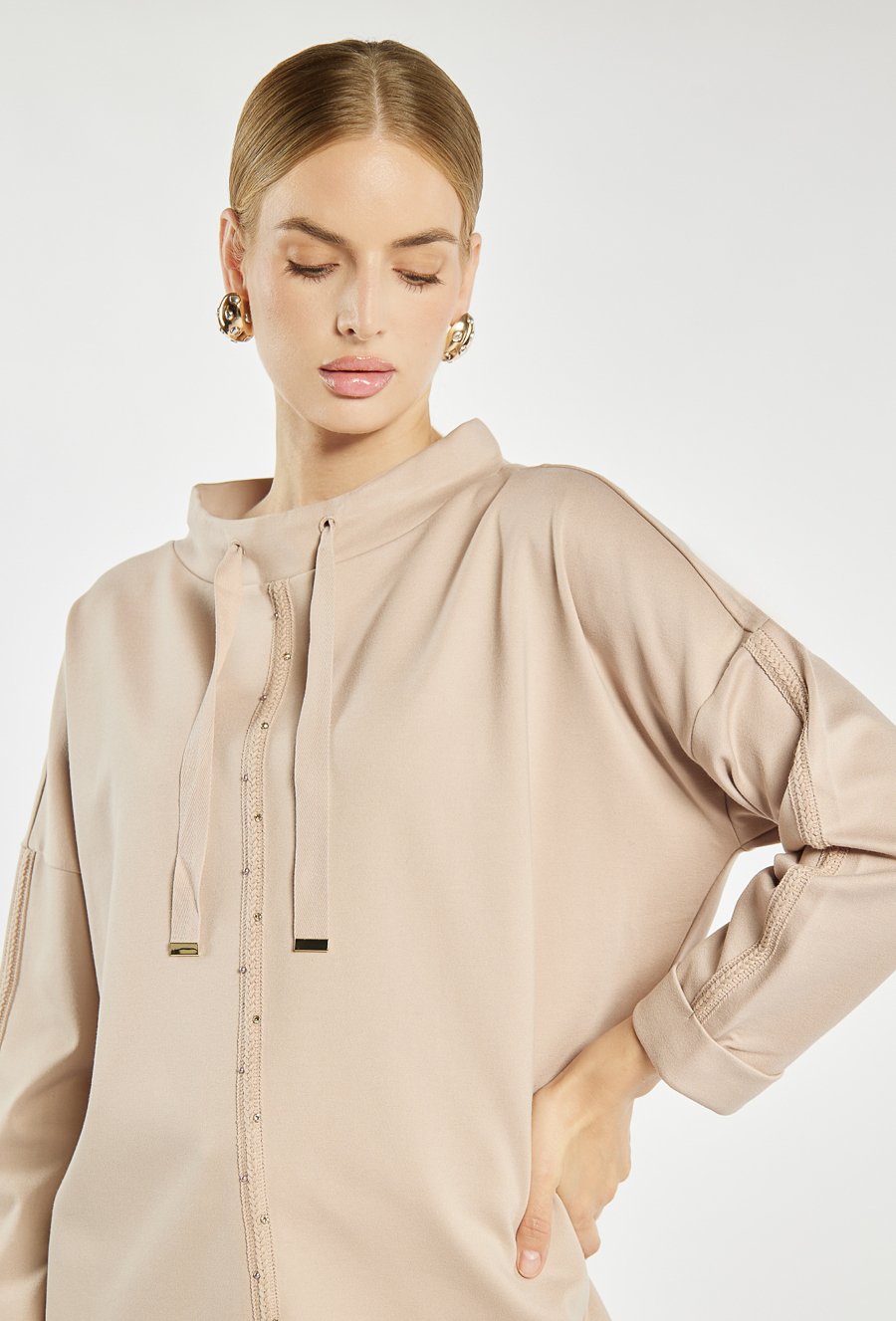Stylowa bluza damska o luźnym kroju. Model z wysokim kołnierzem i troczkami nadaje całości sportowo-eleganckiego charakteru. Rękawy zakończone ozdobnym przeszyciem i mankietem. Modelka na zdjęciu ma 177 cm wzrostu i prezentuje rozmiar S.