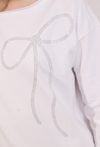 Stylowa bluza damska o luźnym kroju z długim rękawem. Model z okrągłym dekoltem oraz subtelnym zdobieniem w formie kokardy, które nadaje całości delikatnego, kobiecego charakteru. Bluza doskonale sprawdzi się w codziennych i casualowych stylizacjach, zapewniając komfort i wygodę noszenia. Modelka na zdjęciu ma 177 cm wzrostu i prezentuje rozmiar S.