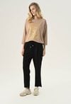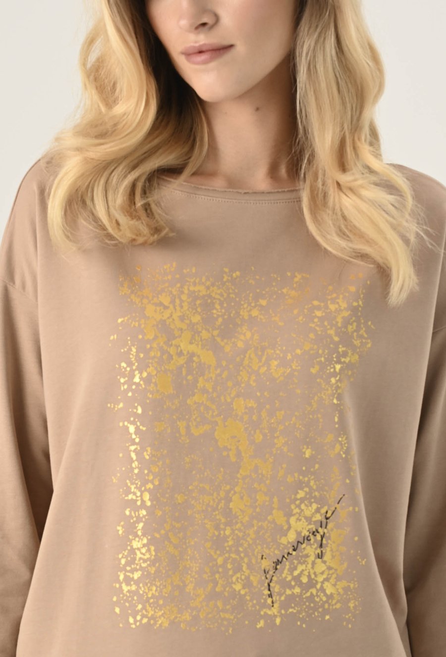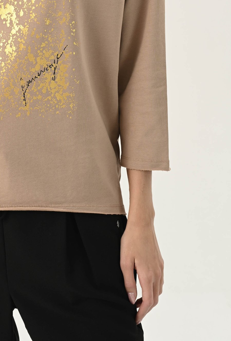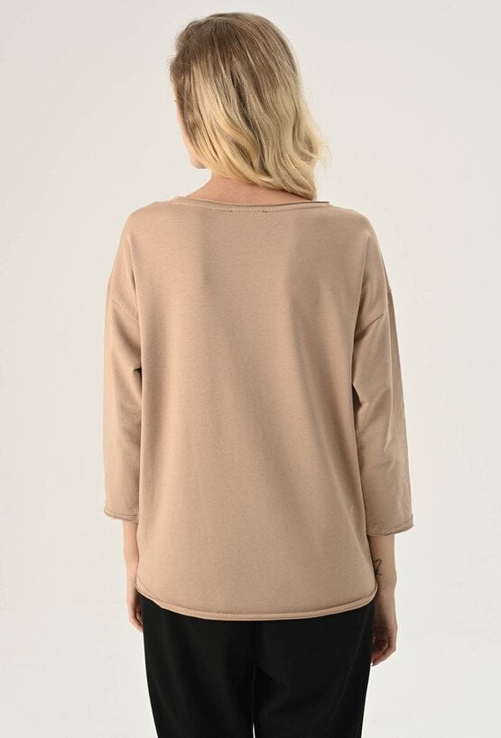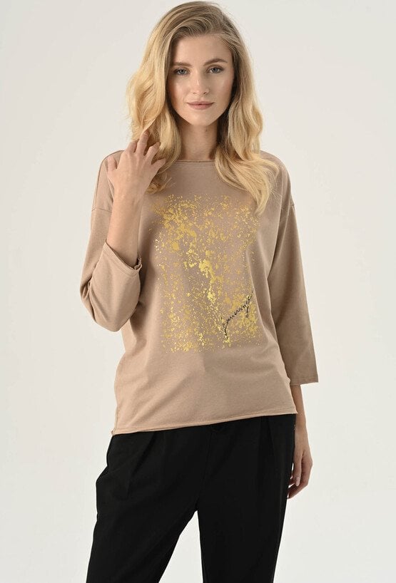 Bawełniana bluza o swobodnym kroju wykonana z miękkiej dzianiny, bawełny. Bluza posiada okrągły dekolt, rękawy o długości 3/4 z obniżoną linią ramion oraz surowe wykończeniem. Front bluzy zdobi złota aplikacja/ Modelka ma 177 cm wzrostu i prezentuje rozmiar S.