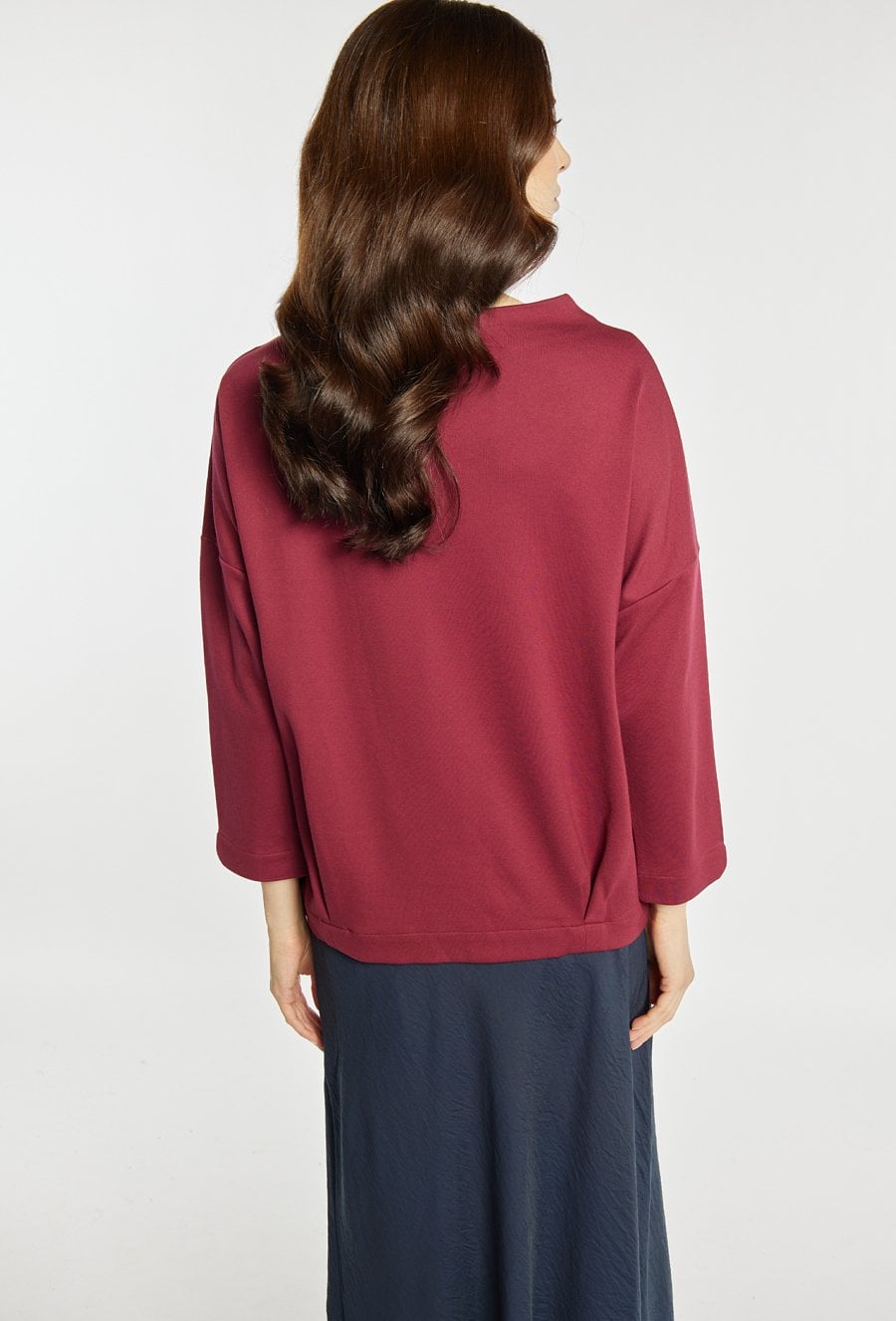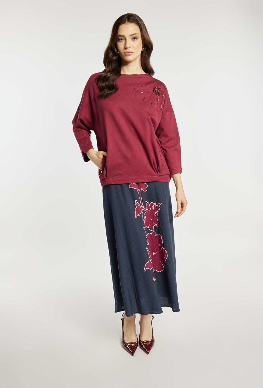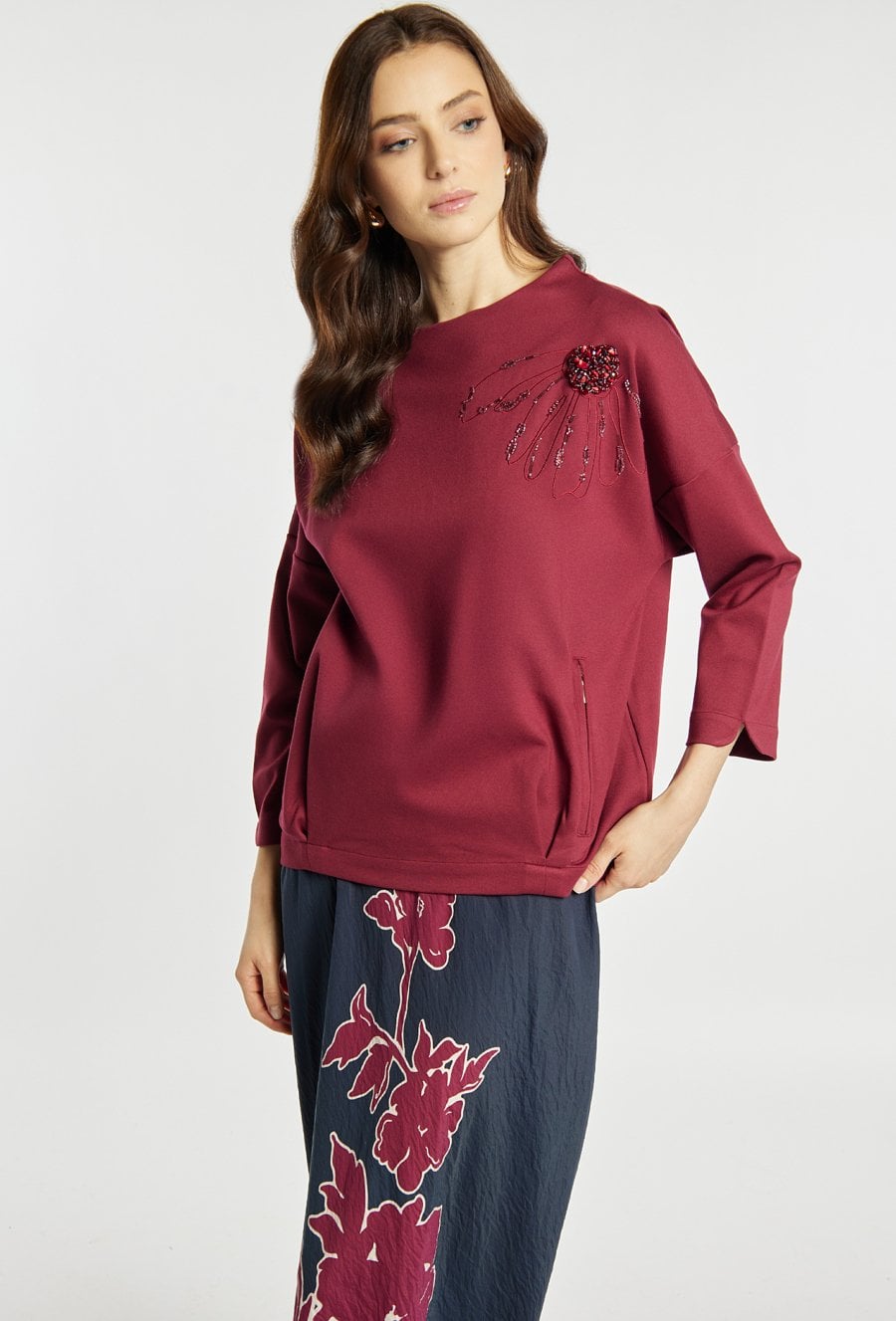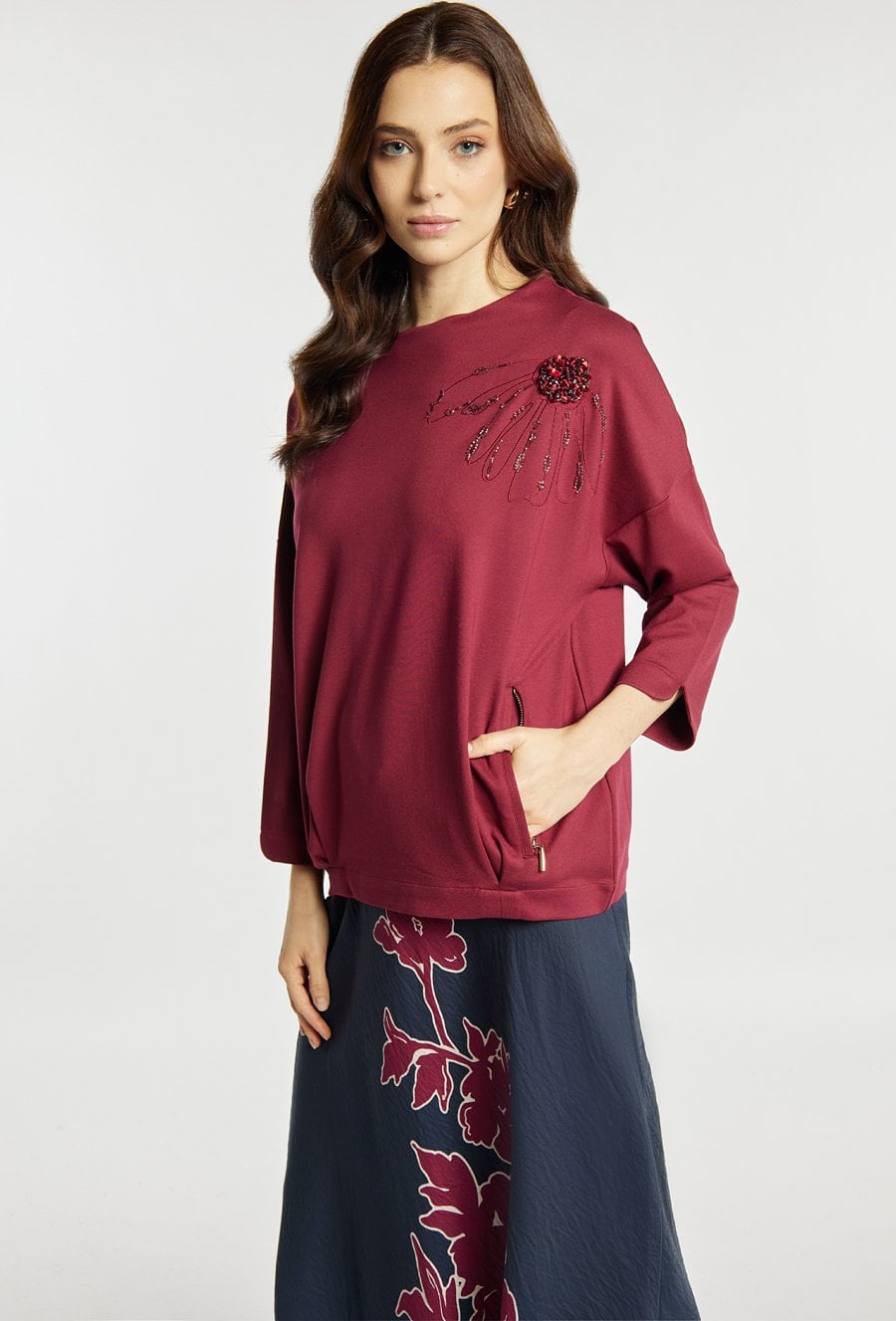 Bluza o prostym kroju w eleganckim bordowym kolorze. Bluza ma klasyczny, okrągły dekolt oraz rękawy o długości 3/4, co sprawia, że jest wygodna i uniwersalna. Ozdobą modelu jest efektowna aplikacja z koralików i haftu. Bluza sprawdzi się zarówno w codziennych stylizacjach, jak i w bardziej eleganckim zestawieniu, np. ze spódnicą lub klasycznymi spodniami. Modelka na zdjęciu ma 177 cm wzrostu i prezentuje rozmiar S.