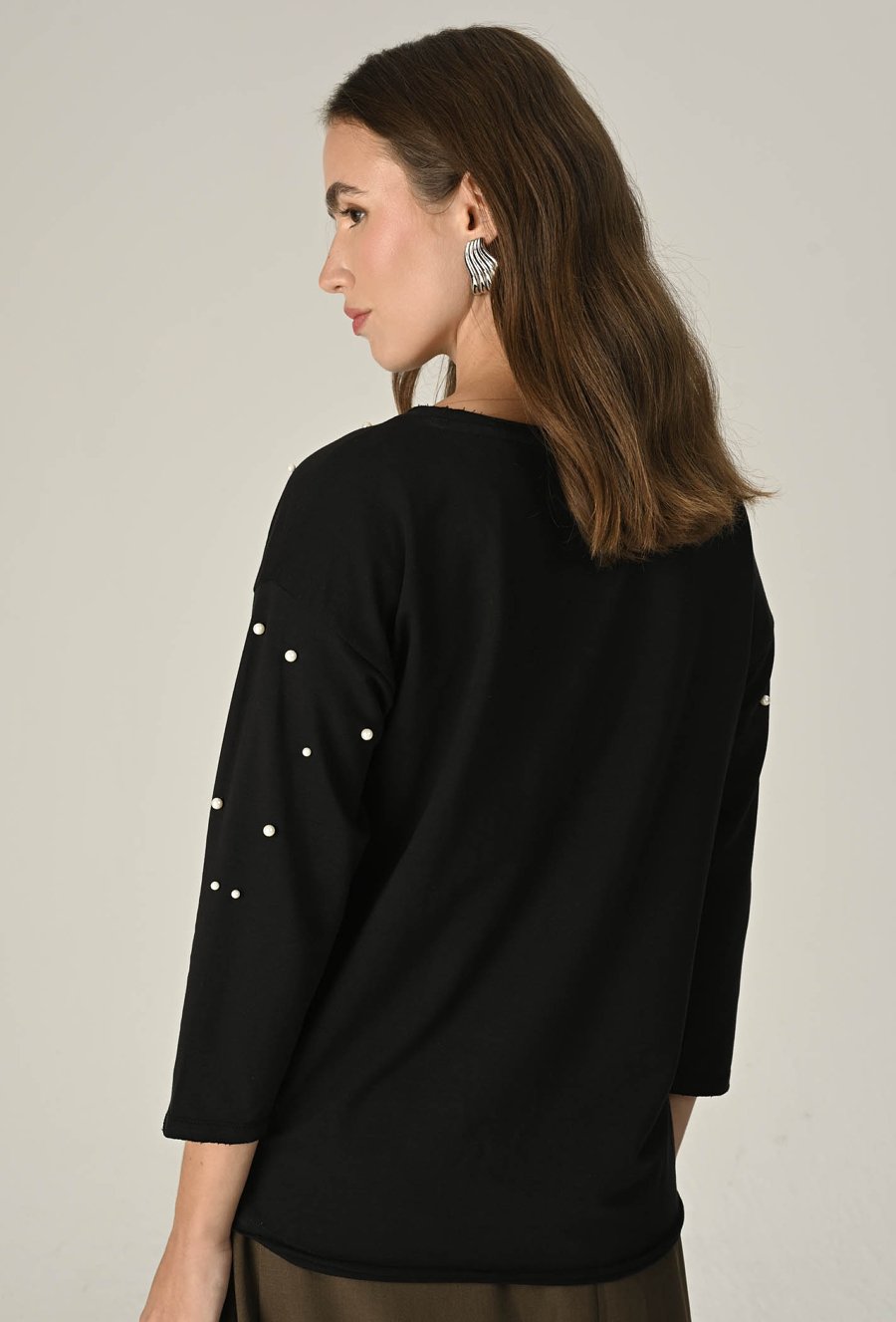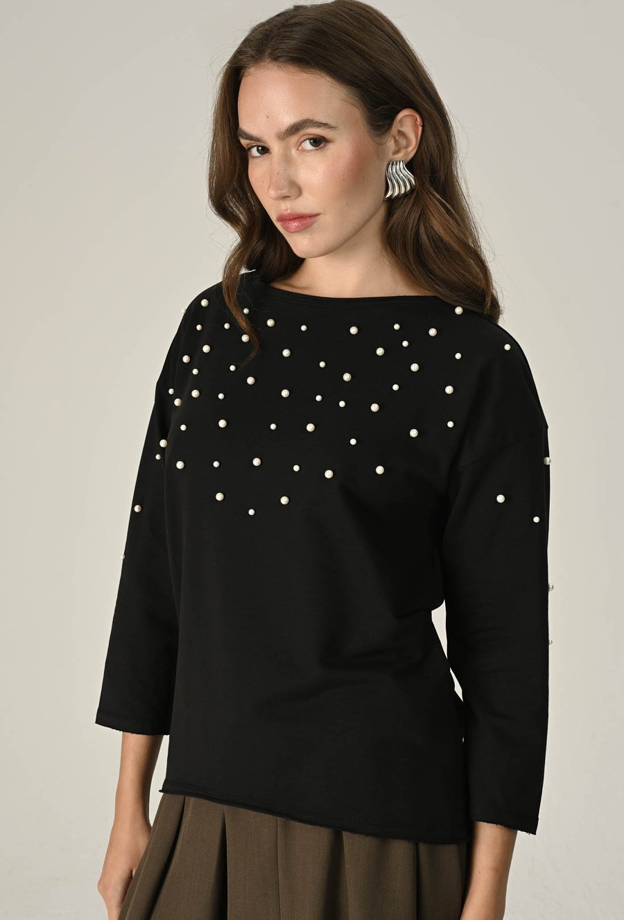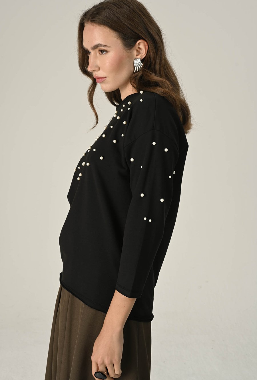 Bluza z miękkiej dzianiny o rękawie 3/4 to doskonałe połączenie wygody i stylu. Półokrągły dekolt subtelnie podkreśla szyję, a dekoracyjne perły na przodzie dodają wyjątkowego, kobiecego blasku. Idealna na co dzień oraz na specjalne okazje, gdy chcesz poczuć się wyjątkowo. Modelka na zdjęciu ma 174 cm wzrostu i prezentuje rozmiar 36.