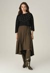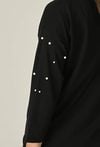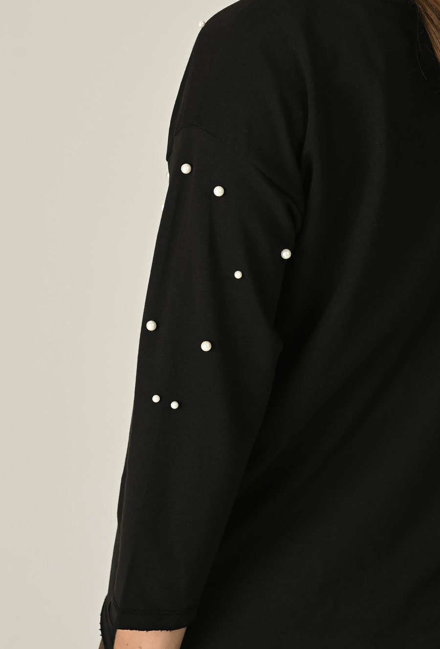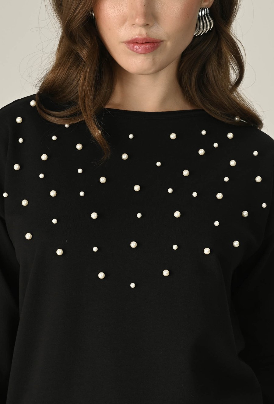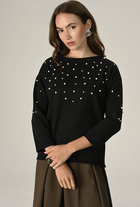 Bluza z miękkiej dzianiny o rękawie 3/4 to doskonałe połączenie wygody i stylu. Półokrągły dekolt subtelnie podkreśla szyję, a dekoracyjne perły na przodzie dodają wyjątkowego, kobiecego blasku. Idealna na co dzień oraz na specjalne okazje, gdy chcesz poczuć się wyjątkowo. Modelka na zdjęciu ma 174 cm wzrostu i prezentuje rozmiar 36.