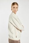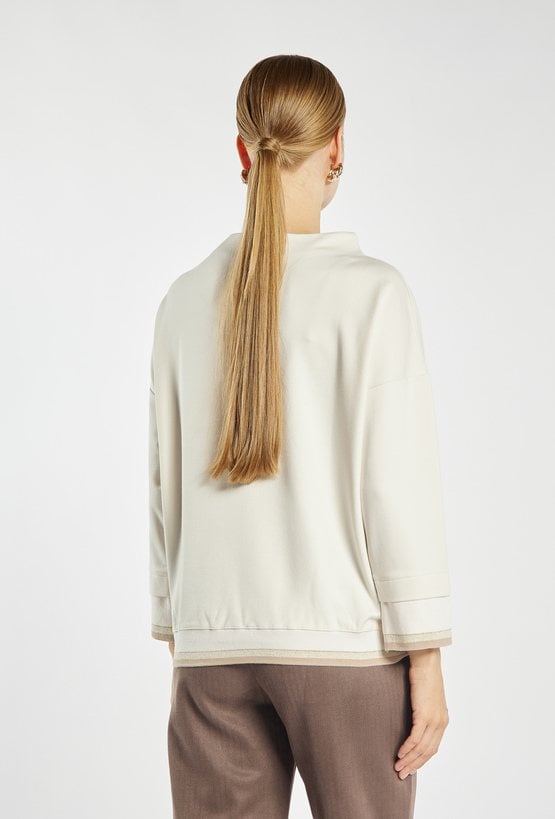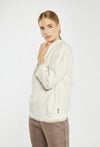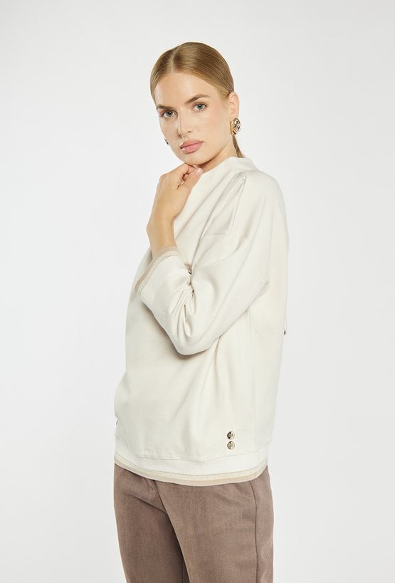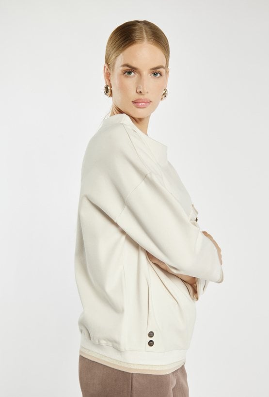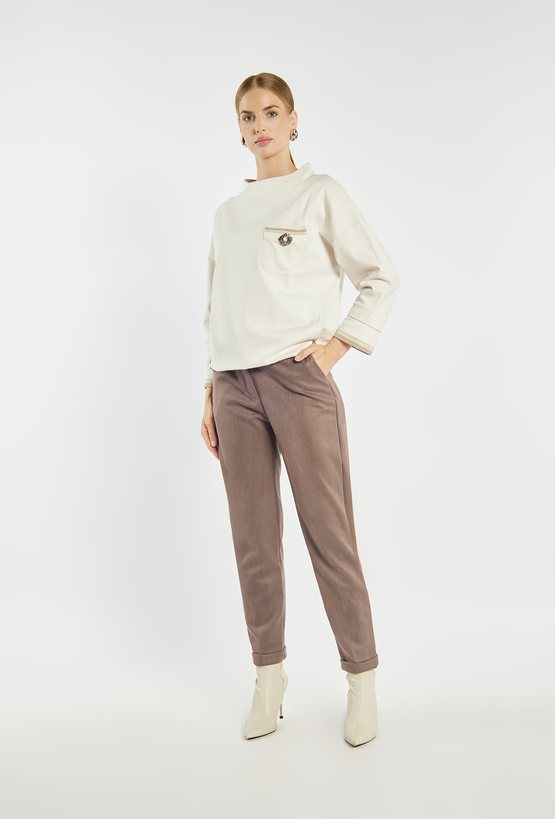 Elegancka bluza damska z ozdobną kieszenią na piersi. Model o luźnym, prostym kroju z subtelnie podniesionym kołnierzem i ozdobnymi wstawkami na rękawach. Bluza doskonale sprawdzi się zarówno w codziennych, jak i bardziej eleganckich stylizacjach. Modelka na zdjęciu ma 177 cm wzrostu i prezentuje rozmiar S.