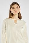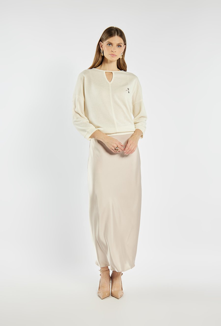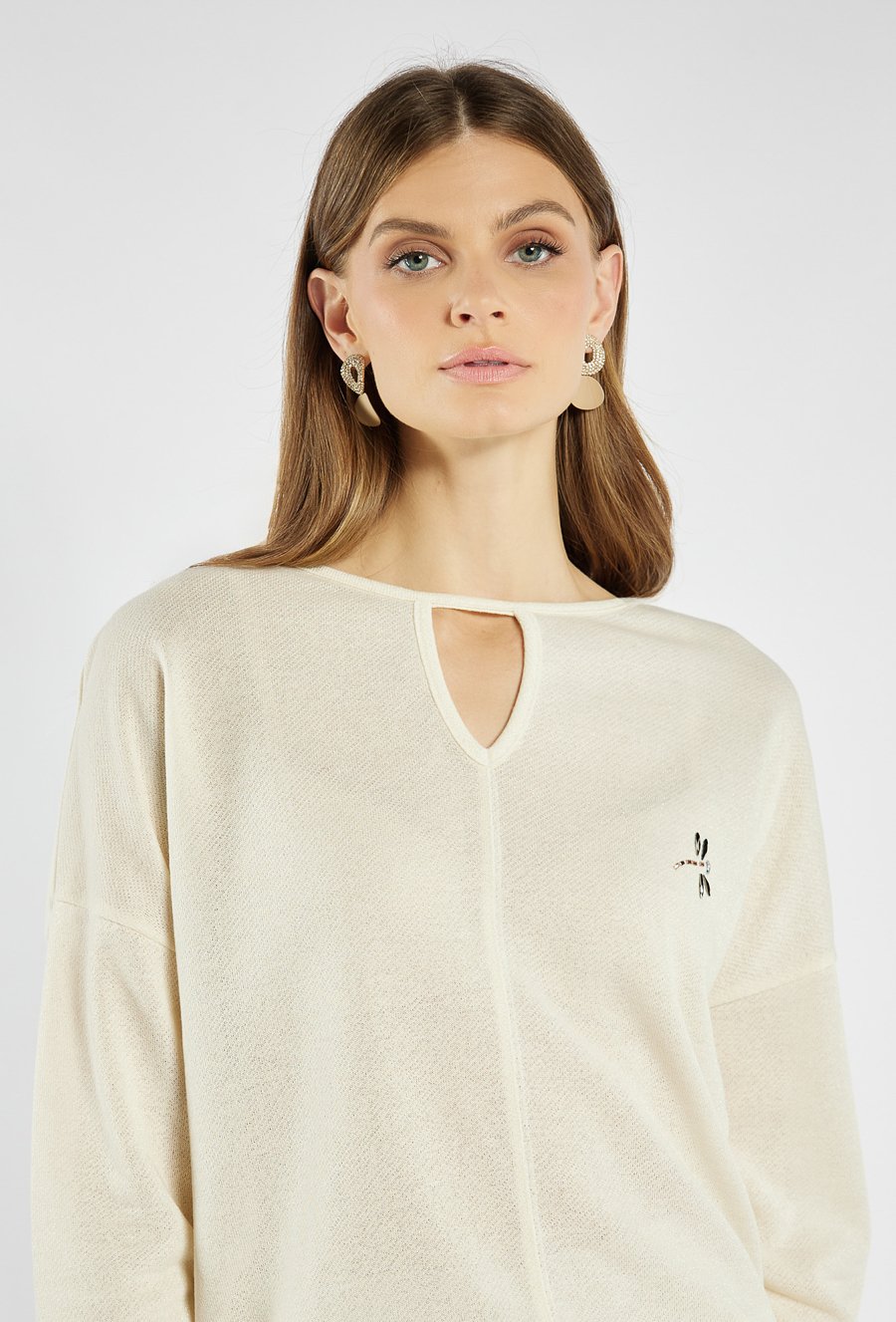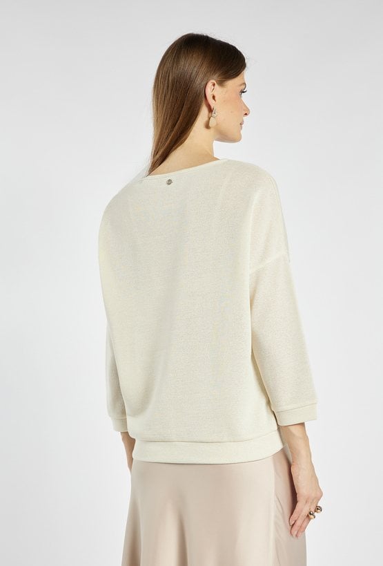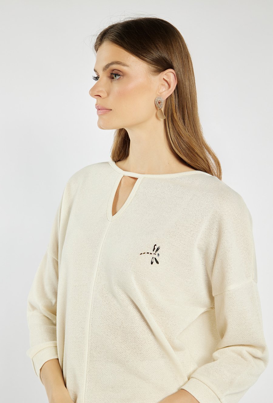 Bluza damska o eleganckim, kobiecym kroju z subtelnym połyskiem. Delikatne rozcięcie przy dekolcie nadaje jej lekkości, a ozdobny detal w postaci małego motywu ważki dodaje szyku. Idealna propozycja na świąteczne spotkania, kolację w gronie bliskich czy stylowy, zimowy dzień. Modelka na zdjęciu ma 177 cm wzrostu i prezentuje rozmiar S.