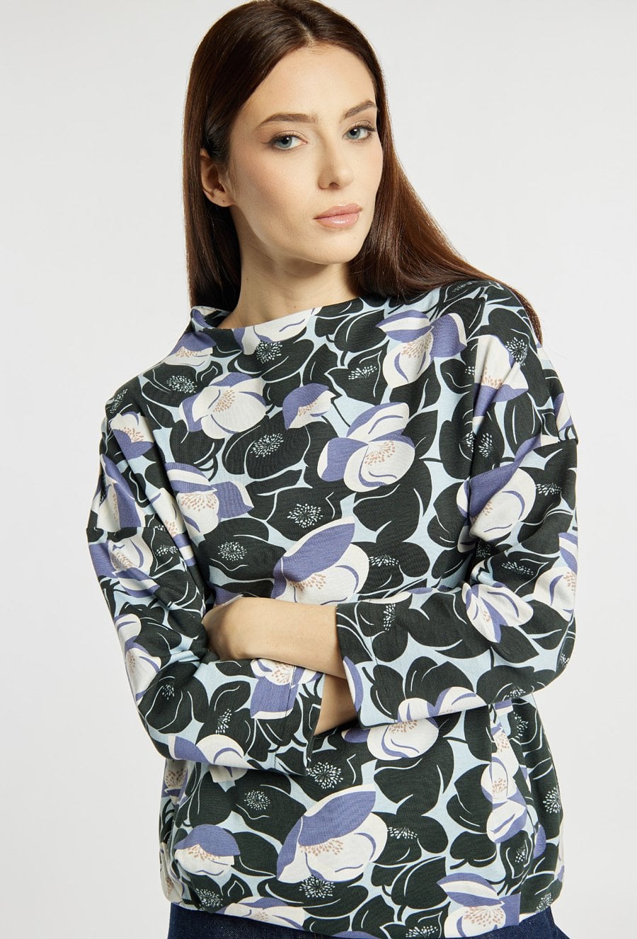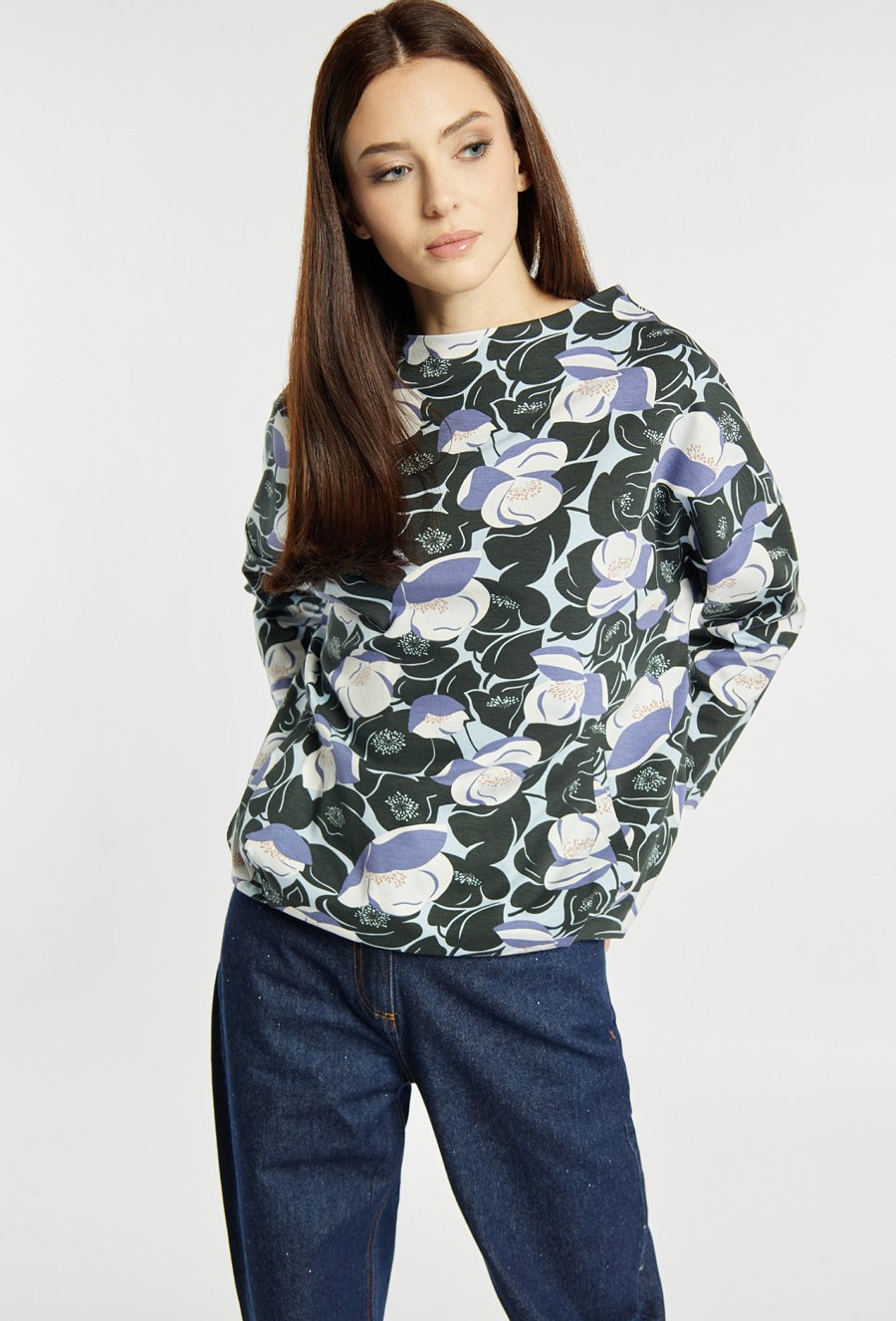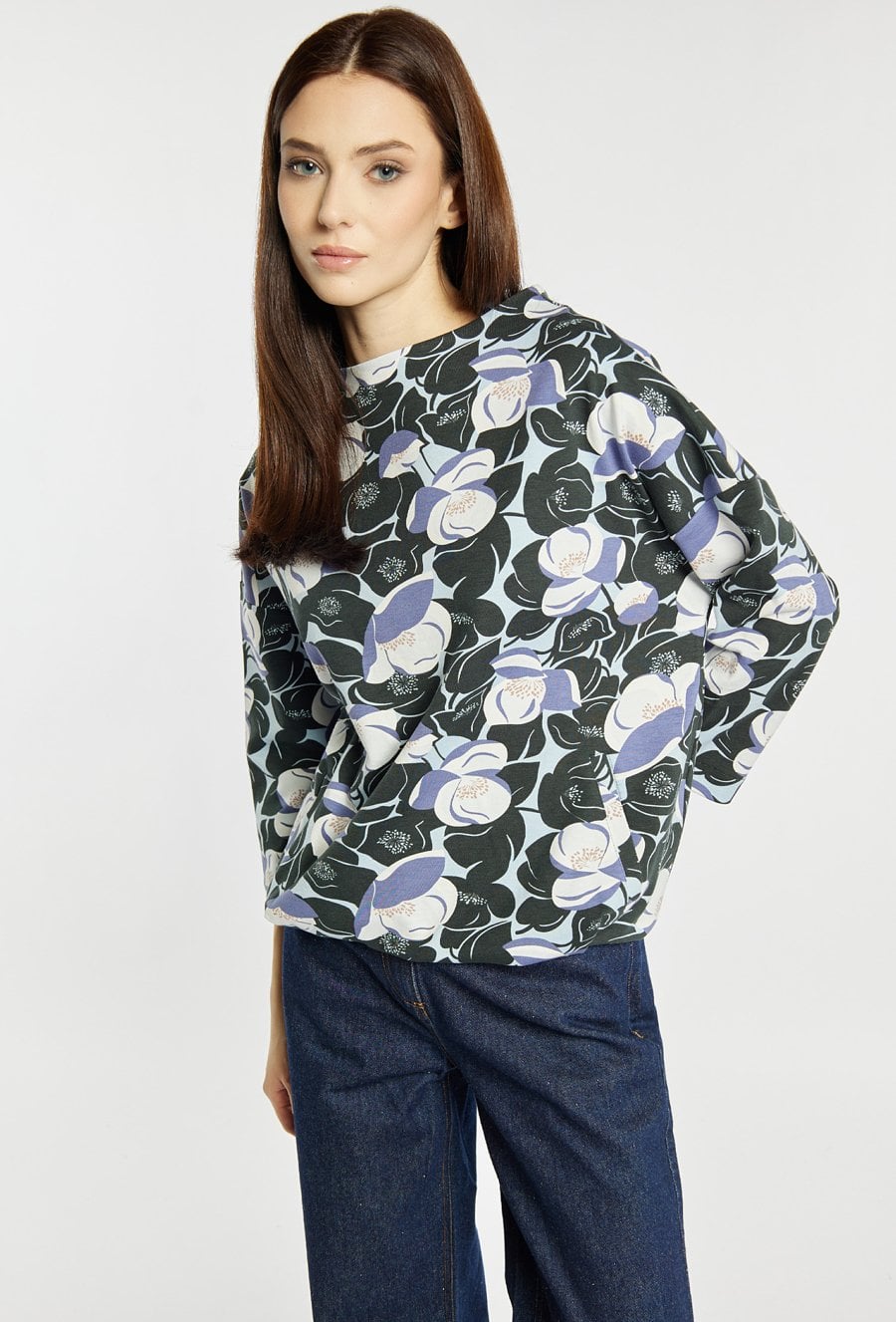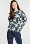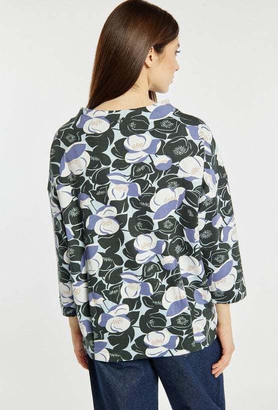 Bluza damska o swobodnym kroju z wyrazistym, kwiatowym printem na całej powierzchni. Bluza ma długie rękawy oraz klasyczny, okrągły dekolt, a miękki materiał zapewnia wysoki komfort noszenia. Model ten świetnie sprawdzi się w codziennych stylizacjach, dodając im oryginalnego charakteru. Modelka na zdjęciu ma 177 cm wzrostu i prezentuje rozmiar S.