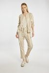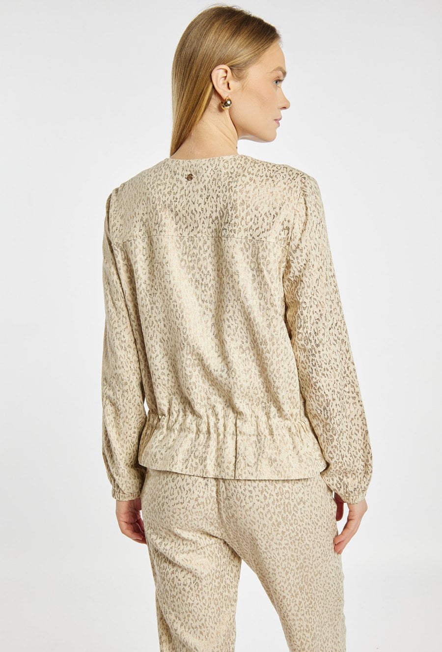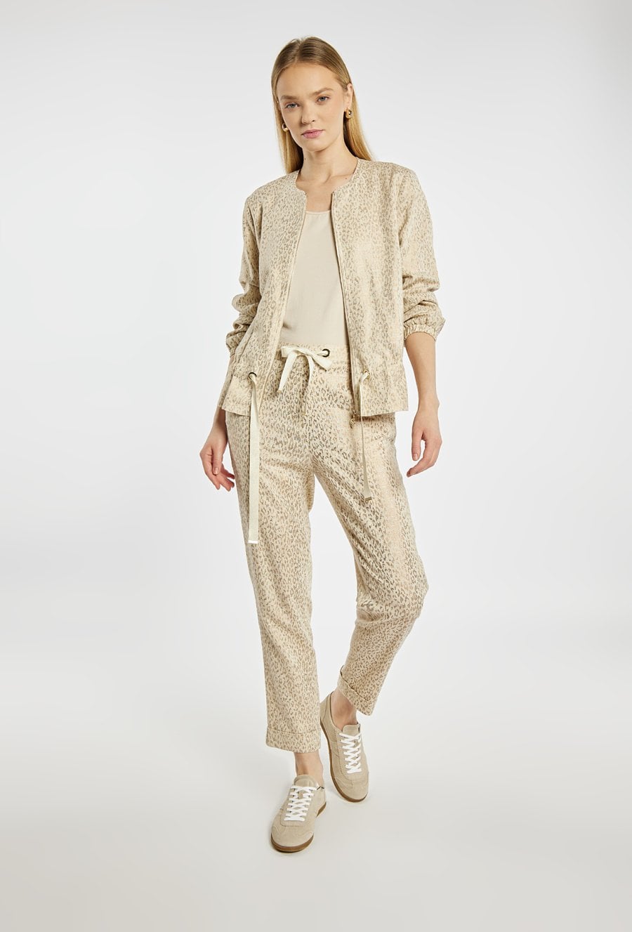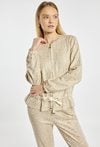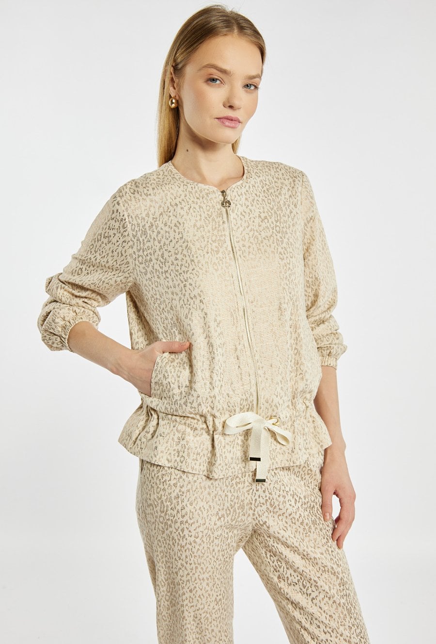 Bluza damska o swobodnym, komfortowym fasonie. Model zapinany na zamek, z okrągłym dekoltem oraz długimi rękawami zakończonymi elastycznym ściągaczem. W talii znajduje się regulowane wiązanie, które pozwala dopasować fason do sylwetki. Idealna do codziennych stylizacji. Można ją zestawić z pasującymi spodniami, tworząc wygodny i spójny komplet. Kod do spodni: 26W-TRU1040. Modelka na zdjęciu ma 177 cm wzrostu i prezentuje rozmiar 36.
