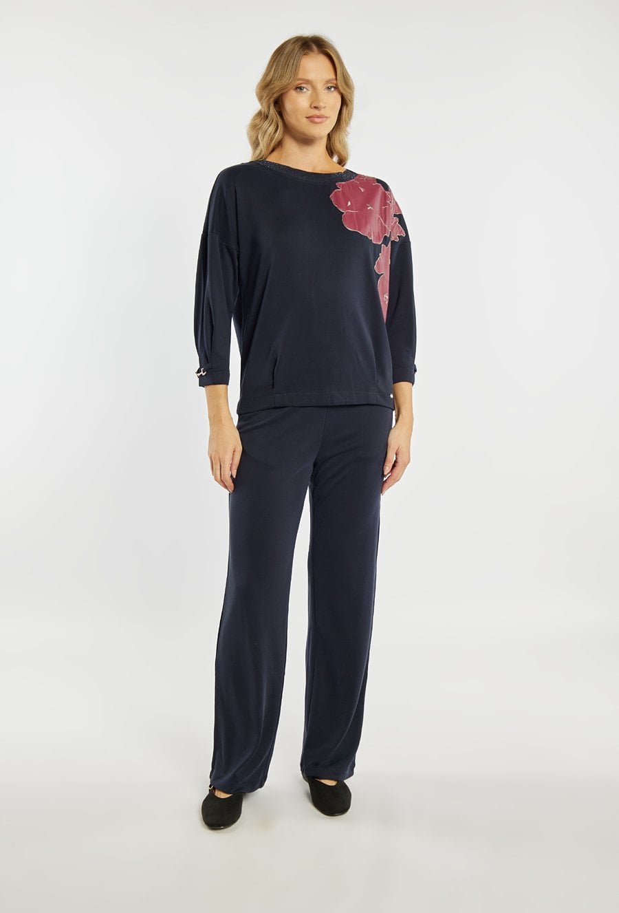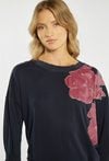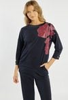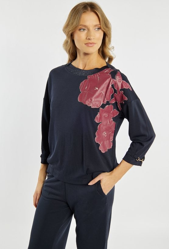 Bluza damska o luźnym, komfortowym kroju. Model z długim rękawem oraz klasycznym, półokrągłym dekoltem. Przód zdobi efektowna aplikacja z motywem roślinnym, która nadaje całości nowoczesnego i stylowego charakteru. Polecamy zestawić z pasującym dołem. Kod do spodni: 26W-TRU0540. Modelka na zdjęciu ma 177 cm wzrostu i prezentuje rozmiar S.