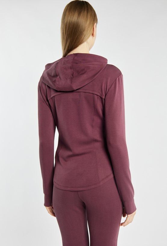 Damska bluza z kolekcji JOY&RELAX. Model zapinany na suwak, z praktycznym kapturem i dekoracyjnymi przeszyciami, które podkreślają sylwetkę. Idealna zarówno do kompletu ze spodniami z tej samej kolekcji, jak i do codziennych, luźnych stylizacji. Kod do spodni: 25J-TRU3790. Modelka na zdjęciu ma 177 cm wzrostu i prezentuje rozmiar S/M.