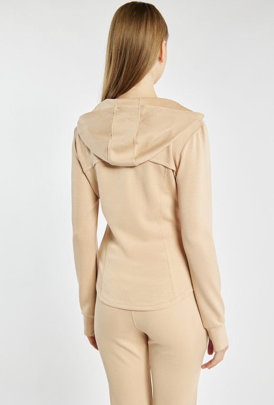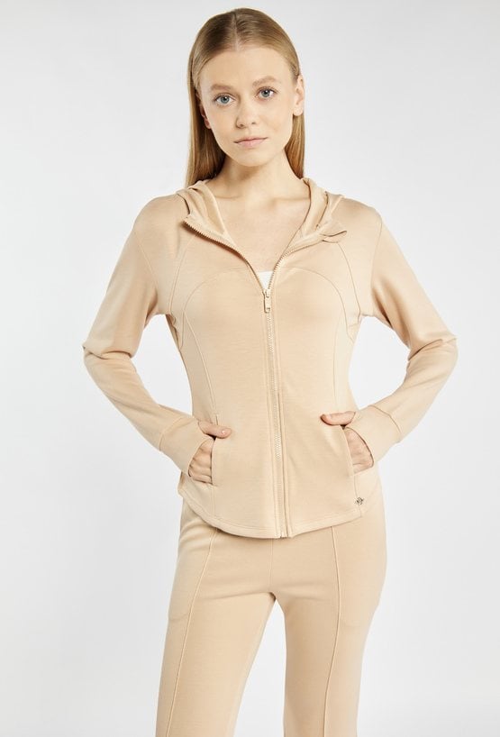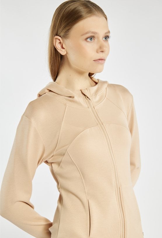 Damska bluza z kolekcji JOY&RELAX. Model zapinany na suwak, z praktycznym kapturem i dekoracyjnymi przeszyciami, które podkreślają sylwetkę. Idealna zarówno do kompletu ze spodniami z tej samej kolekcji, jak i do codziennych, luźnych stylizacji. Kod do spodni: 25J-TRU3790. Modelka na zdjęciu ma 177 cm wzrostu i prezentuje rozmiar S/M.