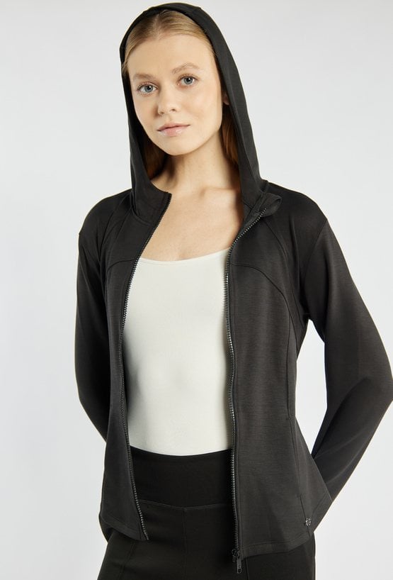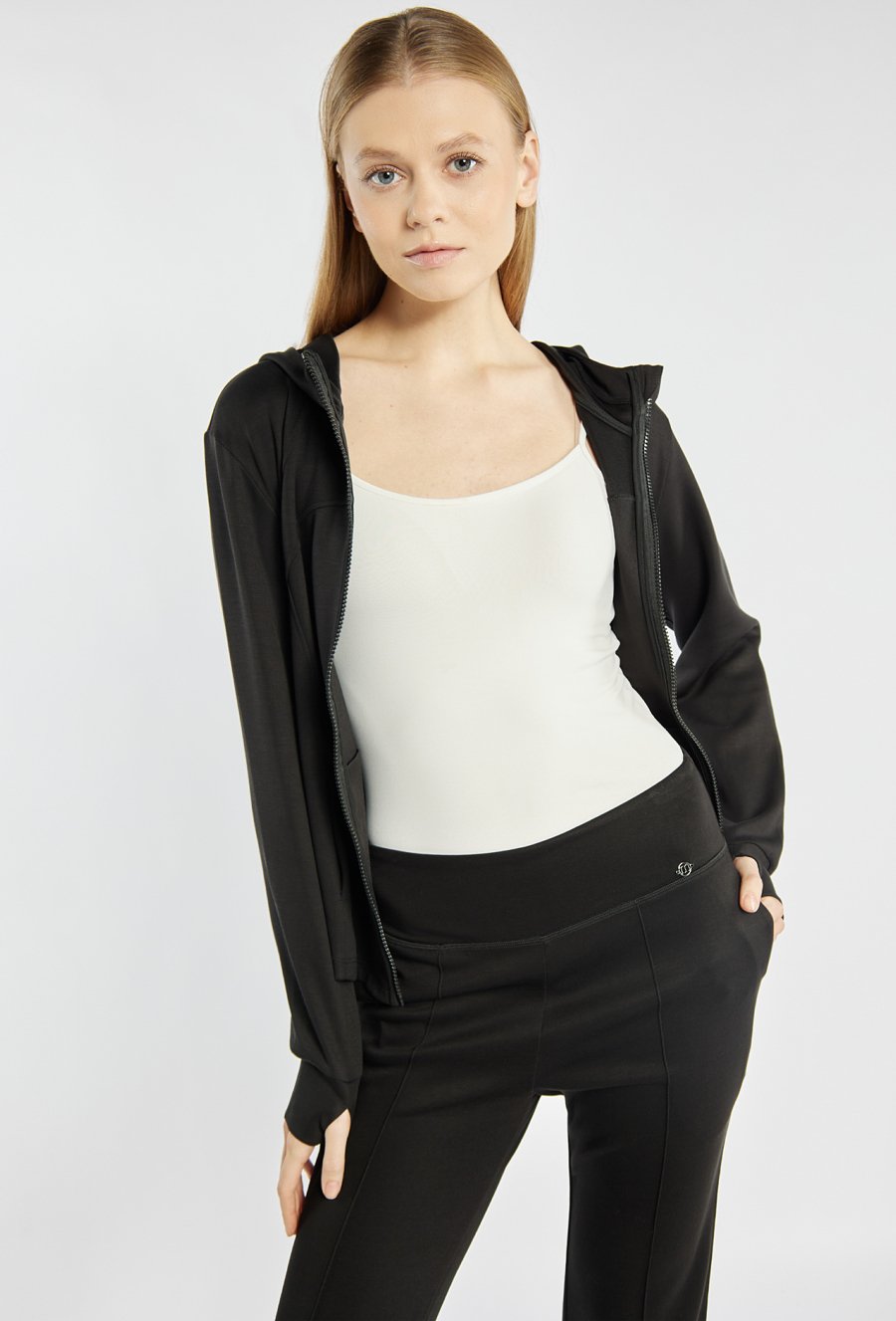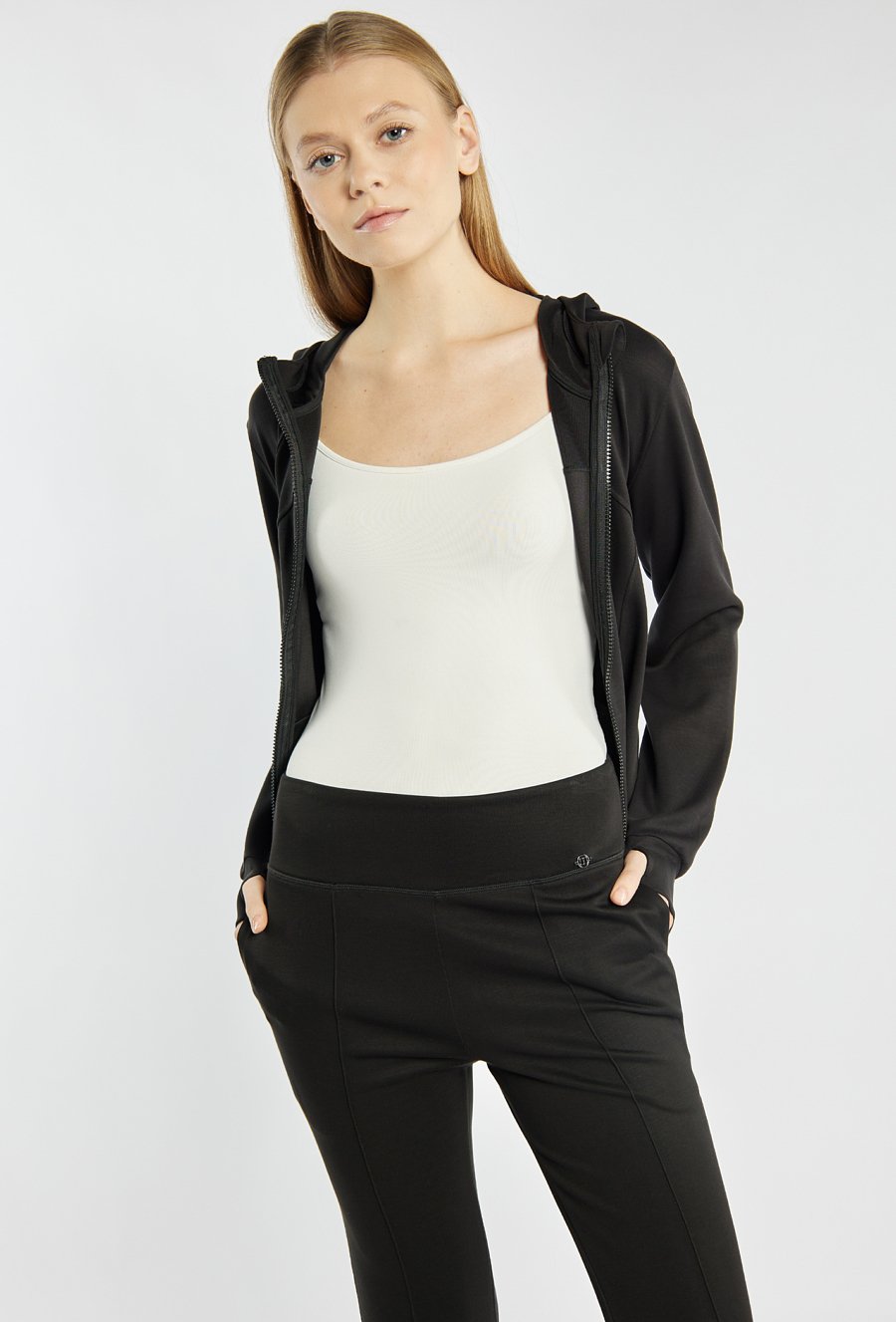 Damska bluza z kolekcji JOY&RELAX. Model zapinany na suwak, z praktycznym kapturem i dekoracyjnymi przeszyciami, które podkreślają sylwetkę. Idealna zarówno do kompletu ze spodniami z tej samej kolekcji, jak i do codziennych, luźnych stylizacji. Kod do spodni: 25J-TRU3790. Modelka na zdjęciu ma 177 cm wzrostu i prezentuje rozmiar S/M.