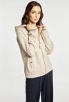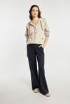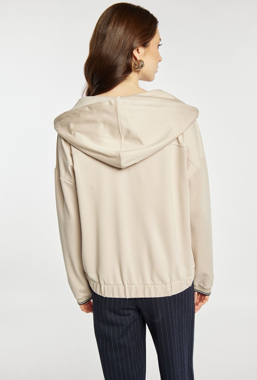 Bluza z kapturem, zapinana na zamek, wykończona jest dekoracyjnymi troczkami i praktycznymi kieszeniami. Model świetnie sprawdzi się w codziennych stylizacjach, także w zestawie ze spodniami o sportowym lub casualowym charakterze. Modelka na zdjęciu ma 177 cm wzrostu i prezentuje rozmiar 36.