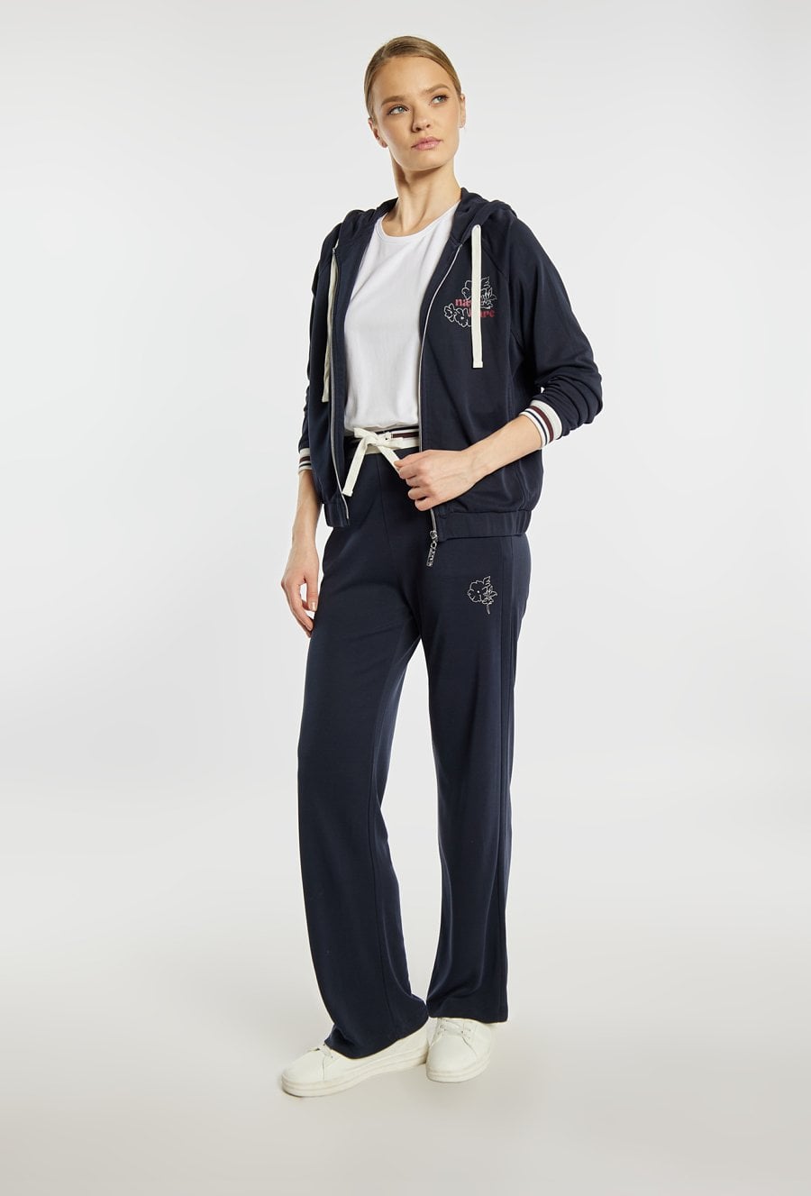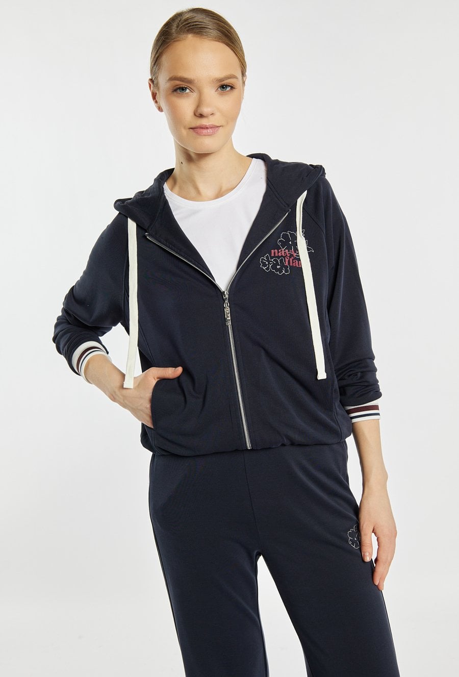 Bluza damska o sportowym, swobodnym kroju. Model z kapturem oraz zapięciem na zamek, które zapewnia wygodę noszenia. Kontrastowe troczki i ściągacze przy rękawach nadają całości dynamicznego charakteru, a subtelny nadruk na piersi podkreśla jej casualowy styl. Modelka na zdjęciu ma 177 cm wzrostu i prezentuje rozmiar S. Polecamy zestawić z pasującymi spodniami: 26W-TRU0550.