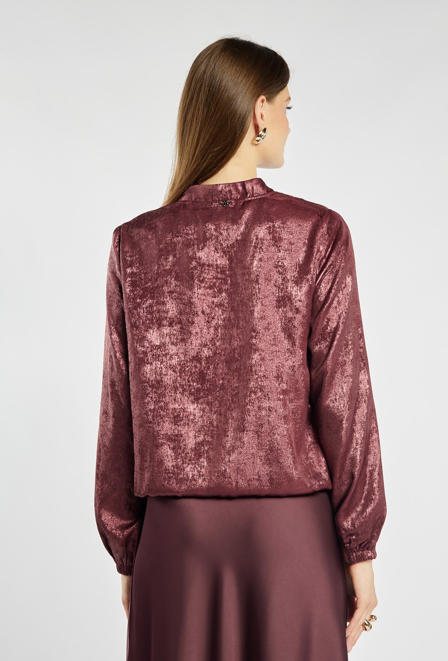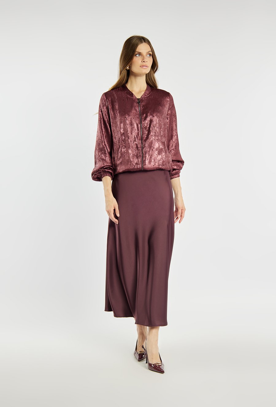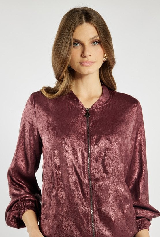Bluza damska o wyjątkowym, połyskującym wykończeniu, które nadaje jej eleganckiego charakteru. Model zapinany na suwak, z delikatnym ściągaczem u dołu i przy mankietach. Bluza świetnie sprawdzi się zarówno w codziennych stylizacjach, jak i jako efektowny element zestawu na święta lub sylwestrowy wieczór. Modelka na zdjęciu ma 177 cm wzrostu i prezentuje rozmiar 36.