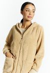 Bluza damska wykonana z misiowego materiału Bluza z kapturem, długimi rękawami oraz naszytymi kieszeniami. Bluzę zdobi logo marki Monnari oraz połyskujące wykończenie. Model ten idealnie sprawdzi się w chłodniejsze dni lub wieczory. Modelka na zdjęciu ma 177 cm wzrostu i prezentuje rozmiar 36.