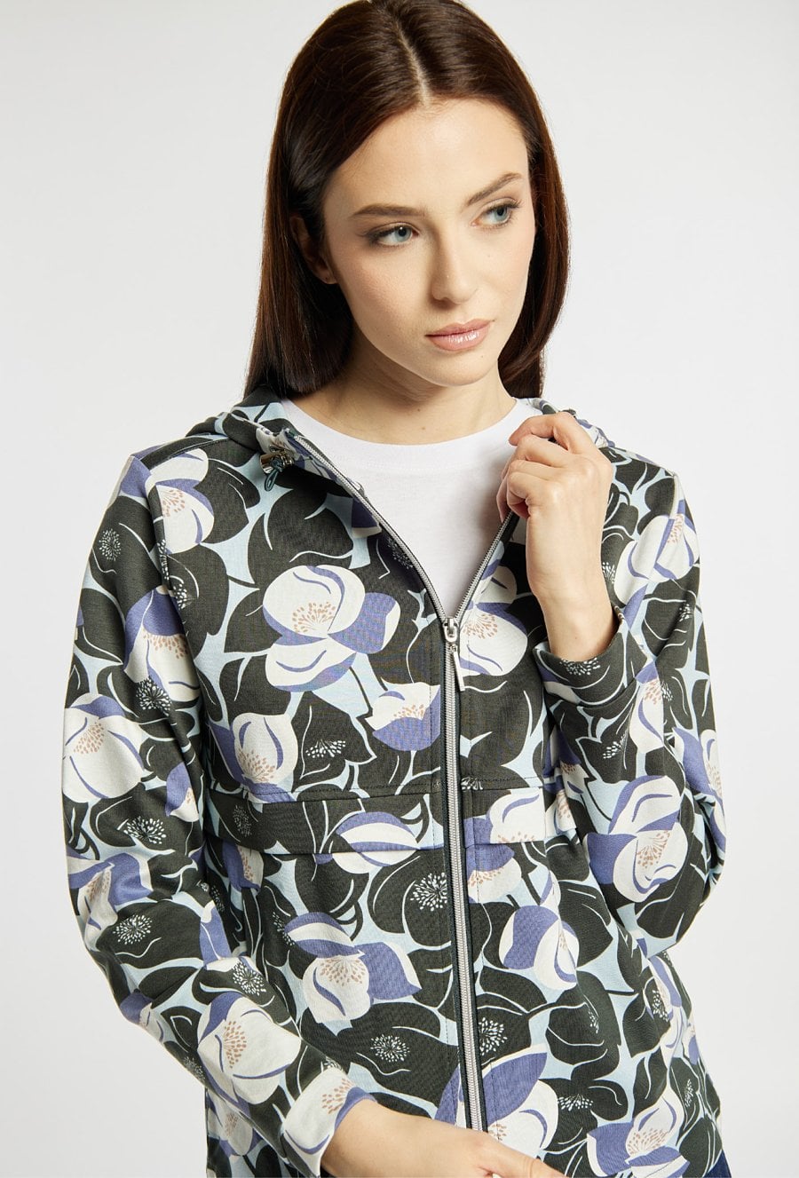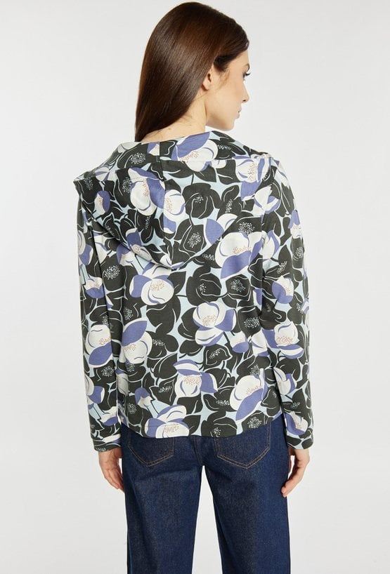 Bluza damska o swobodnym kroju z efektownym wzorem na całej powierzchni. Bluza ma długie rękawy, praktyczny kaptur oraz zapięcie na zamek, które zapewnia wygodę noszenia. Bluza świetnie sprawdzi się w codziennych stylizacjach, dodając im lekkości i nowoczesnego charakteru. Modelka na zdjęciu ma 177 cm wzrostu i prezentuje rozmiar S.