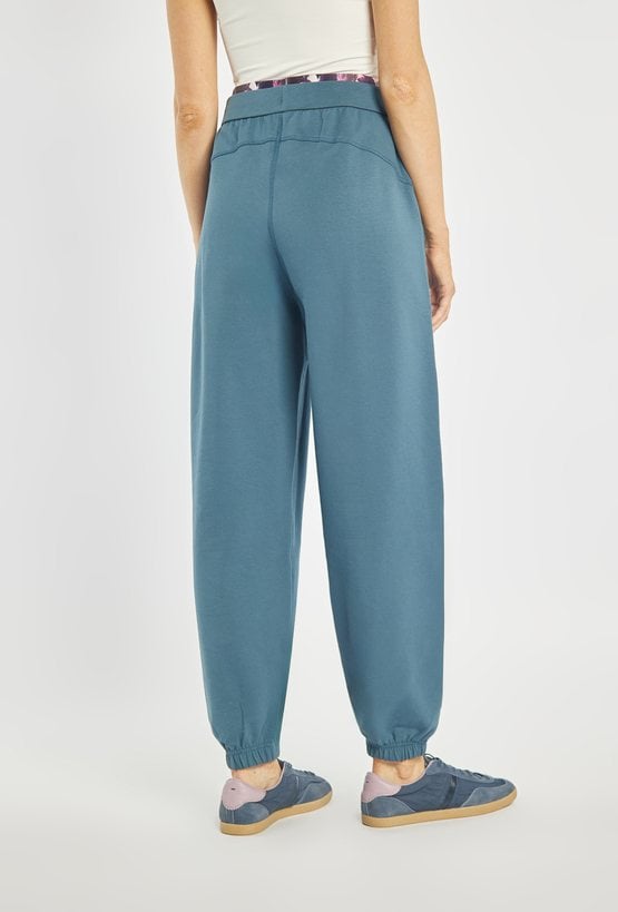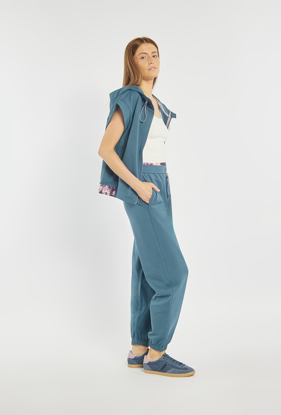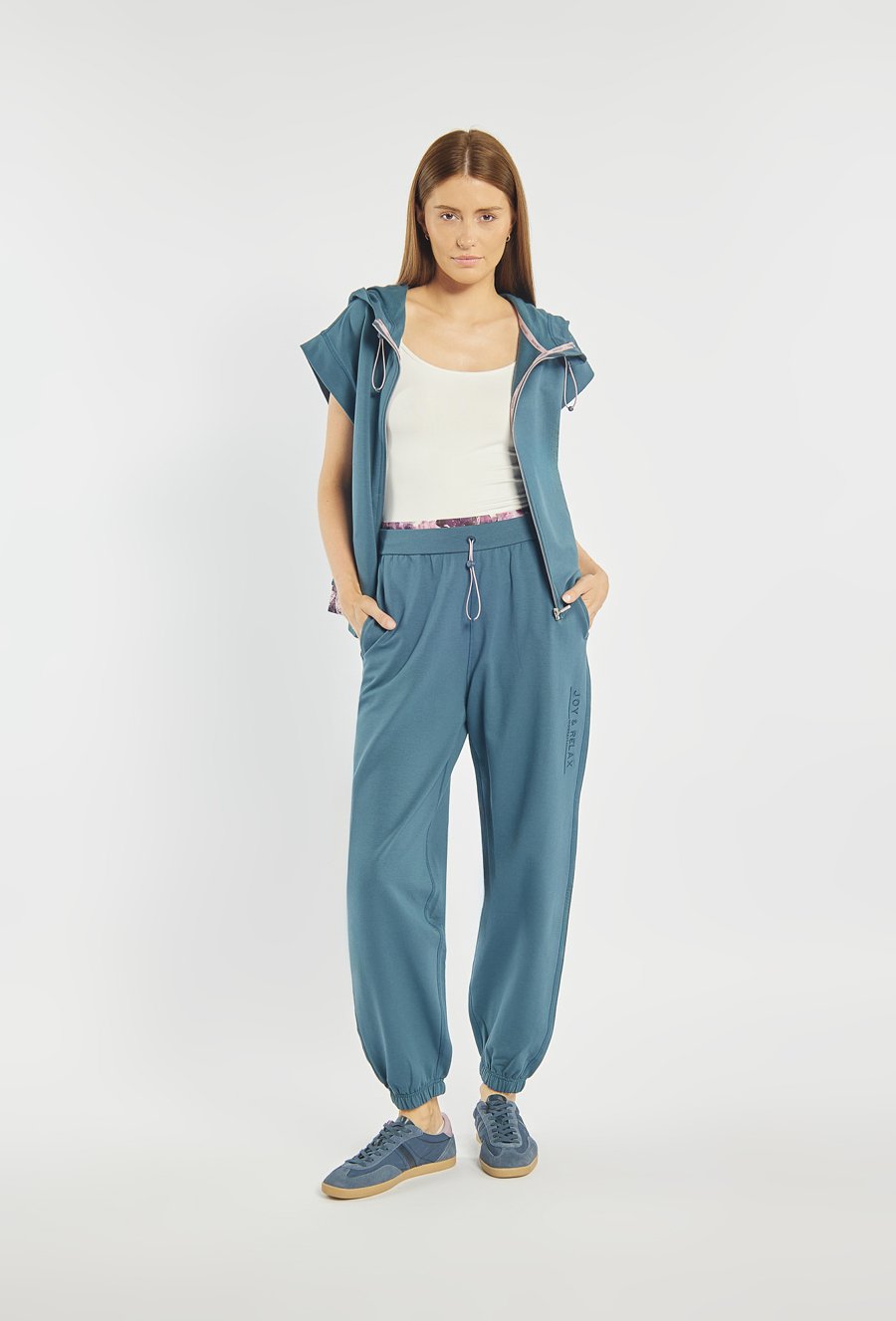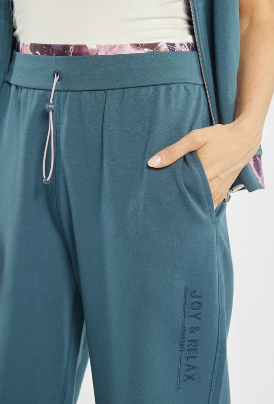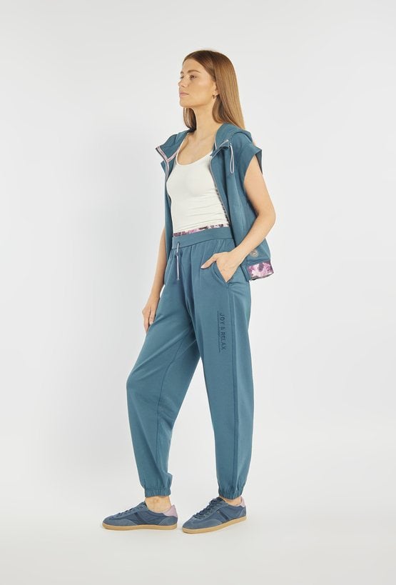 Spodnie dresowe z kolekcji Joy&Relax. Model o komfortowym, lekko zwężanym kroju zakończonym elastycznym ściągaczem przy nogawkach. W pasie znajduje się wygodna guma ze sznurkiem regulacyjnym, a po bokach umieszczono praktyczne kieszenie. Na jednej z nogawek subtelny nadruk z logo kolekcji. Idealne do codziennych, sportowych stylizacji. Modelka na zdjęciu ma 177 cm wzrostu i prezentuje rozmiar S.