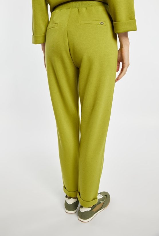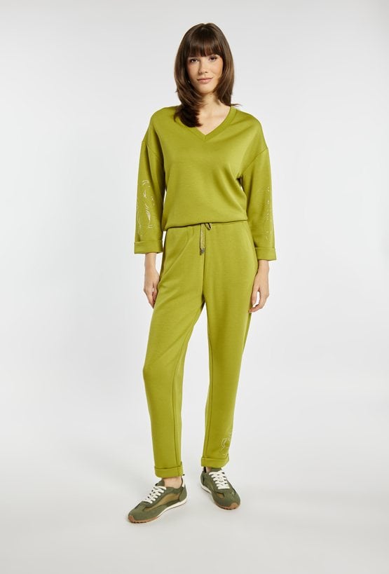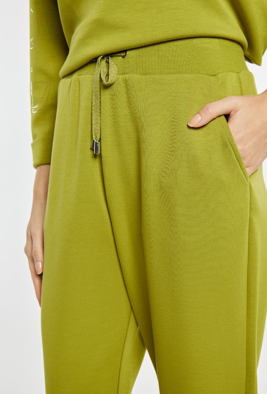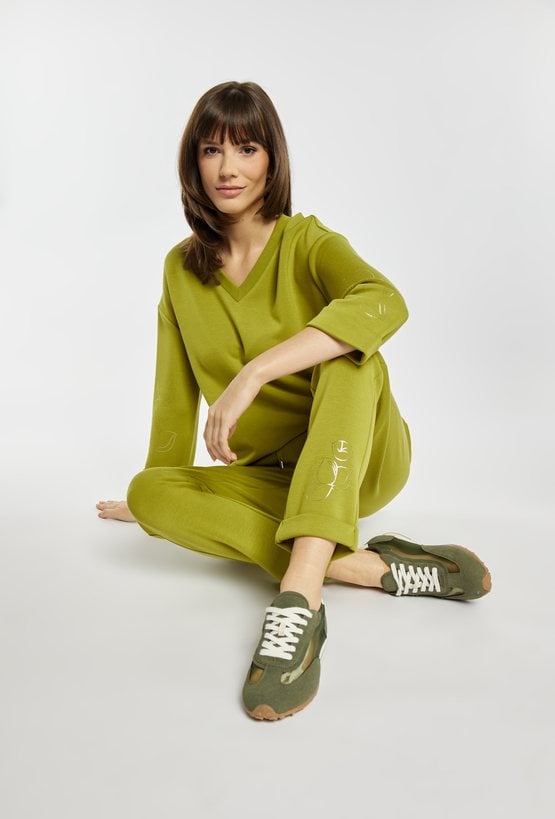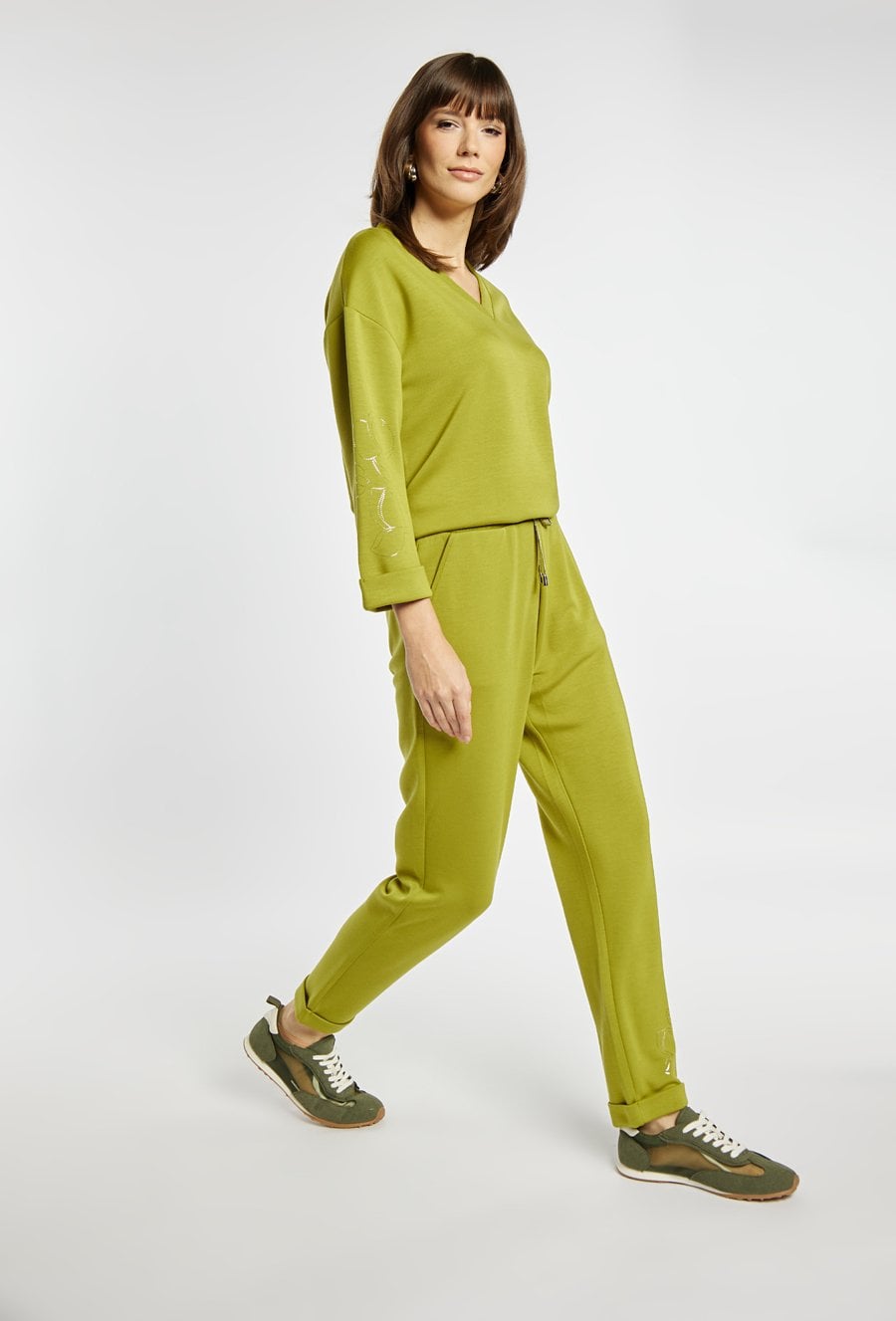 Spodnie o wygodnym kroju to idealny wybór na co dzień. Spodnie z elastyczną talią i troczkiem zapewniają komfort noszenia, a miękki, przyjemny w dotyku materiał gwarantuje swobodę ruchów. Subtelna aplikacja przy nogawce dodaje im oryginalnego charakteru. Doskonale prezentują się w zestawie z pasującą bluzą, tworząc spójną, stylową całość. Kod do bluzy 26W-JUM0090. Modelka na zdjęciu ma 177 cm wzrostu i prezentuje rozmiar S.