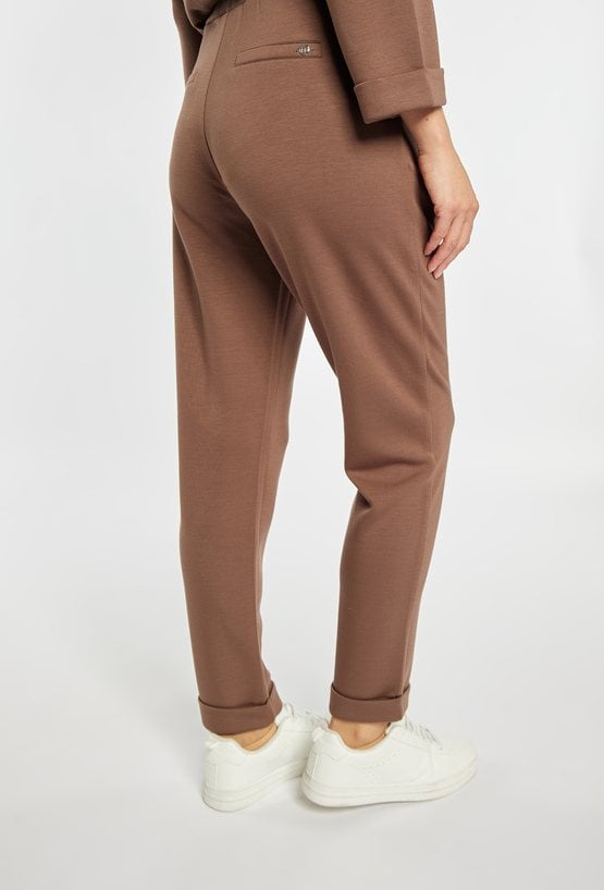Spodnie o wygodnym kroju to idealny wybór na co dzień. Spodnie z elastyczną talią i troczkiem zapewniają komfort noszenia, a miękki, przyjemny w dotyku materiał gwarantuje swobodę ruchów. Subtelna aplikacja przy nogawce dodaje im oryginalnego charakteru. Doskonale prezentują się w zestawie z pasującą bluzą, tworząc spójną, stylową całość. Kod do bluzy 26W-JUM0090. Modelka na zdjęciu ma 177 cm wzrostu i prezentuje rozmiar S.