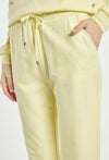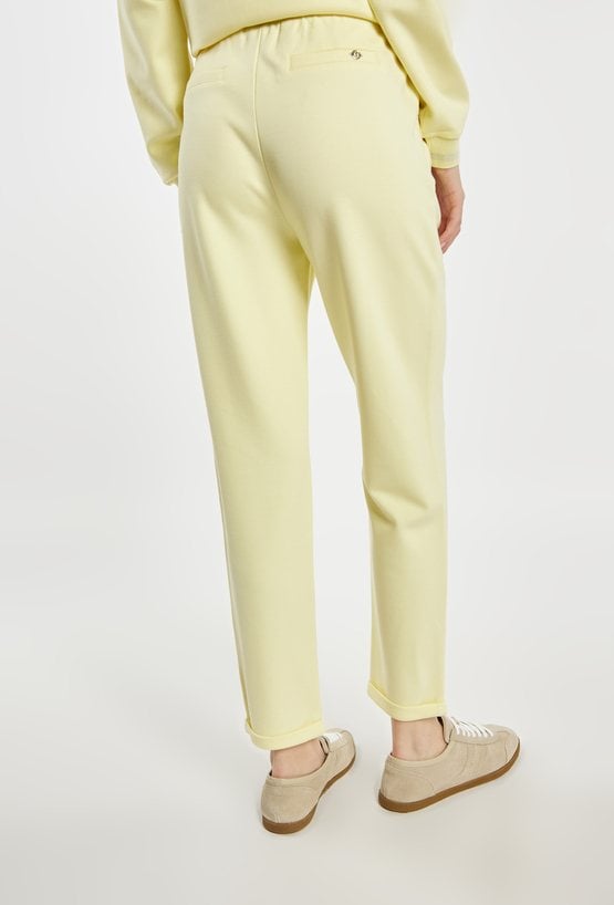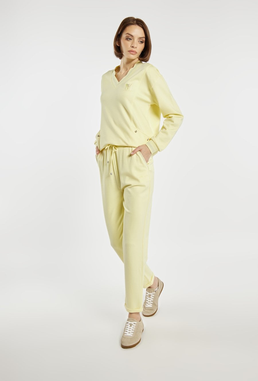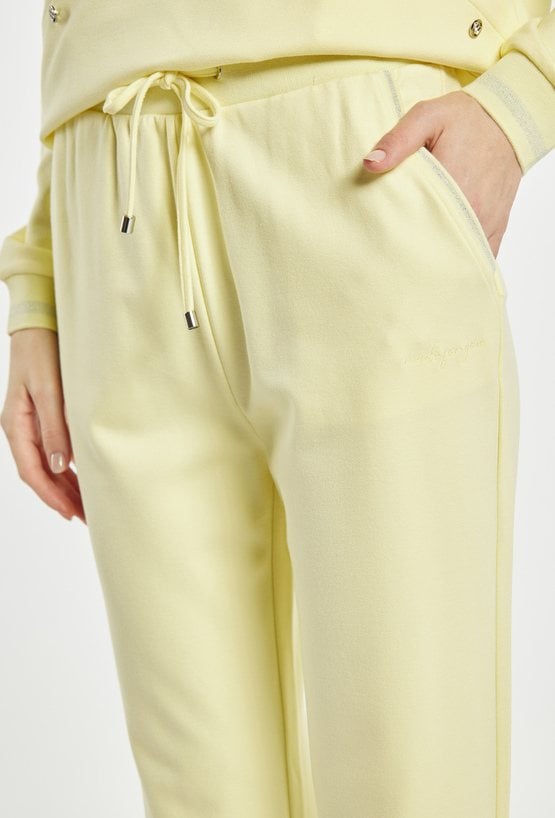 Spodnie damskie o komfortowym, prostym kroju. Spodnie mają elastyczną talię z troczkami, boczne kieszenie oraz delikatne wykończenia przy nogawkach. Spodnie świetnie sprawdzą się na co dzień, tworząc wygodny i spójny zestaw- polecamy zestawić je z pasującą bluzą. Kod do bluzy: 26W-JUM0070. Modelka na zdjęciu ma 177 cm wzrostu i prezentuje rozmiar S.