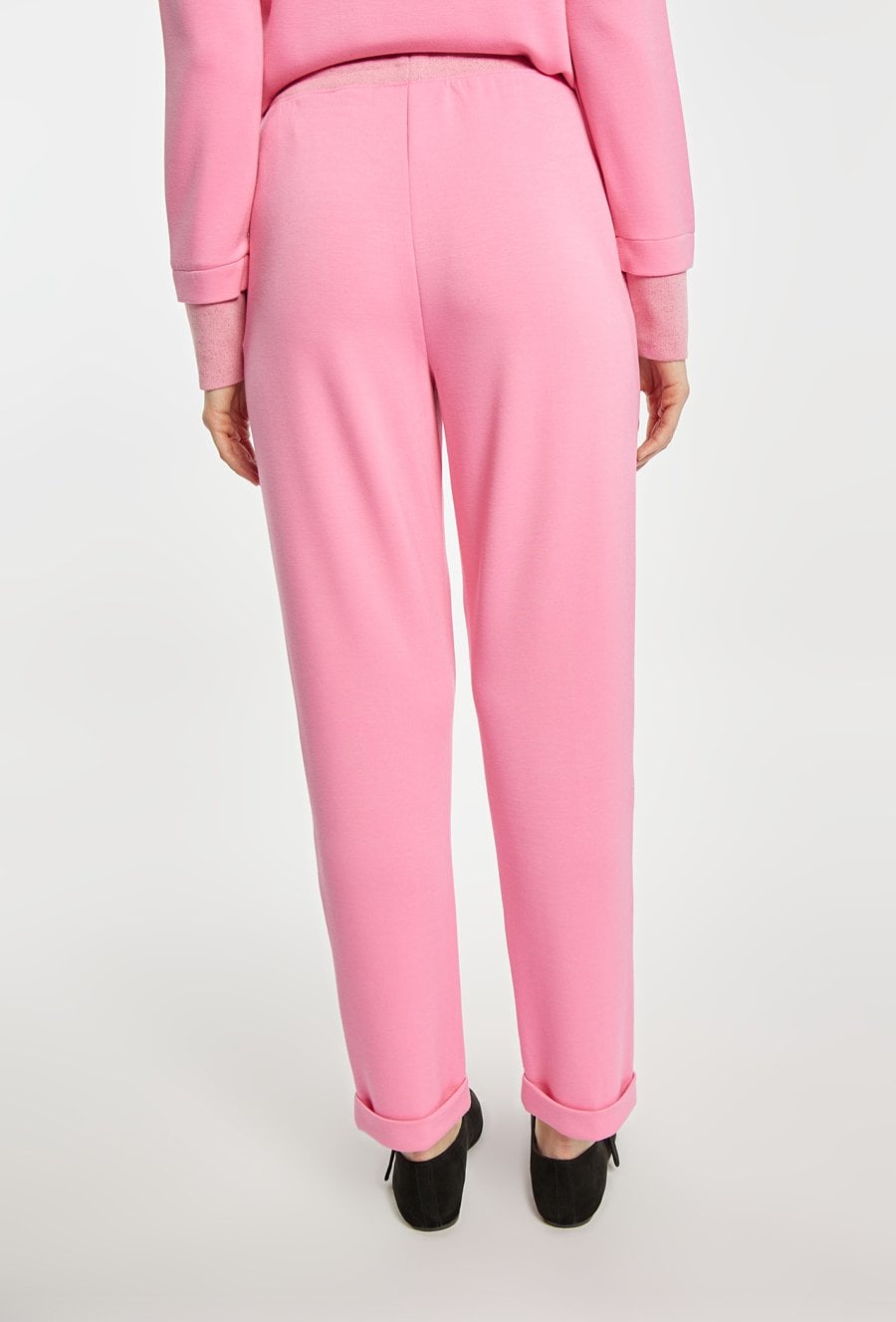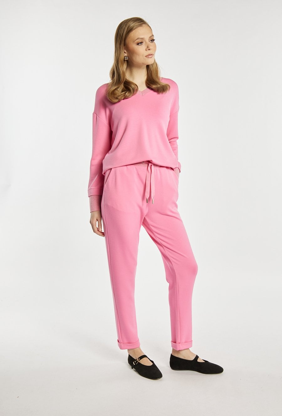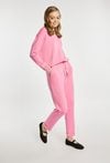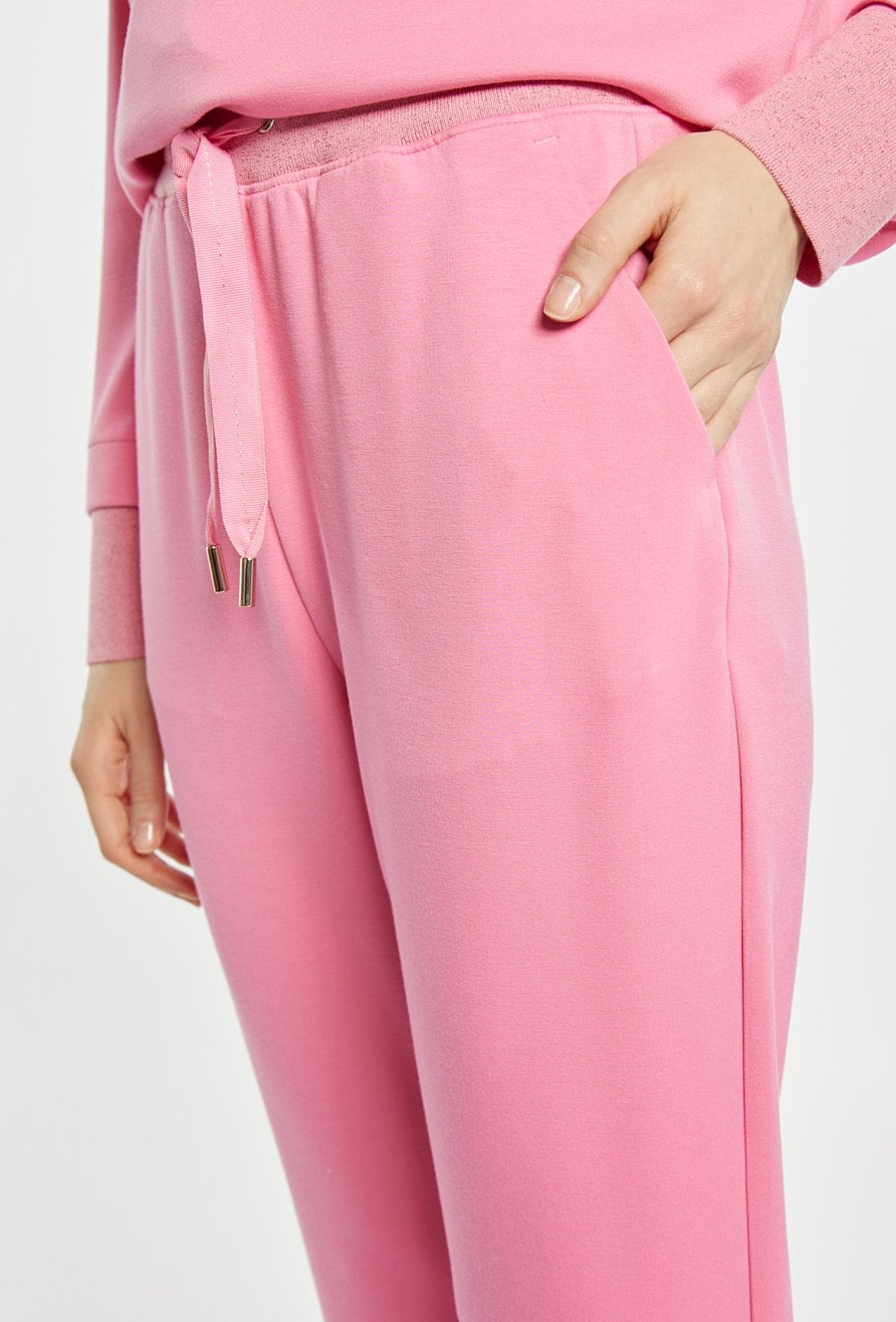 Spodnie dresowe damskie wykonane z miękkiego, komfortowego materiału. Spodnie o swobodnym kroju z elastyczną talią i regulacją na sznurek zapewniają wygodę na co dzień. Podwinięte nogawki dodają im lekkiego, sportowego charakteru. Model można zestawić z pasującą bluzą, tworząc spójny i stylowy komplet. Kod do bluzy: 26W-JUM0420. Modelka na zdjęciu ma 177 cm wzrostu i prezentuje rozmiar S.