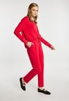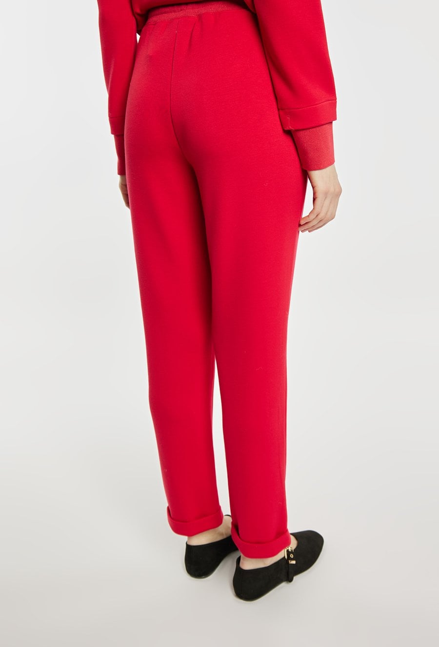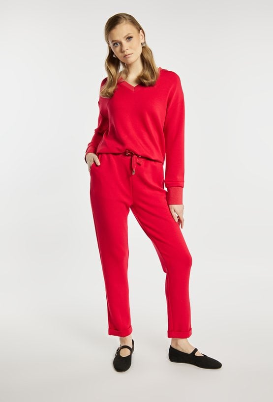 Spodnie dresowe damskie wykonane z miękkiego, komfortowego materiału. Spodnie o swobodnym kroju z elastyczną talią i regulacją na sznurek zapewniają wygodę na co dzień. Podwinięte nogawki dodają im lekkiego, sportowego charakteru. Model można zestawić z pasującą bluzą, tworząc spójny i stylowy komplet. Kod do bluzy: 26W-JUM0420. Modelka na zdjęciu ma 177 cm wzrostu i prezentuje rozmiar S.