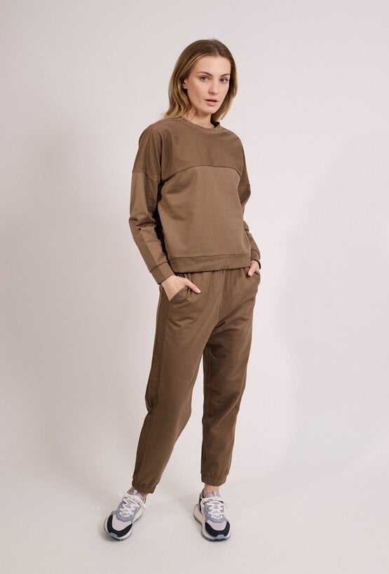 Spodnie dresowe damskie o wygodnym kroju. Model z elastycznym pasem oraz ściągaczami przy nogawkach, które zapewniają dobre dopasowanie i komfort noszenia. Spodnie doskonale sprawdzą się w codziennych i sportowych stylizacjach, na spacery oraz aktywny wypoczynek. Modelka na zdjęciu ma 177 cm wzrostu i prezentuje rozmiar S.
