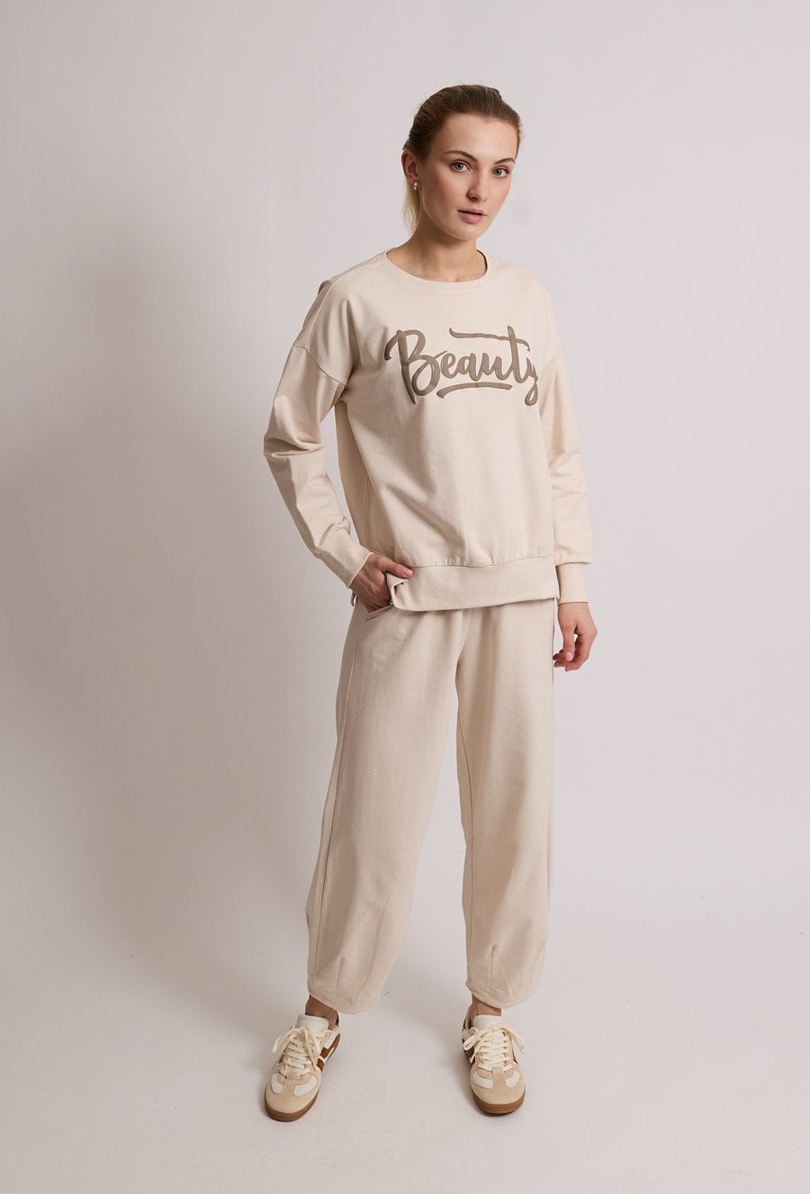 Spodnie dresowe damskie o luźnym kroju. Model z elastycznym pasem oraz ściągaczami przy nogawkach, które zapewniają wygodę i dobre dopasowanie. Spodnie doskonale sprawdzą się w codziennych i sportowych stylizacjach, gwarantując komfort i swobodę ruchów. Modelka na zdjęciu ma 177 cm wzrostu i prezentuje rozmiar S.