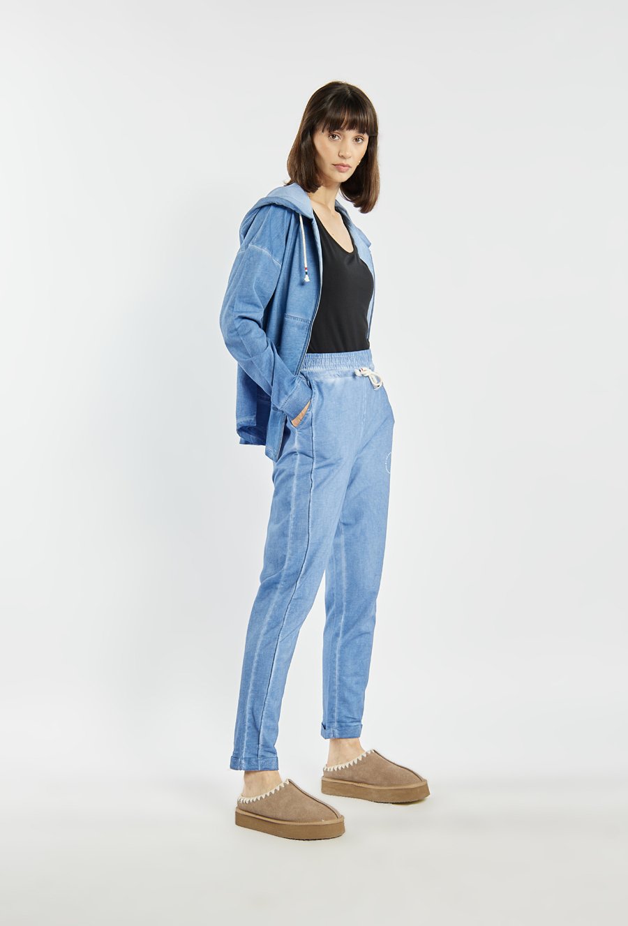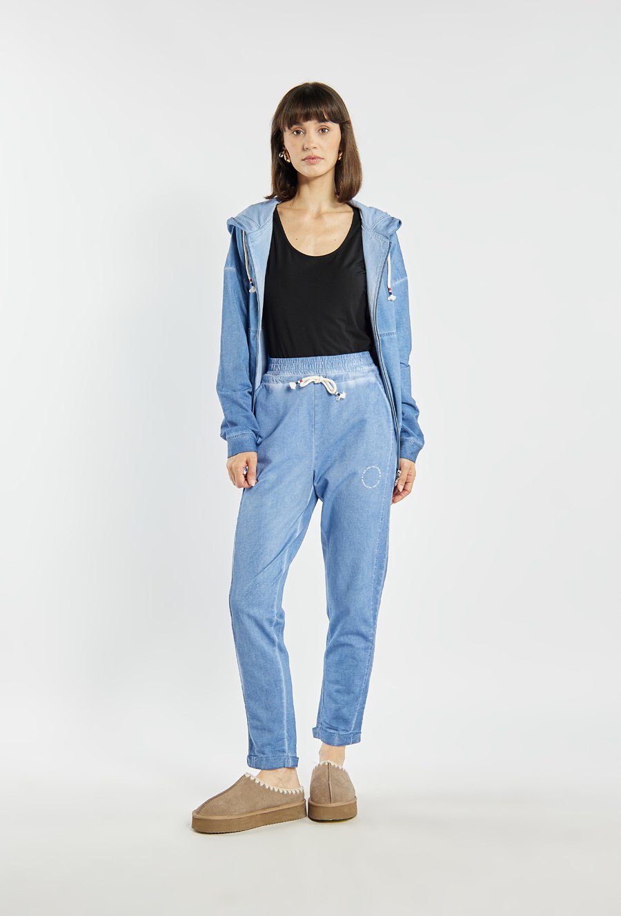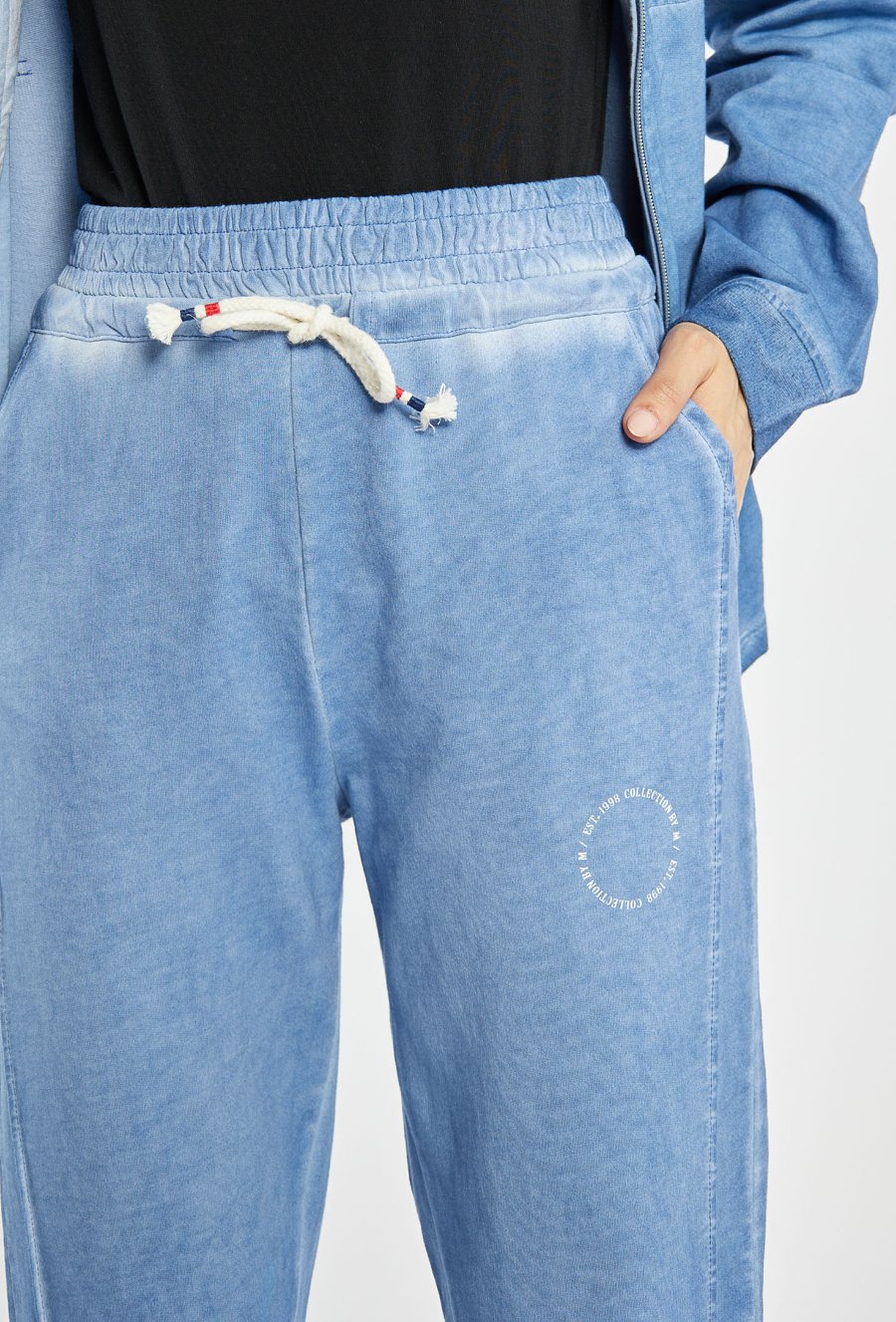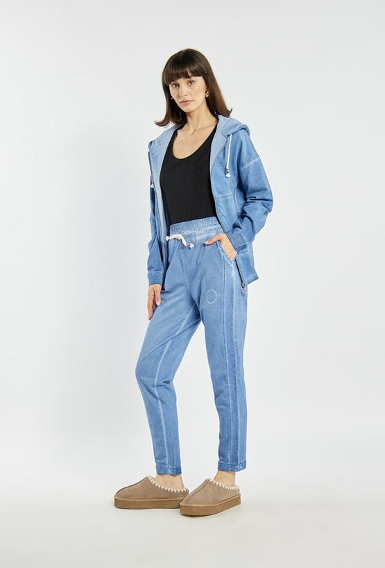 Stylowe spodnie dresowe z bawełny. Spodnie mają luźniejszy krój, elastyczny pas z ozdobnym troczkiem oraz nogawki zakończone mankietami, co nadaje im swobodny, sportowy charakter. Modelka na zdjęciu ma 177 cm wzrostu i prezentuje rozmiar S. Polecamy zestawić z pasującą górą: JUM0720.