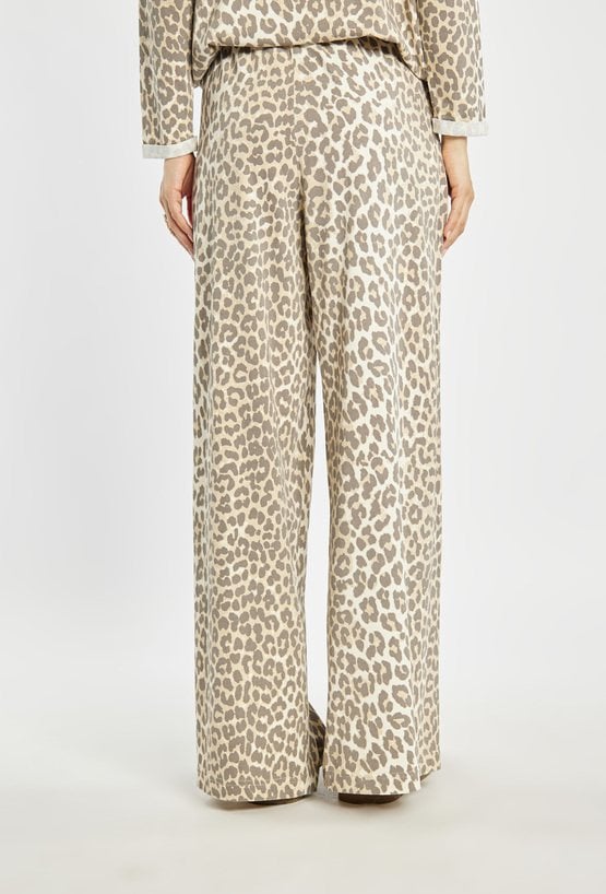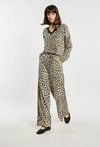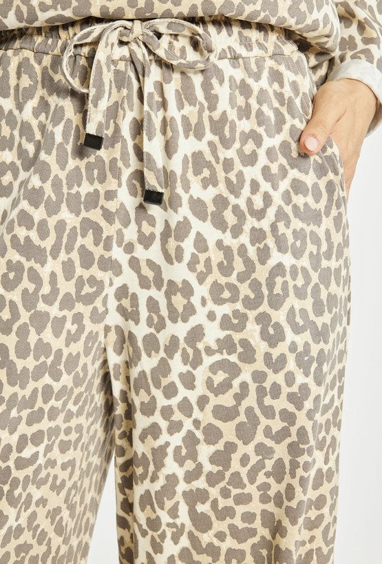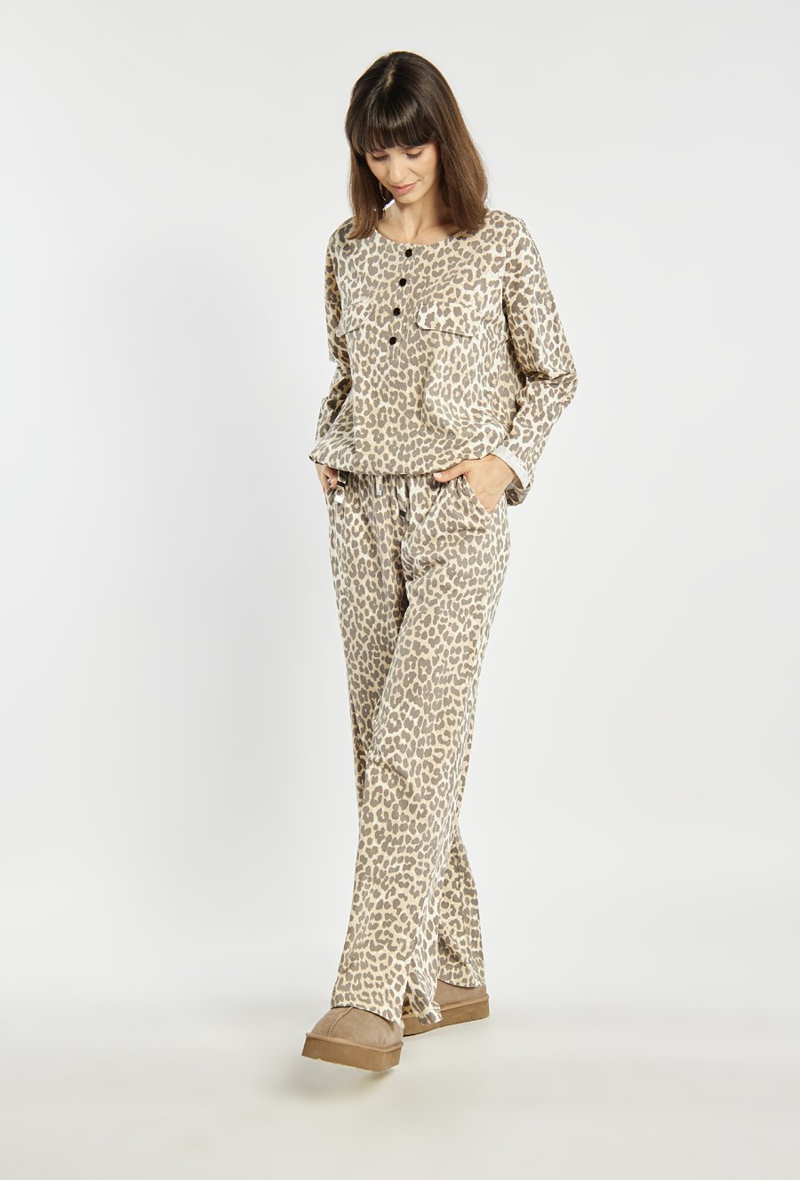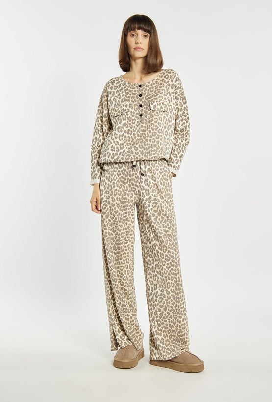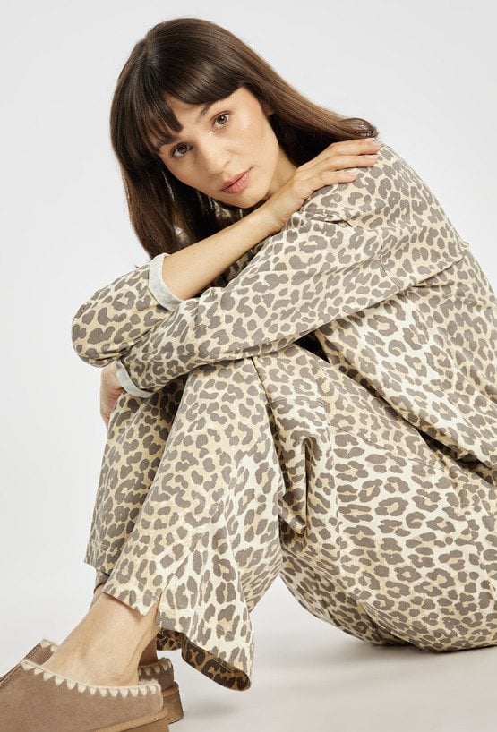 Spodnie damskie z modnym, zwierzęcym motywem. Model o luźnym kroju z szeroką nogawką, który zapewnia maksymalny komfort noszenia. W pasie znajduje się elastyczna gumka z troczkami, umożliwiająca idealne dopasowanie do sylwetki. Spodnie doskonale sprawdzą się w stylizacjach typu homewear lub w połączeniu z bluzą z tej samej kolekcji. Kod do bluzy: 25J-JUM0761. Modelka na zdjęciu ma 177 cm wzrostu i prezentuje rozmiar S.
