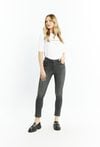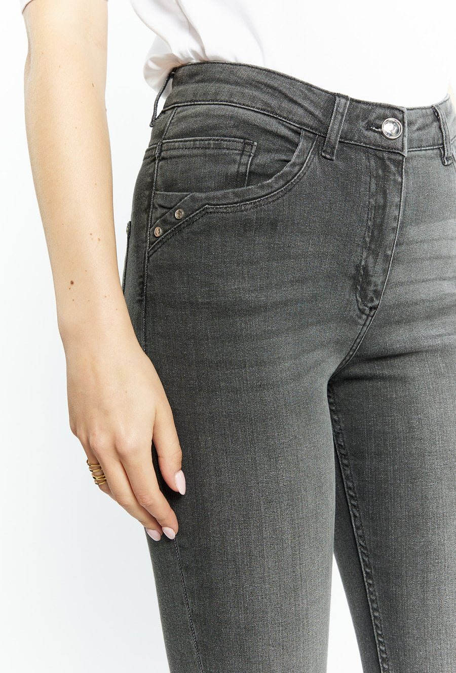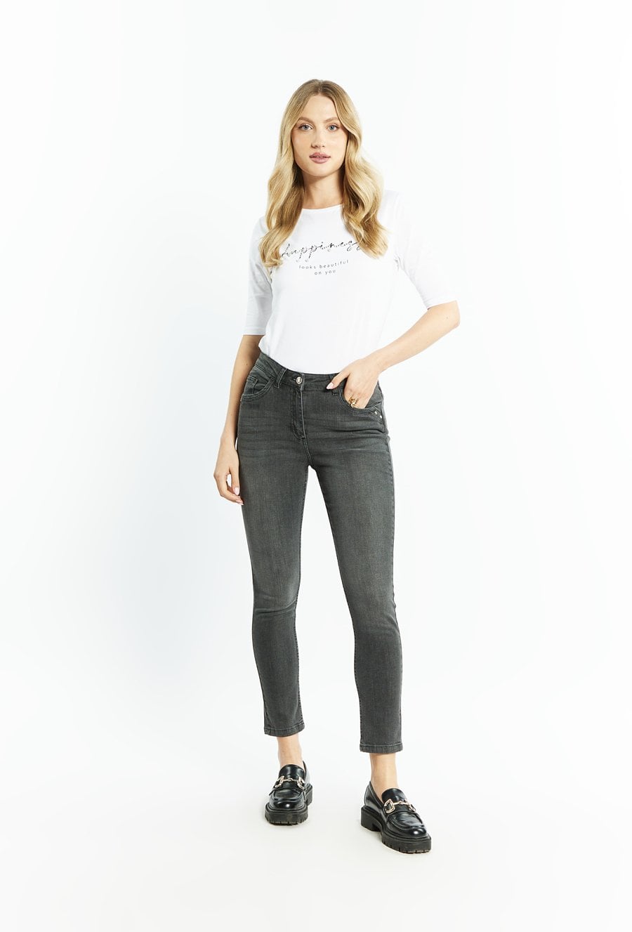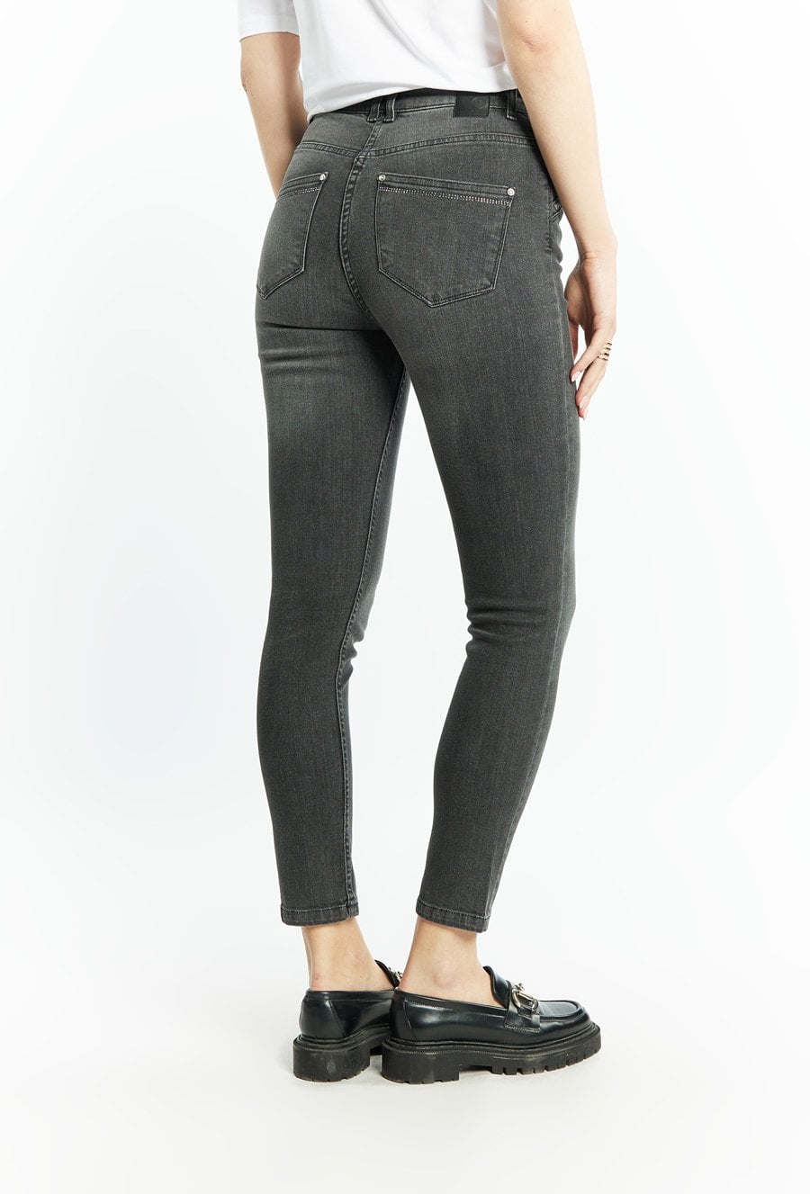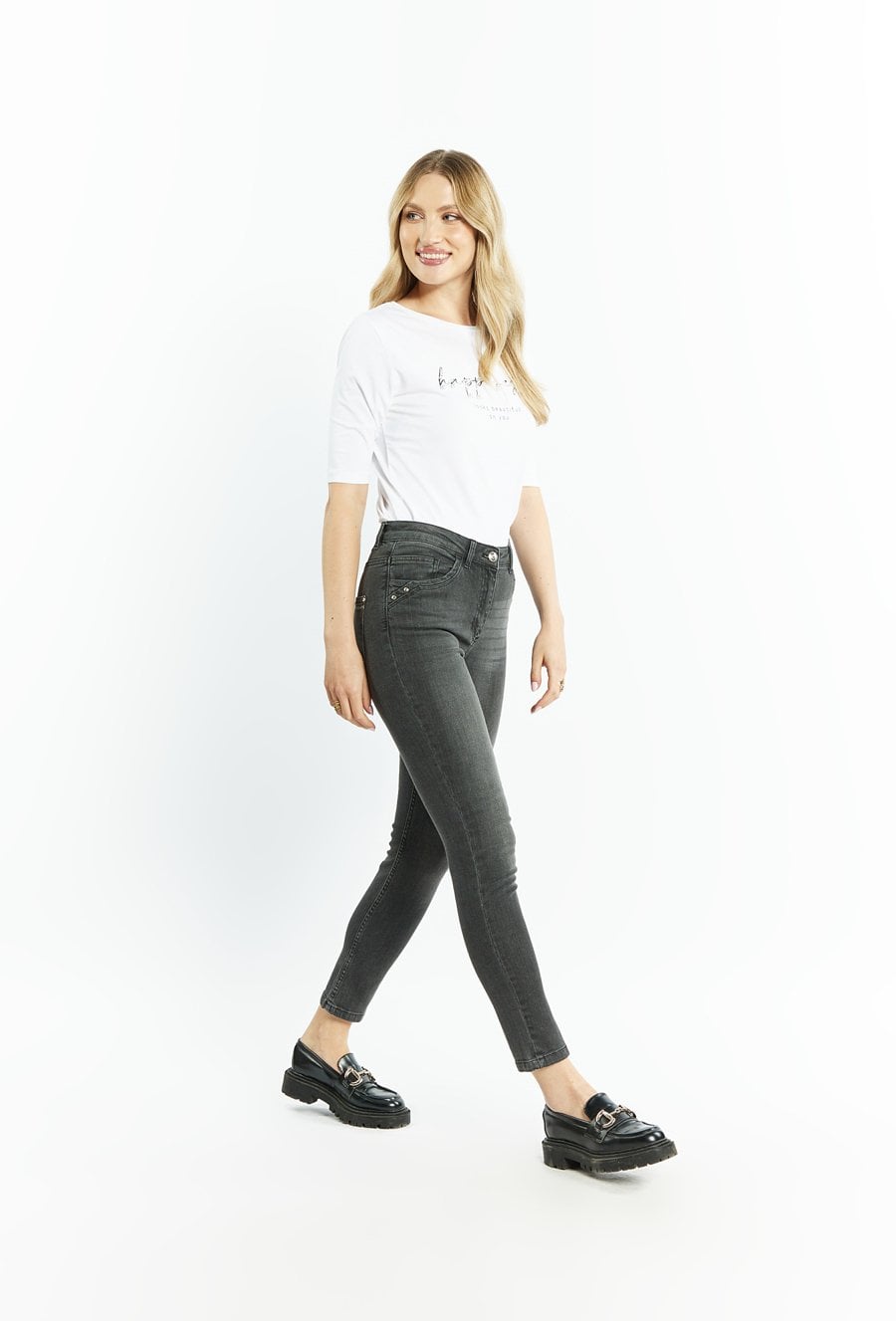 Jeansy damskie z wysokim stanem wykonane z bawełny z dodatkiem elastycznych włókien. Jeansy z długimi, zwężanymi nogawkami, szlufkami w pasie oraz wpuszczanymi kieszeniami zarówno z przodu, jak i z tyłu. Jeansowe spodnie to baza do stworzenia codziennych stylizacji. Modelka na zdjęciu ma 177 cm wzrostu i prezentuje rozmiar 36.