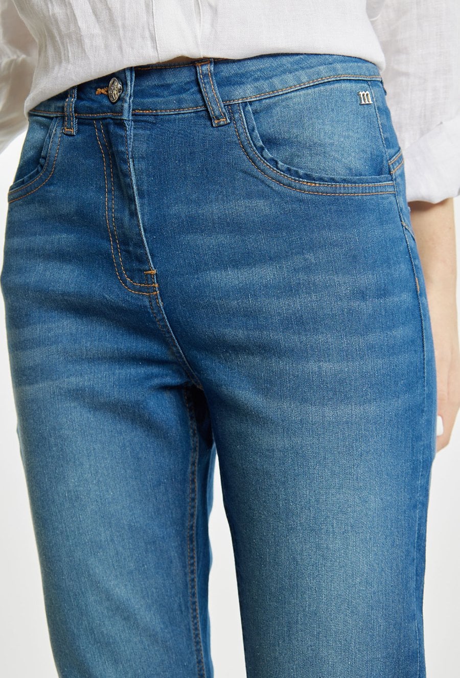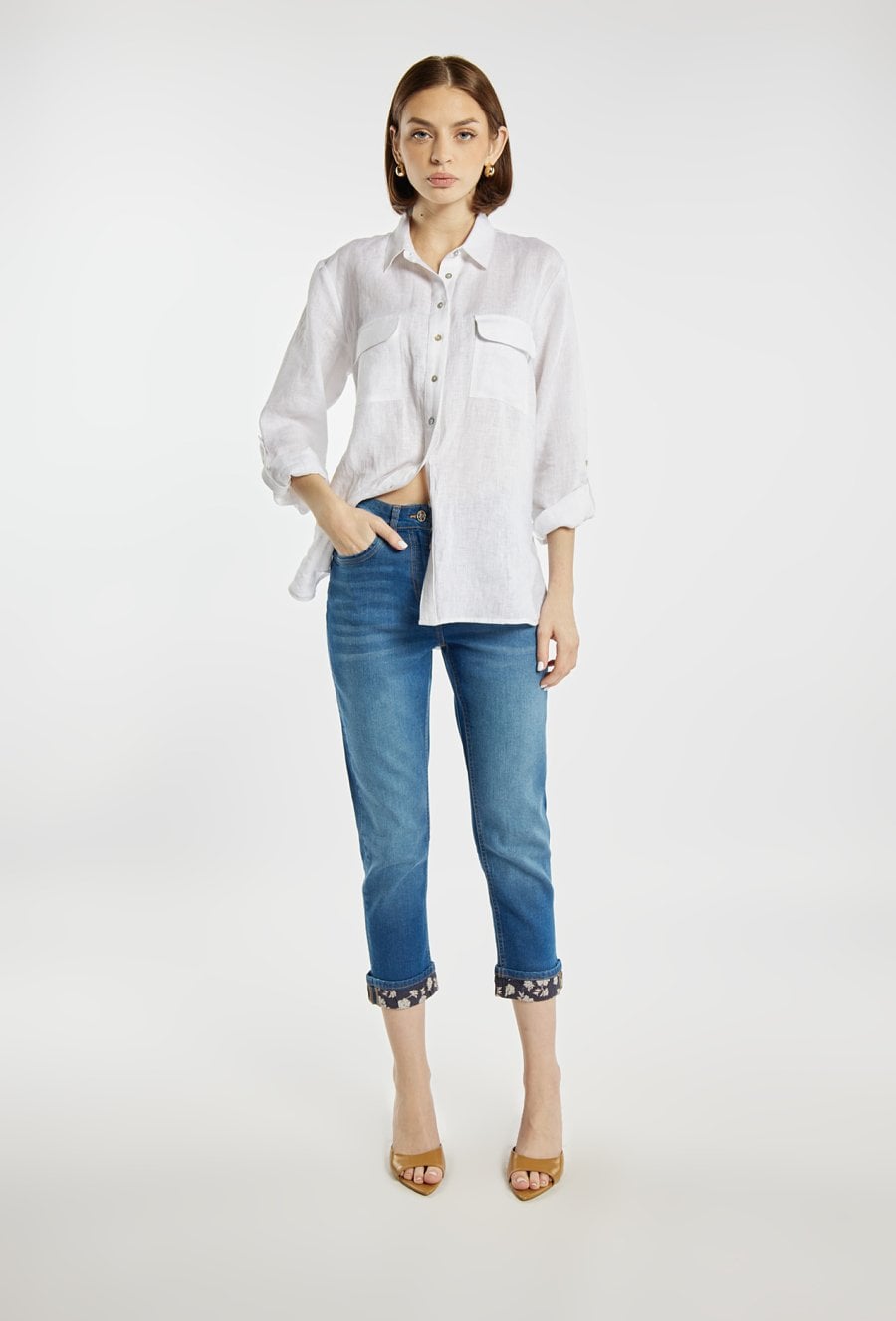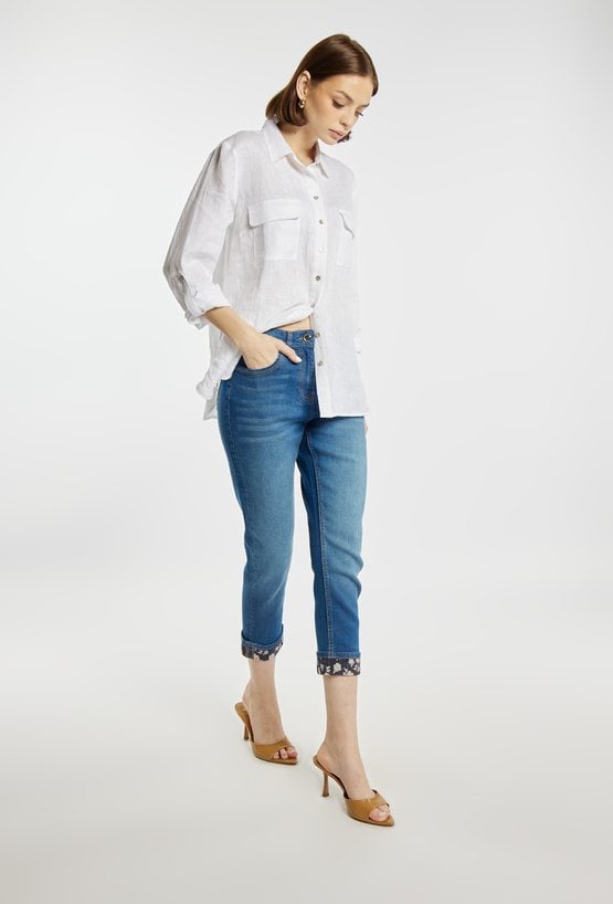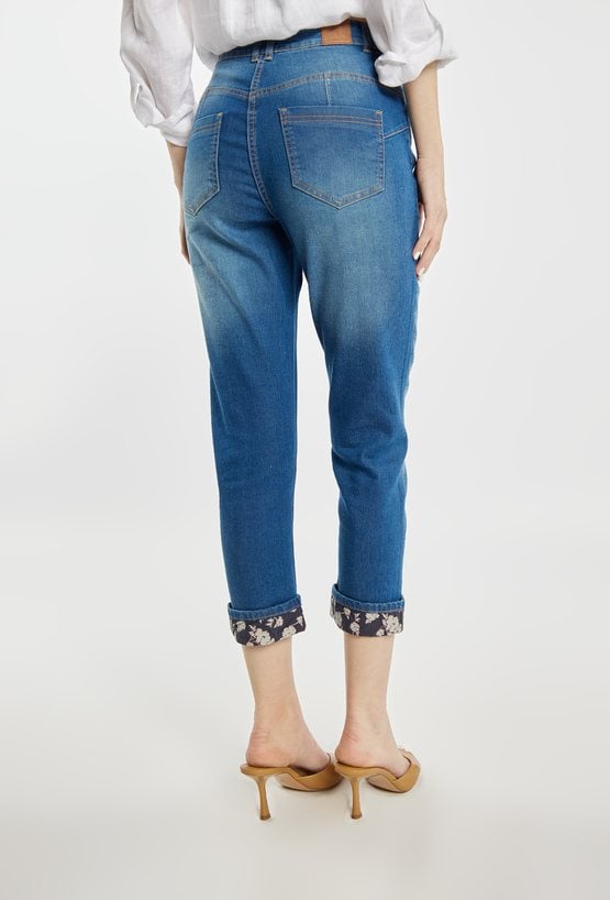 Jeansy 7/8 o klasycznym kroju z lekko zwężaną nogawką, wykończone mankietem z delikatnym, dekoracyjnym akcentem. Jeansy 7/8 świetnie prezentują się z bluzką, t-shirtem lub lekkim swetrem oraz butami na obcasie lub balerinami. Modelka na zdjęciu ma 177 cm wzrostu i prezentuje rozmiar 36.