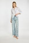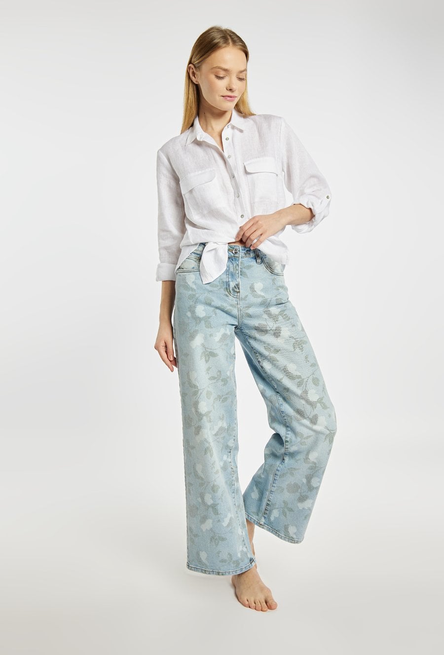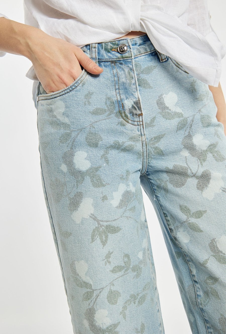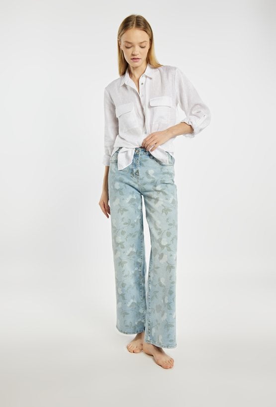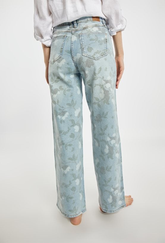 Jeansy damskie o prostym, szerokim kroju, wykonane z jasnoniebieskiego denimu z dekoracyjnym, kwiatowym wzorem. Model z klasycznym stanem i długimi nogawkami, które zapewniają komfort noszenia i nowoczesny wygląd. Idealne do codziennych stylizacji z koszulą, T-shirtem lub swetrem. Modelka na zdjęciu ma 177 cm wzrostu i prezentuje rozmiar 36.