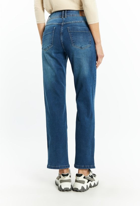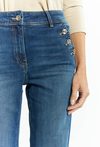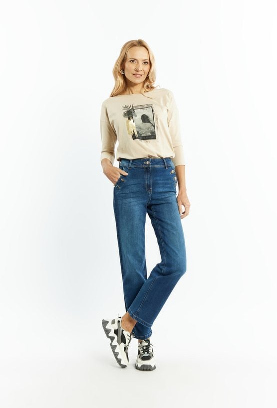 Jeansowe spodnie damskie wykonane z bawełny z dodatkiem elastycznych włókien. Spodnie zapinane na guzik oraz suwak, po bokach kieszenie zapinane na ozdobne guziki. Spodnie z długimi oraz szerokimi nogawkami. Idealnie sprawdzą się jako baza do codziennych stylizacji. Modelka ma 177 cm i prezentuje rozmiar 36.