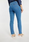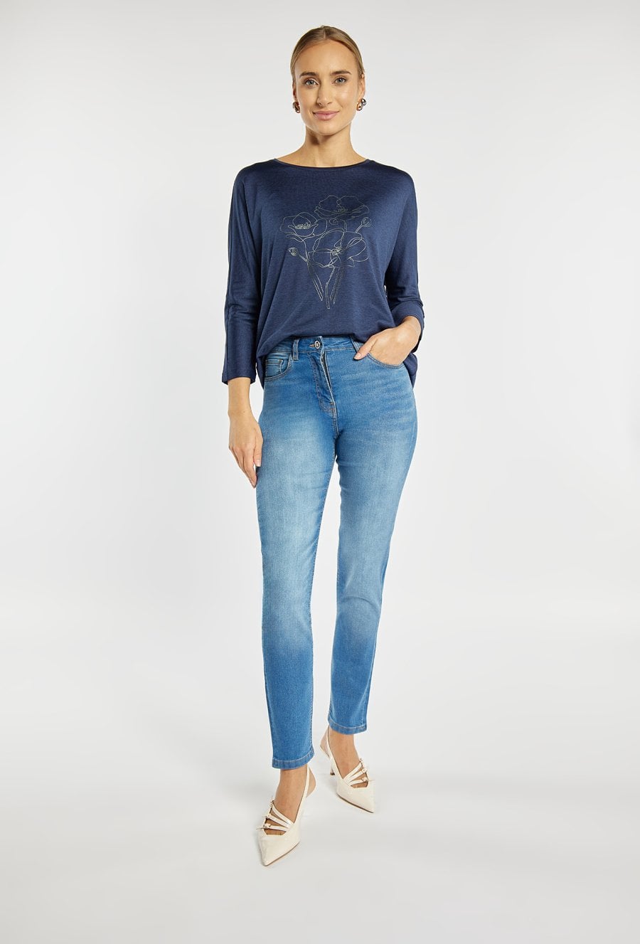 Jeansy o klasycznym kroju podkreślają sylwetkę i zapewniają wygodę na co dzień. Jeansy mają długą, lekko zwężaną nogawkę, elastyczny materiał i subtelne cieniowanie, a z tyłu ozdobny detal, który dodaje im charakteru. Idealne do codziennych stylizacji. Modelka na zdjęciu ma 177 cm wzrostu i prezentuje rozmiar 36.