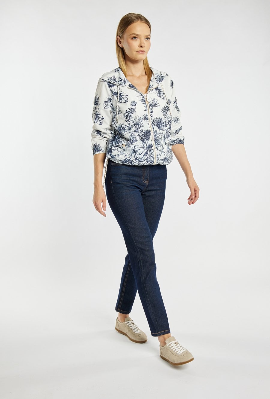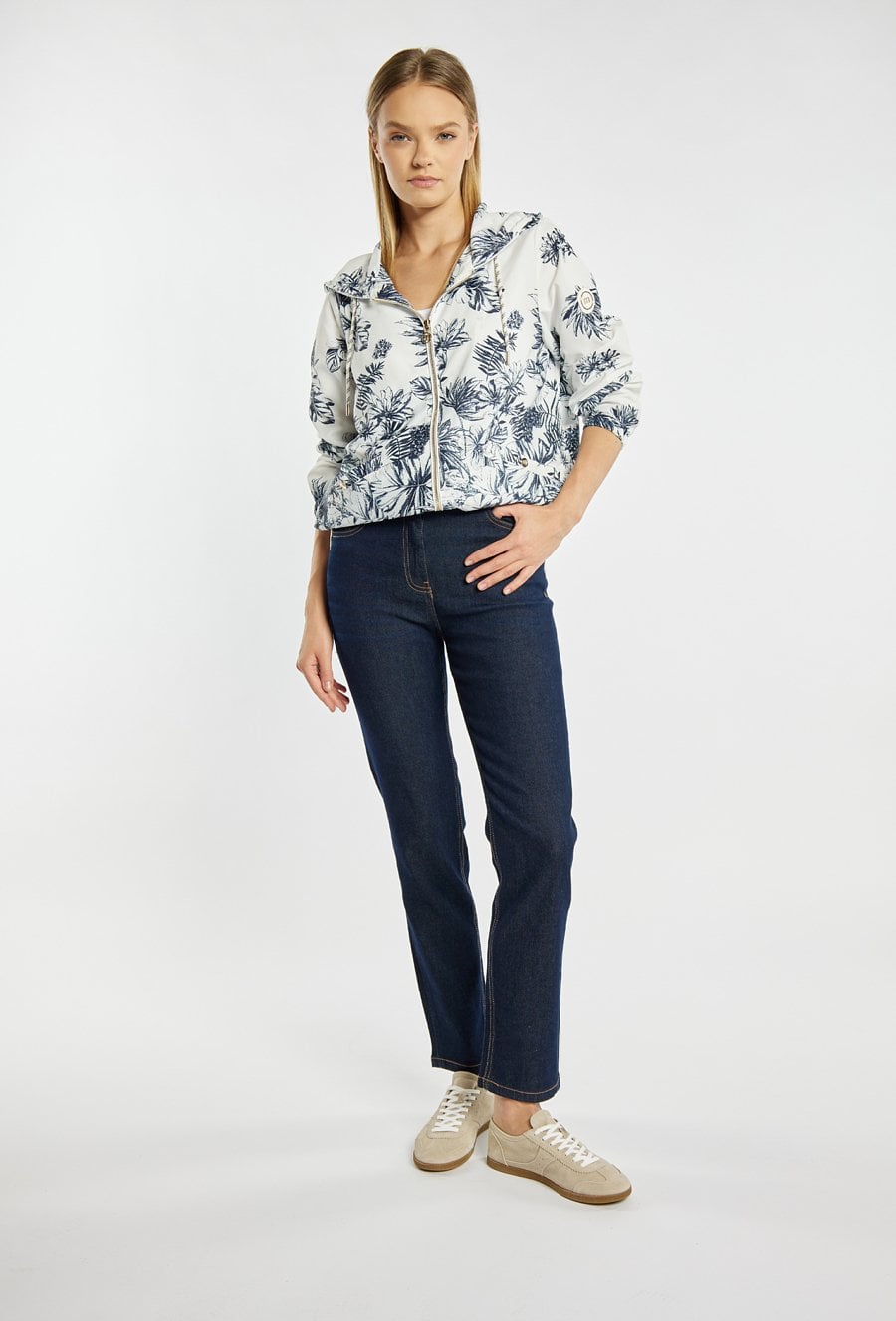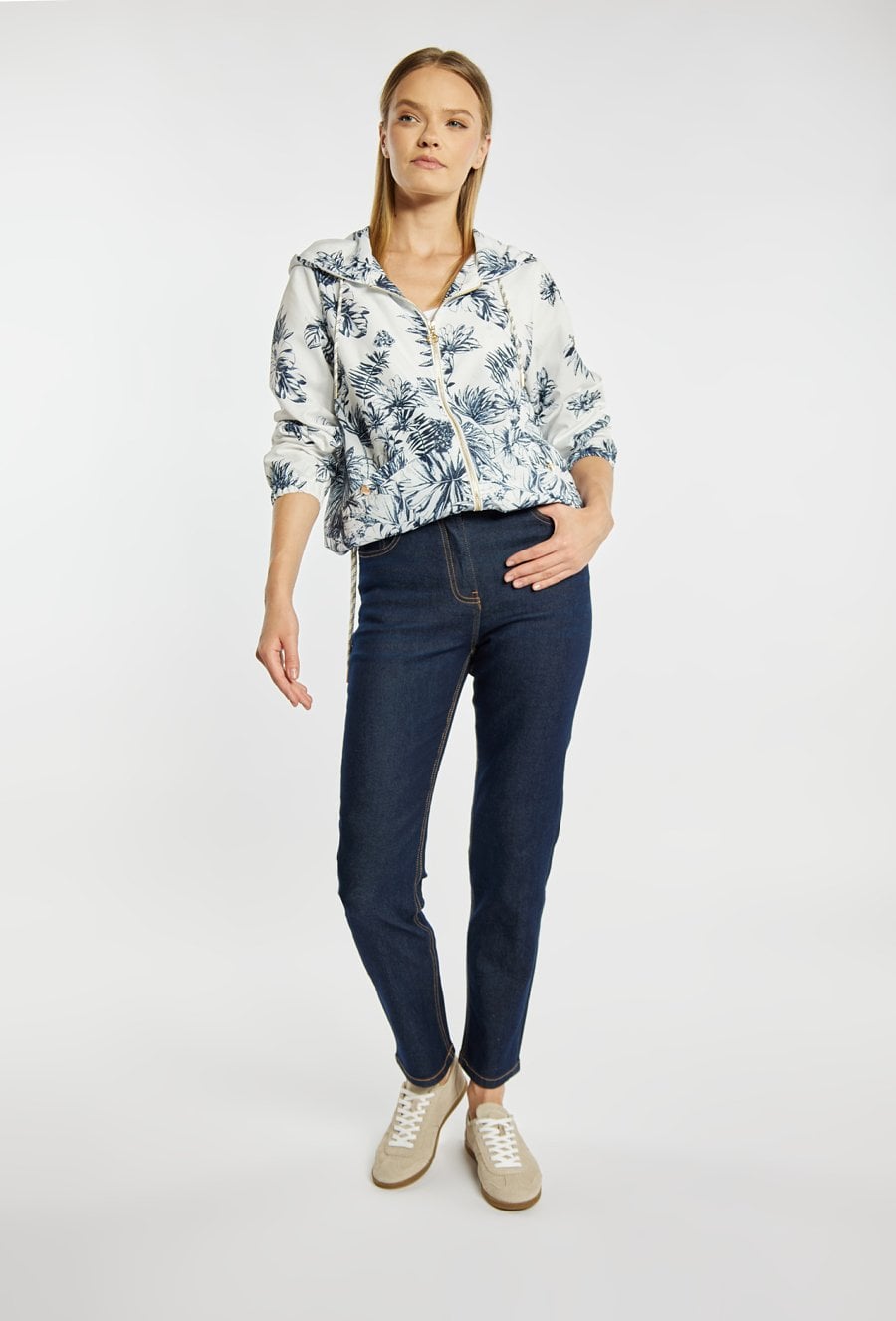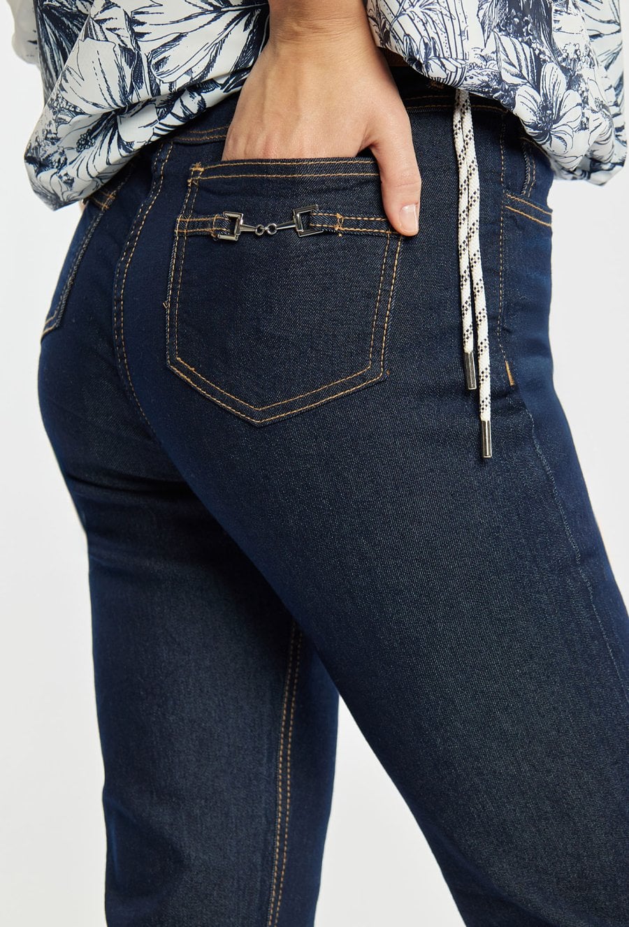 Jeansy o klasycznym kroju podkreślają sylwetkę i zapewniają wygodę na co dzień. Jeansy mają długą, lekko zwężaną nogawkę, elastyczny materiał i subtelne cieniowanie, a z tyłu ozdobny detal, który dodaje im charakteru. Idealne do codziennych stylizacji. Modelka na zdjęciu ma 177 cm wzrostu i prezentuje rozmiar 36.