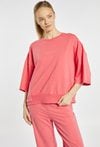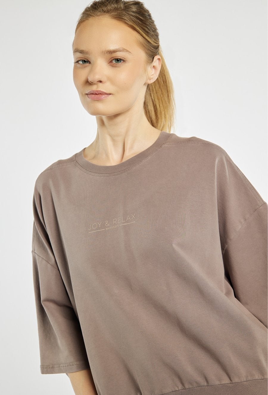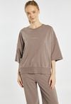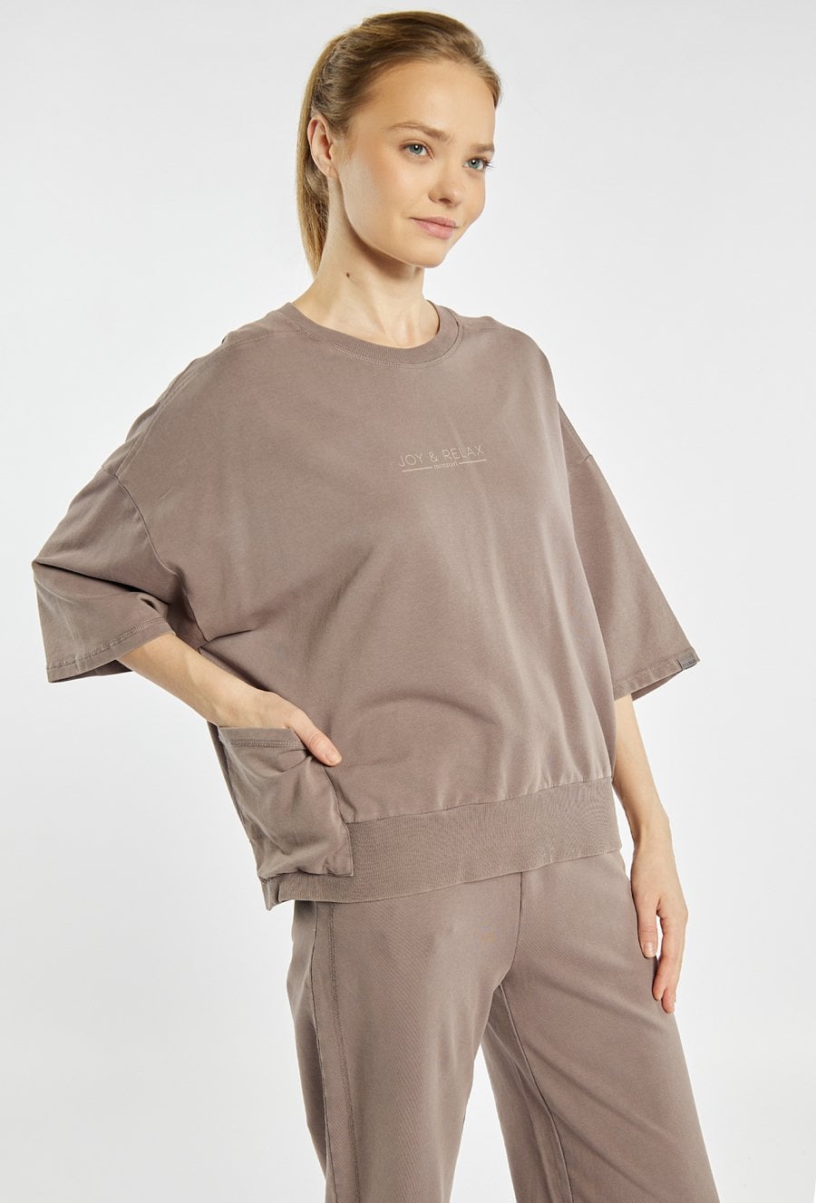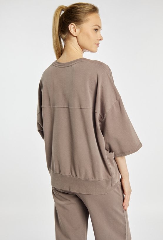 Bluza sportowa o luźnym, komfortowym kroju. Bluza ma obniżoną linię ramion, krótkie rękawy do łokcia. Gładka forma i minimalistyczny nadruk nadają jej casualowy charakter. Bluza sprawdzi się w codziennych, wygodnych stylizacjach i można ją zestawić z pasującymi spodniami dresowymi. Kod do spodni: 26W-TRU0780. Modelka na zdjęciu ma 177 cm wzrostu i prezentuje rozmiar S/M.