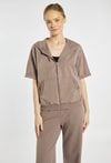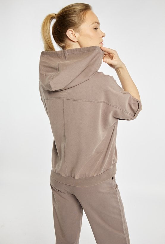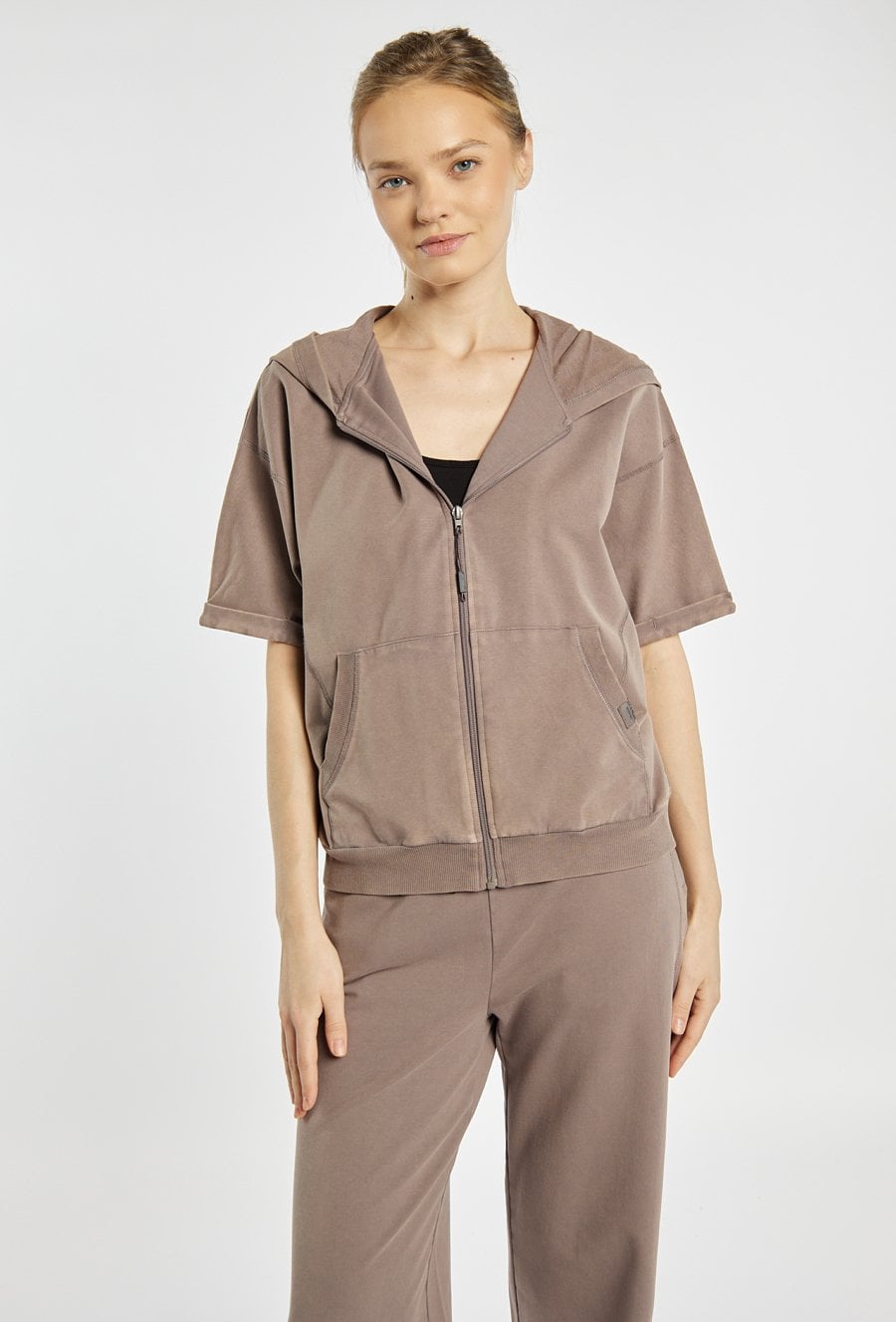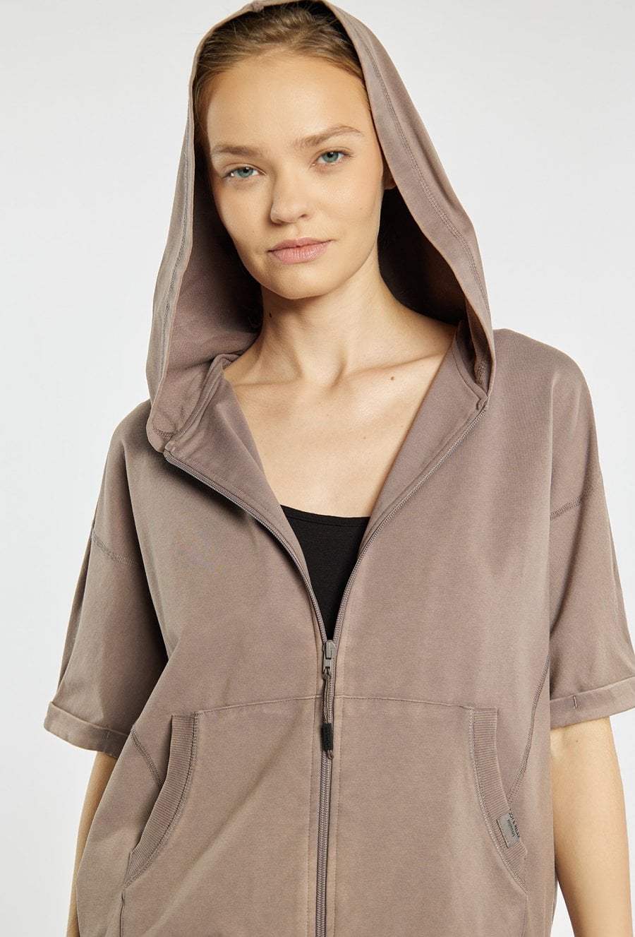 Sportowa kamizelka o luźnym, komfortowym fasonie, zapinana na suwak, z kapturem oraz praktycznymi kieszeniami z przodu. Idealna na co dzień i do aktywnych stylizacji. Można ją zestawić z pasującymi spodniami dresowymi. Kod do spodni: 26W-TRU0780. Modelka na zdjęciu ma 177 cm wzrostu i prezentuje rozmiar S.