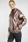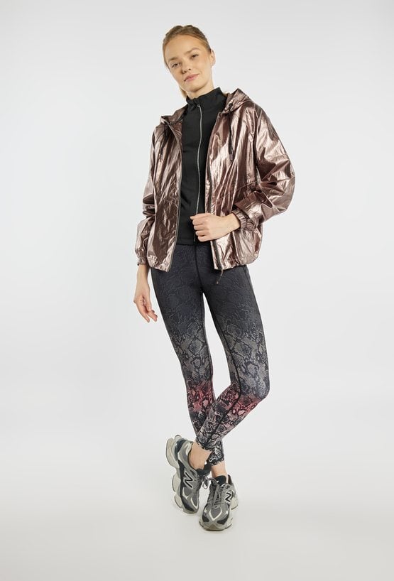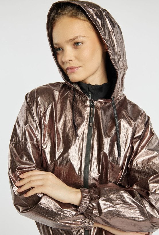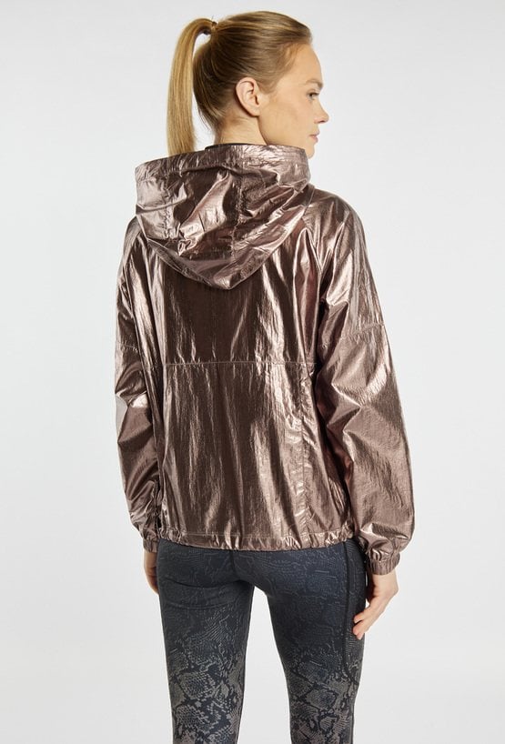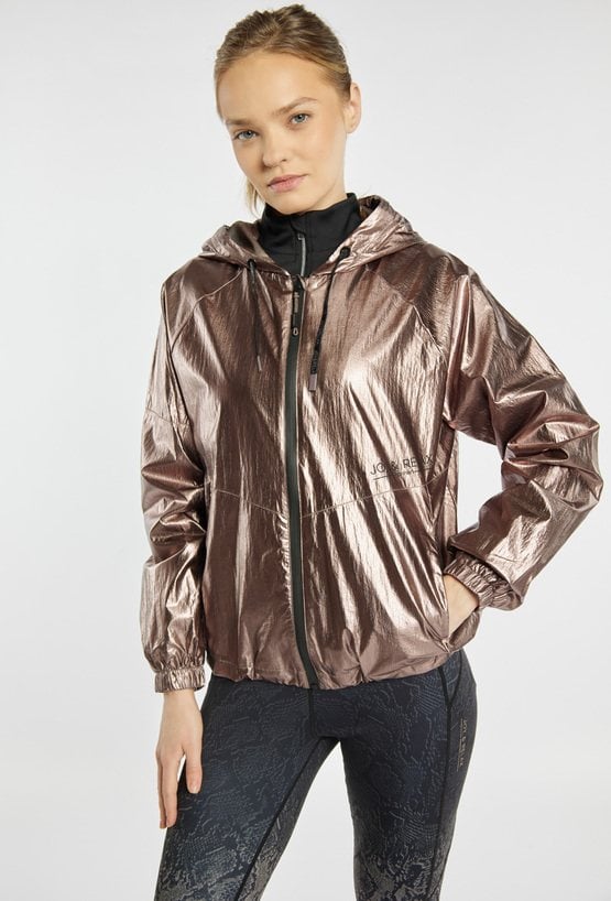 Kurtka z kolekcji sportowej JOY&RELAX o lekkim, sportowym fasonie, wykonana z metalicznie połyskującego materiału, zapinana na suwak, z kapturem oraz elastycznymi mankietami, idealna do aktywnych stylizacji i świetnie komponująca się ze spodniami lub legginsami z tej samej linii. Modelka na zdjęciu ma 177 cm wzrostu i prezentuje rozmiar S.