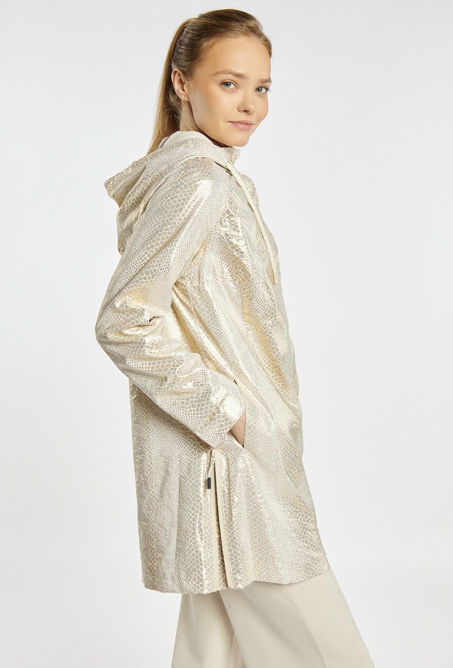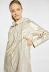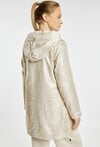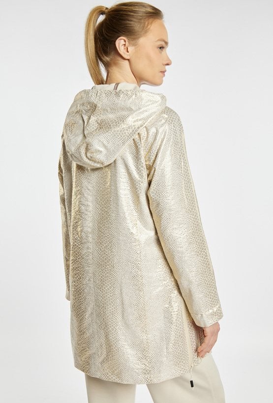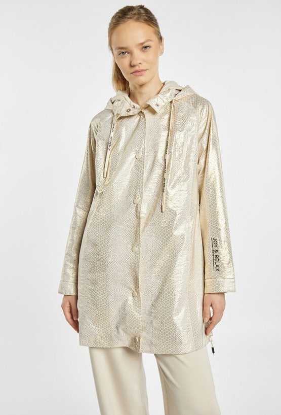 Płaszcz z kolekcji sportowej JOY&RELAX o lekkim, funkcjonalnym fasonie, z odpinanym kapturem, zapinany na napy, z kieszeniami po bokach i subtelnym połyskiem materiału, idealny na przejściowy sezon i do codziennych, sportowo-miejskich stylizacji. Modelka na zdjęciu ma 177 cm wzrostu i prezentuje rozmiar S.