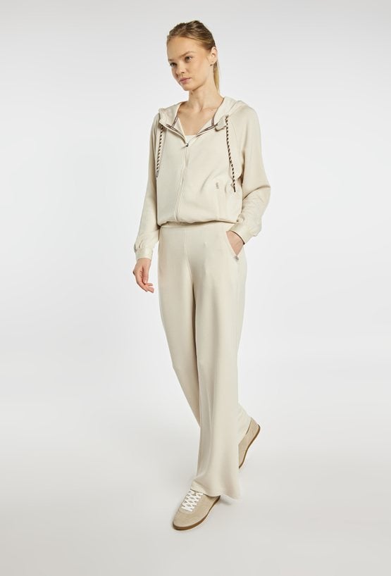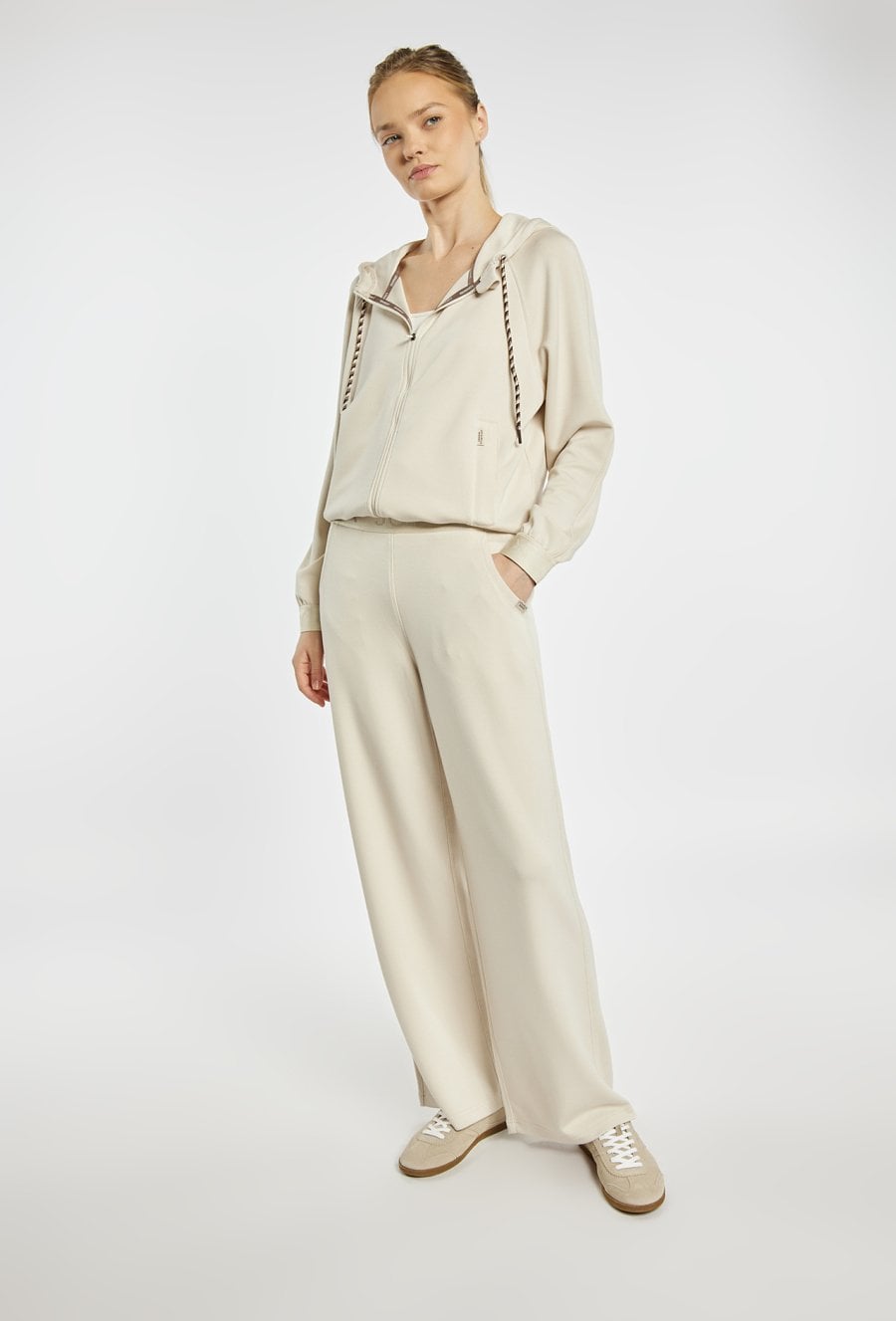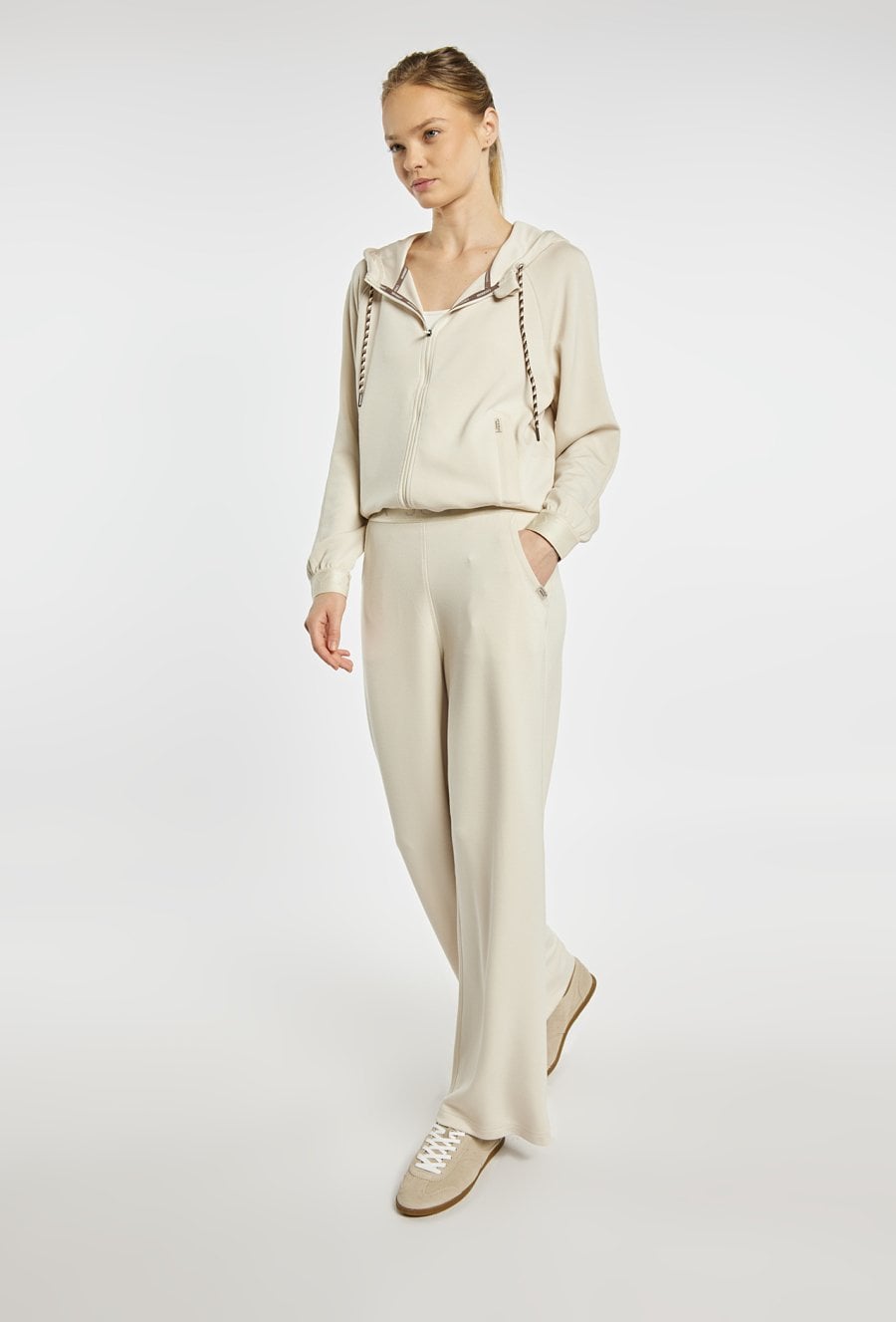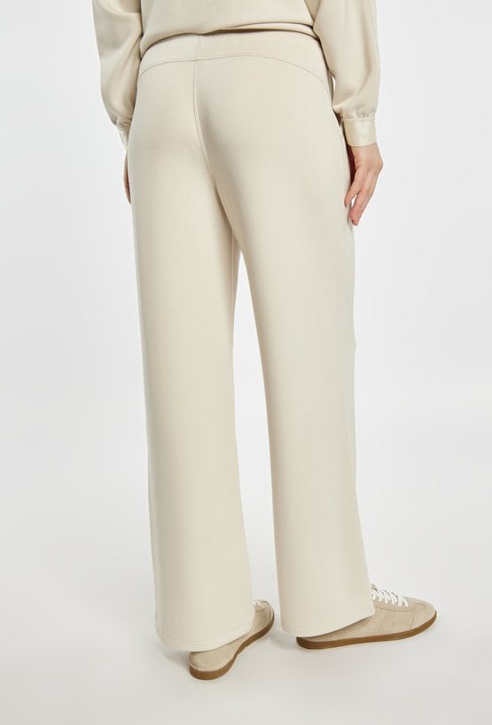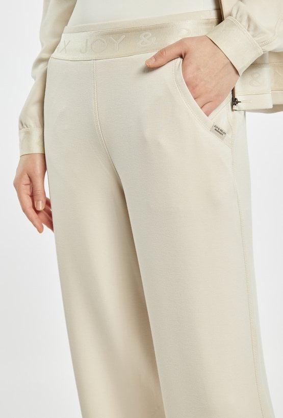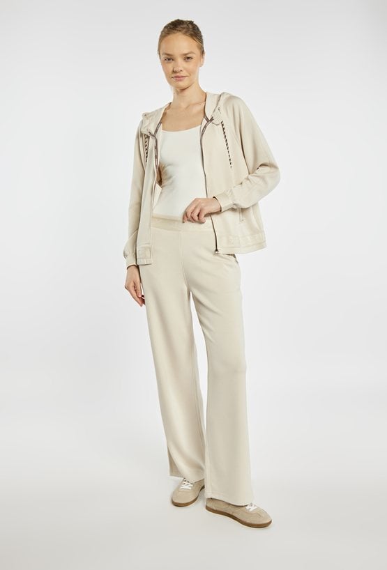 Spodnie o sportowym charakterze, wykonane z miękkiej i przyjemnej w dotyku dzianiny. Model z prostymi, luźniejszymi nogawkami, które zapewniają swobodę ruchów i komfort noszenia. W pasie elastyczna talia z ozdobną gumą oraz kieszenie po bokach. Spodnie można zestawić z pasującą bluzą, tworząc wygodny i spójny komplet na co dzień. Kod do bluzy: 26W-JUM0500. Modelka na zdjęciu ma 177 cm wzrostu i prezentuje rozmiar S.