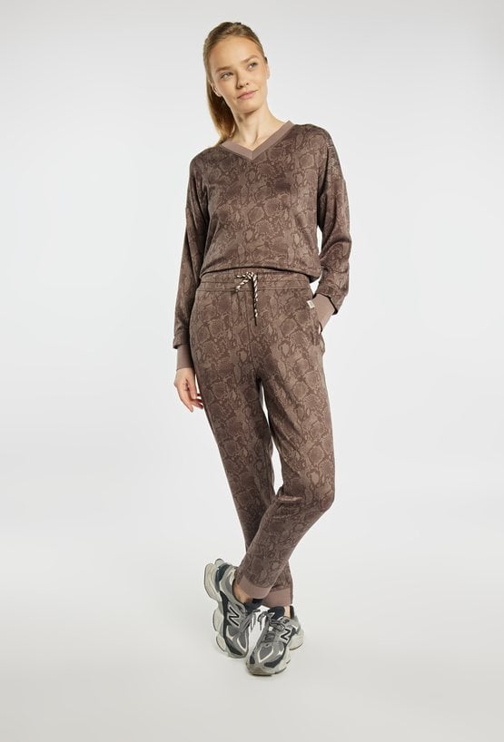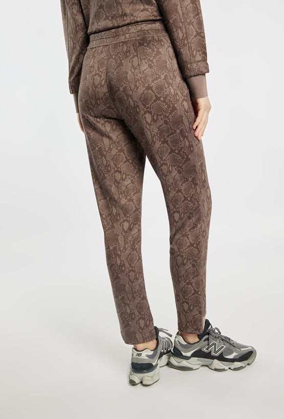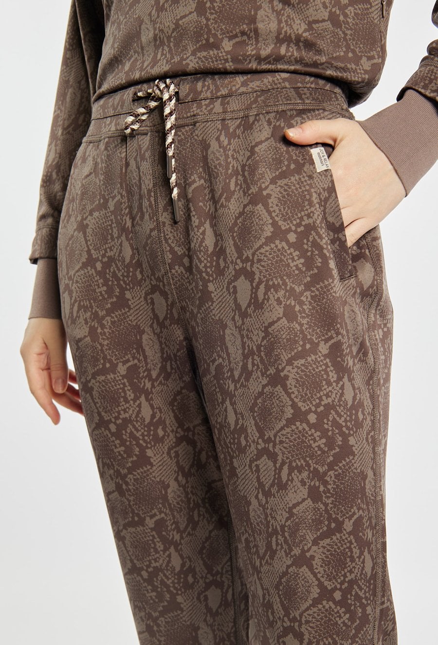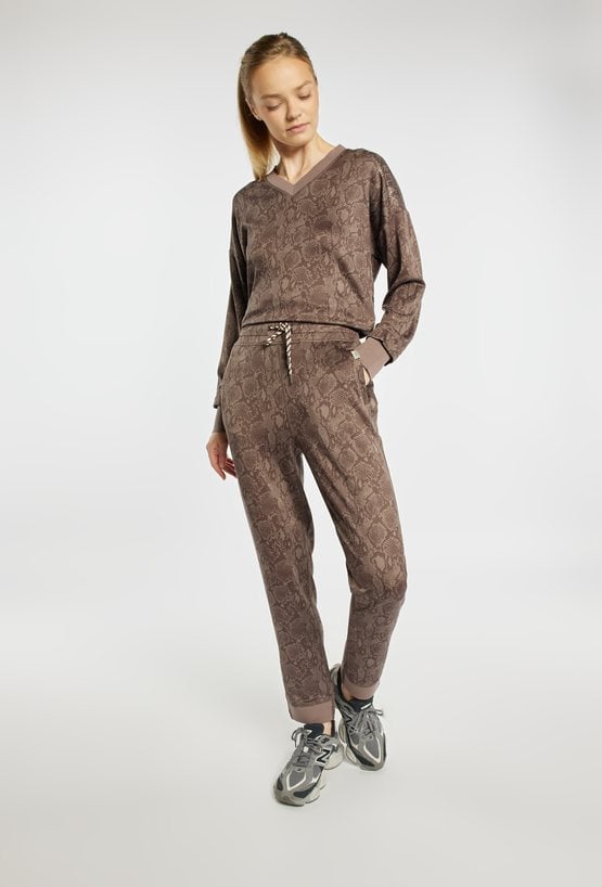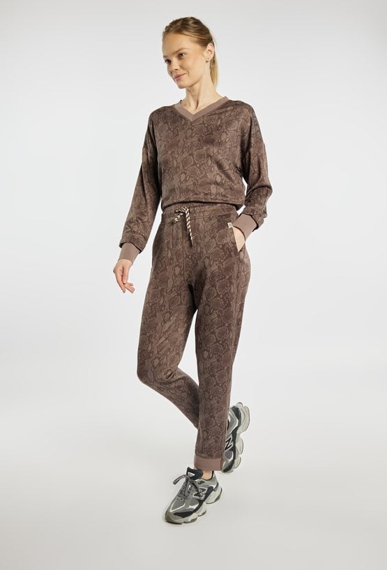 Spodnie o sportowym charakterze z delikatnym wzorem, o luźniejszym, wygodnym kroju z lekko zwężaną nogawką, wykończone elastycznym pasem z regulacją. Model zapewnia komfort noszenia na co dzień i świetnie sprawdzi się w casualowych stylizacjach. Można je zestawić z pasującą górą, tworząc spójny i wygodny komplet. Kody do bluz: 26W-JUM0460 lub 26W-JUM0501. Modelka na zdjęciu ma 177 cm wzrostu i prezentuje rozmiar S.