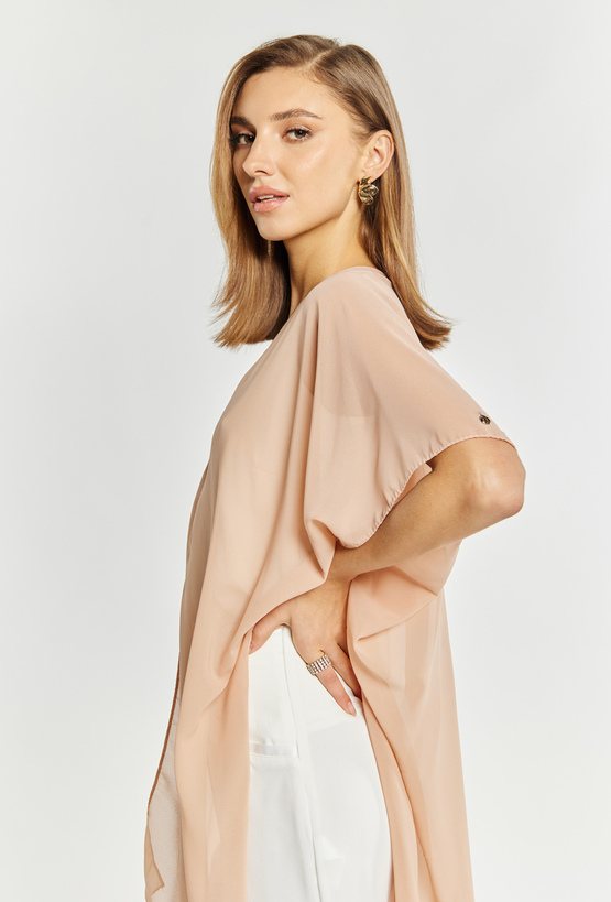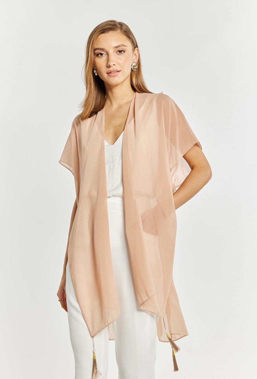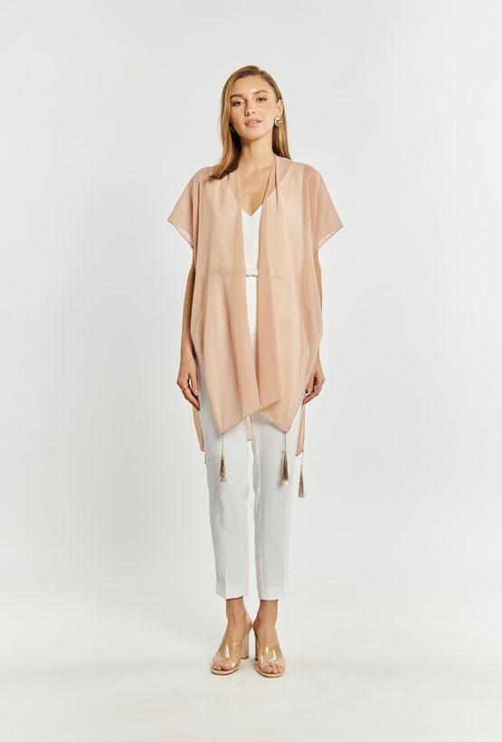 Szyfonowa narzutka damska wykonana z z miękkiego i delikatnego materiału. Narzutka ze zdobieniem w postaci frędzli na dole. Model ten idealnie dopełni wyjątkowe okazję. Modelka na zdjęciu ma 177 cm wzrostu.