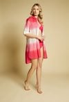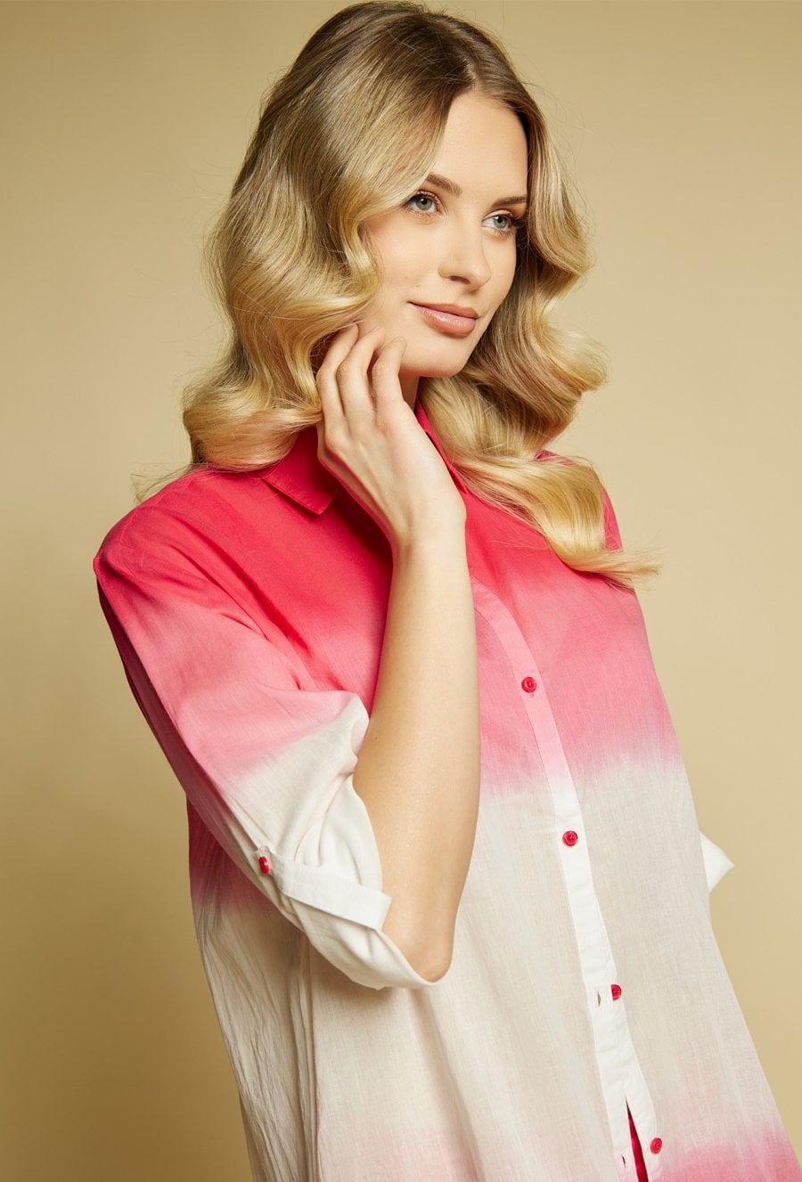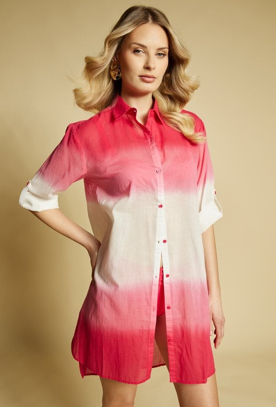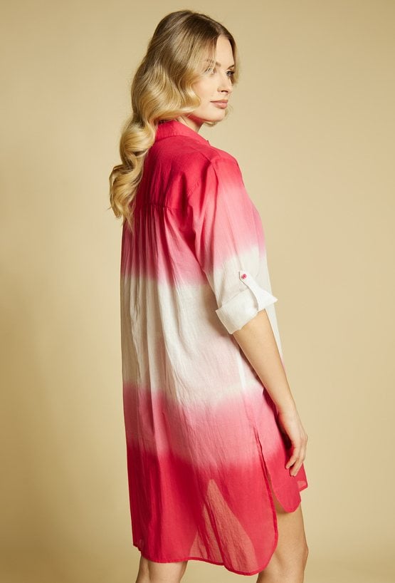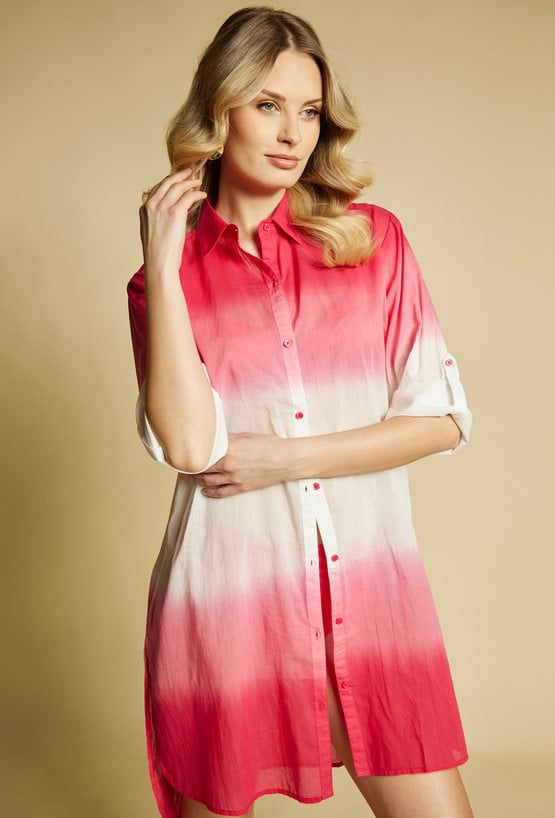 Pareo damskie w formie lekkiej, zwiewnej koszuli o wydłużonym kroju. Model zapinany na guziki, z klasycznym kołnierzykiem oraz rękawem 3/4 z możliwością podpięcia. Efektowny, cieniowany wzór typu ombre nadaje całości letniego, wakacyjnego charakteru. Modelka na zdjęciu ma 177 cm wzrostu i prezentuje rozmiar S/M.