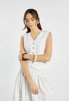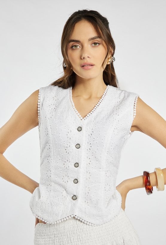 Ażurowa, bawełniana kamizelka zapinana na rząd ozdobnych guzików. Model o klasycznym kroju z delikatnym wycięciem w serek i subtelną lamówką na brzegach. Tył kamizelki wiązany, co pozwala na lekką regulację talii i dopasowanie do sylwetki. Modelka na zdjęciu ma 177 cm wzrostu i prezentuje rozmiar 36.