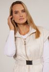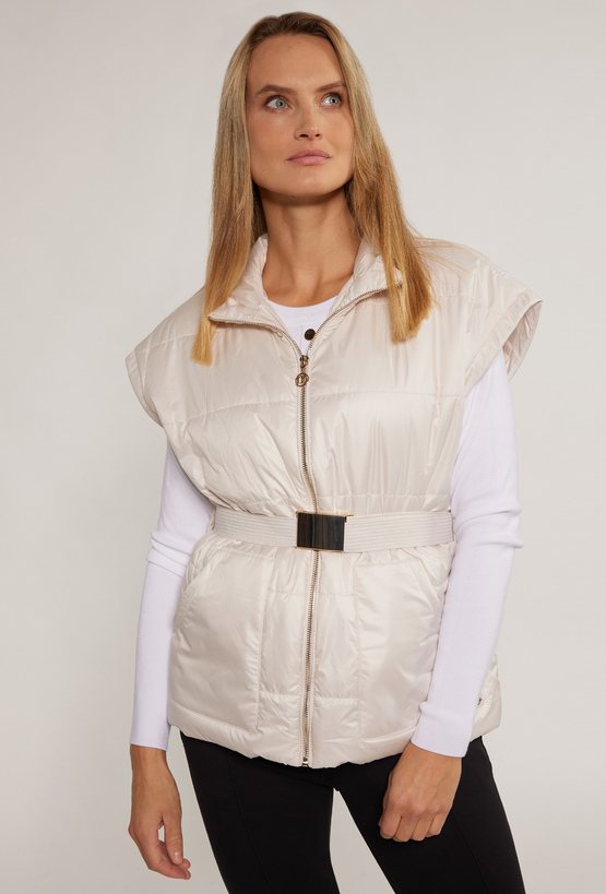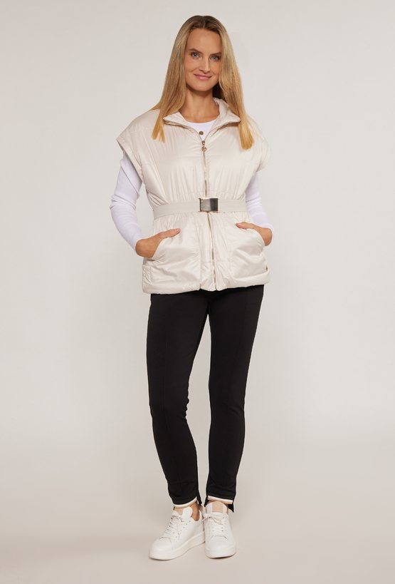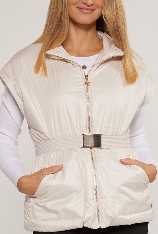 Bezrękawnik damski z paskiem, zapinany na suwak oraz z stójką przy dekolcie. Bezrękawnik na linii bioder ma wpuszczane kieszenie. Model ten z pewnością sprawdzi się jako baza do codziennych stylizacji. Modelka na zdjęciu ma 177 cm wzrostu i prezentuje rozmiar 36.