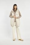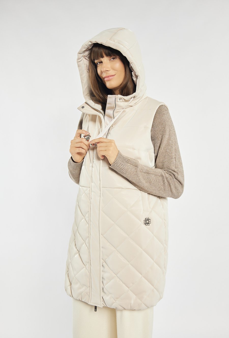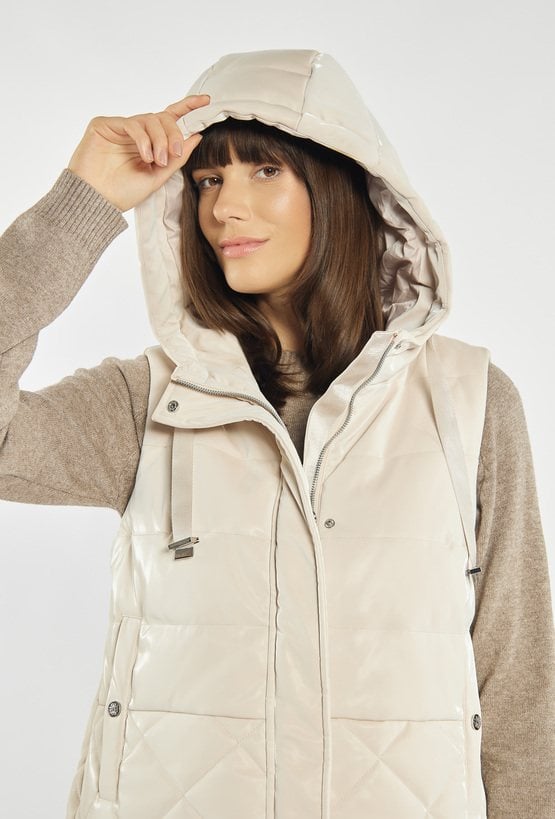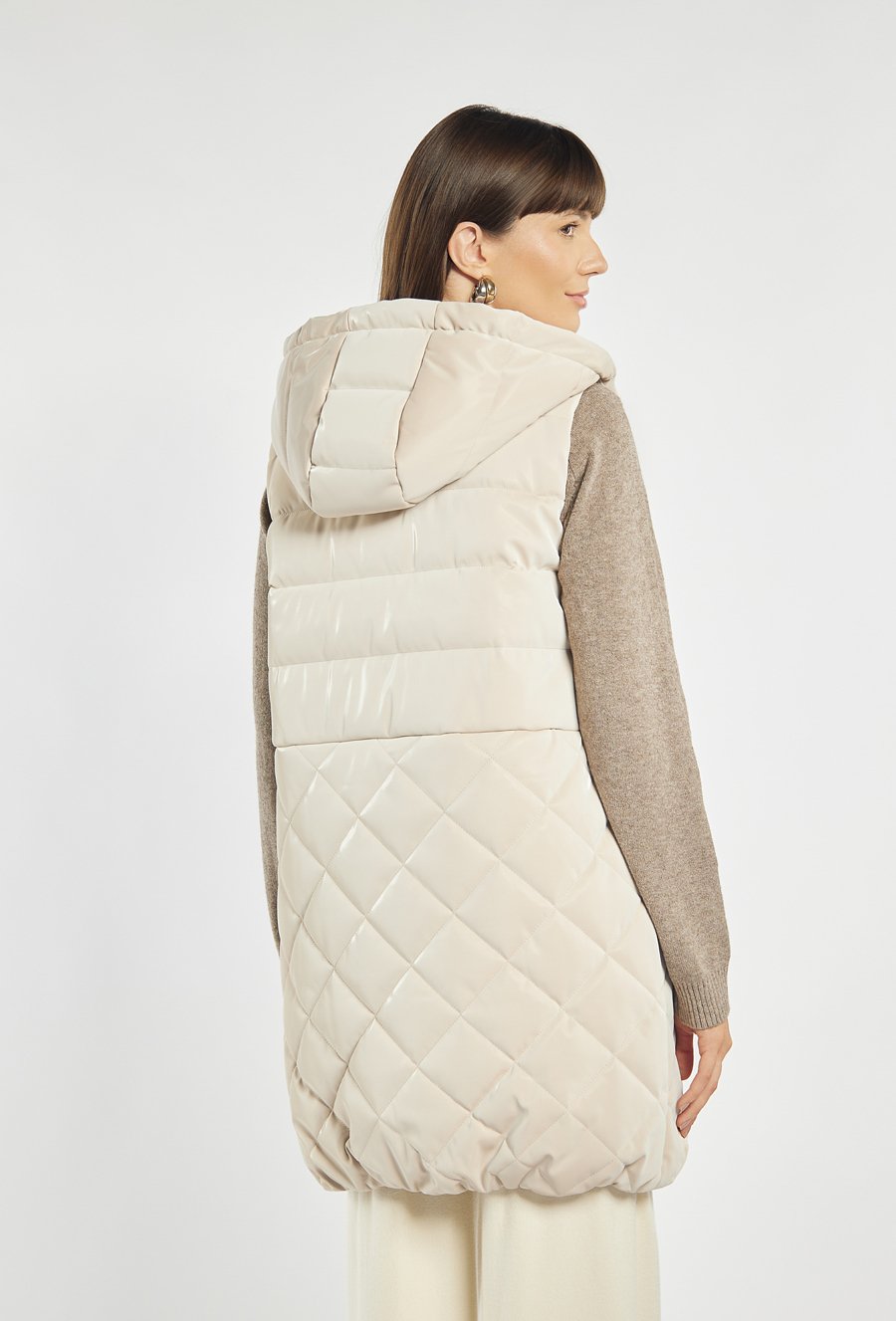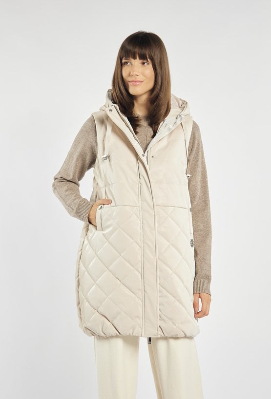 Długa kamizelka damska o pikowanym wykończeniu, idealna na chłodniejsze dni. Model zapinany na zamek i napy, z praktycznym kapturem oraz kieszeniami, które dodają wygody. Dzięki nowoczesnemu fasonowi świetnie sprawdzi się zarówno w sportowych, jak i codziennych stylizacjach. Stylowy, a zarazem funkcjonalny element garderoby na jesień i zimę. Modelka na zdjęciu ma 177 cm wzrostu i prezentuje rozmiar 36