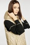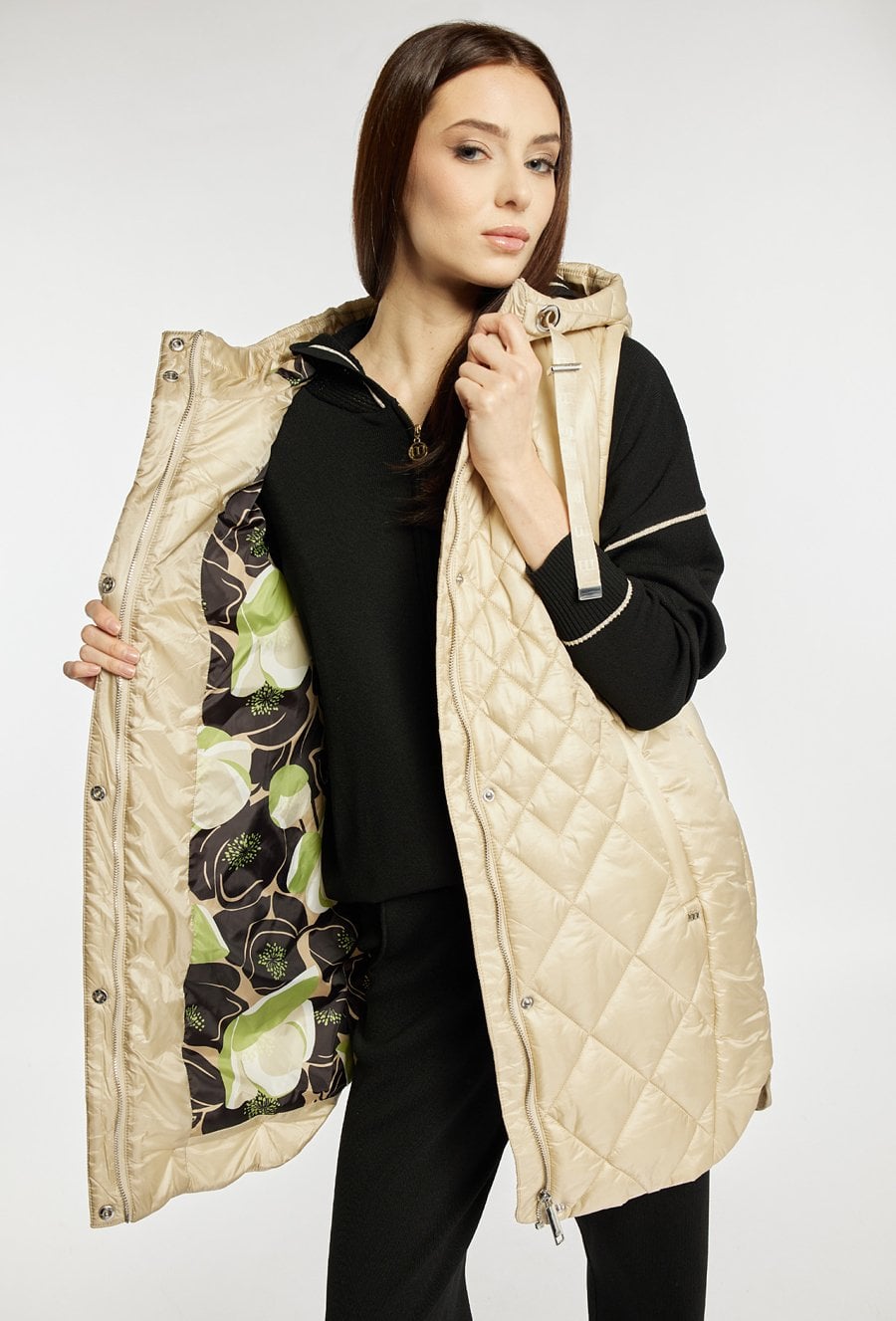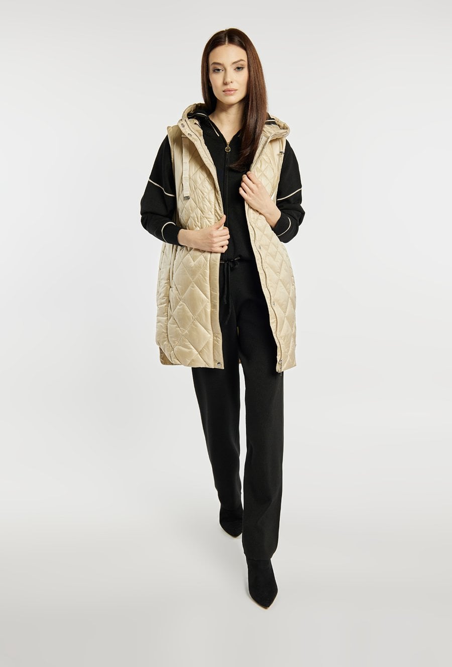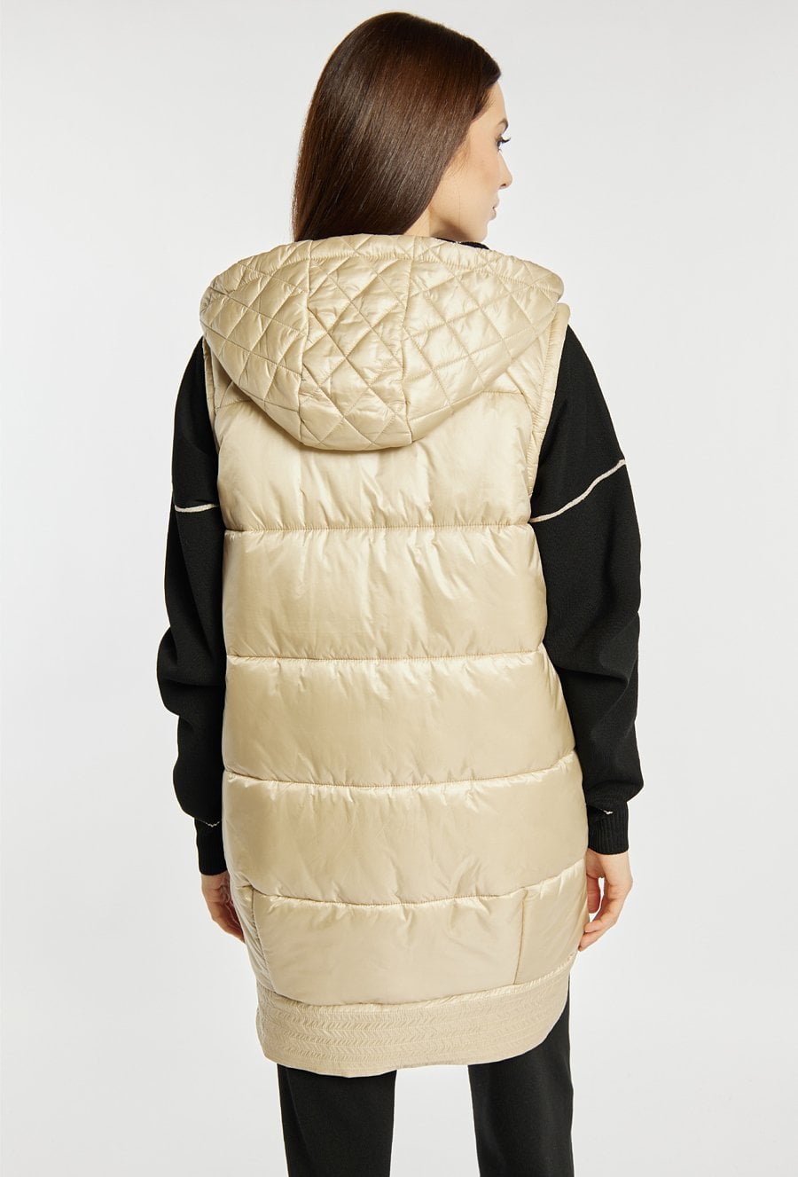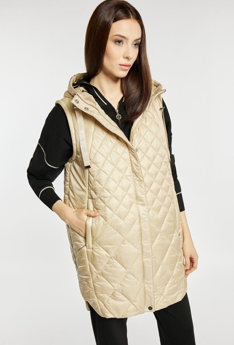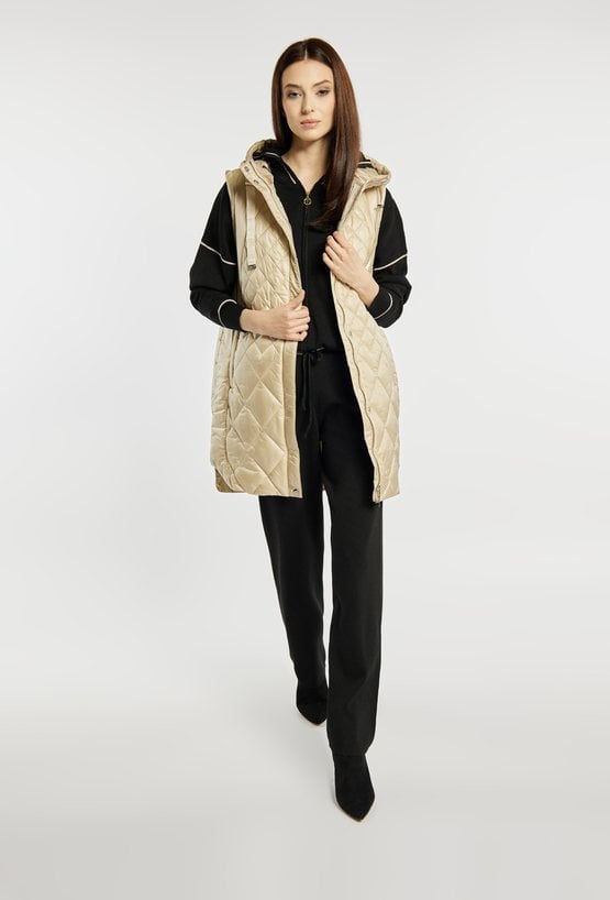 Dłuższa kamizelka damska z pikowaniem, idealna na wczesną wiosnę. Model z kapturem, kieszeniami zapinanymi na suwaki oraz zapięciem na suwak i napy na całej długości. Praktyczna, wygodna i stylowa- świetnie uzupełni codzienne zestawy. Modelka na zdjęciu ma 177 cm wzrostu i prezentuje rozmiar 36.