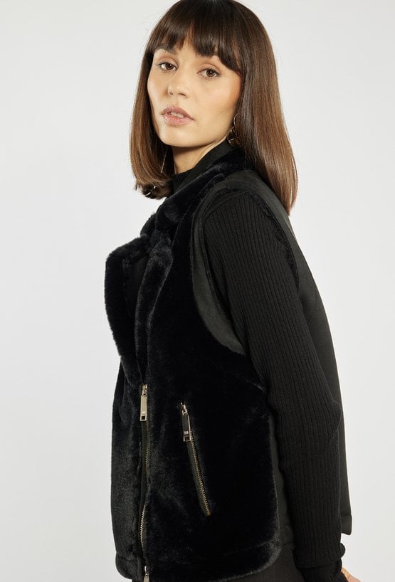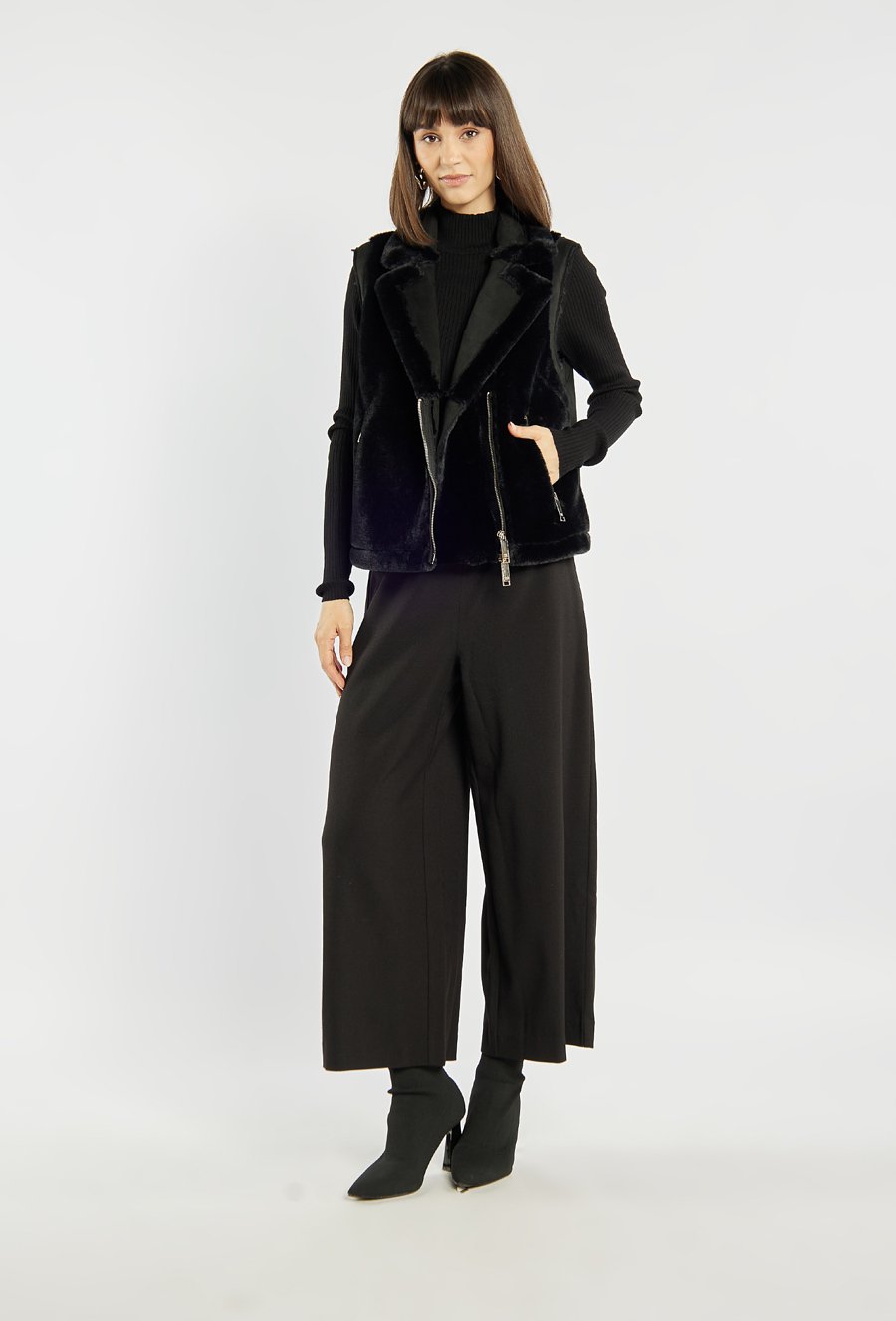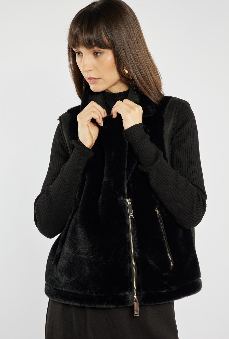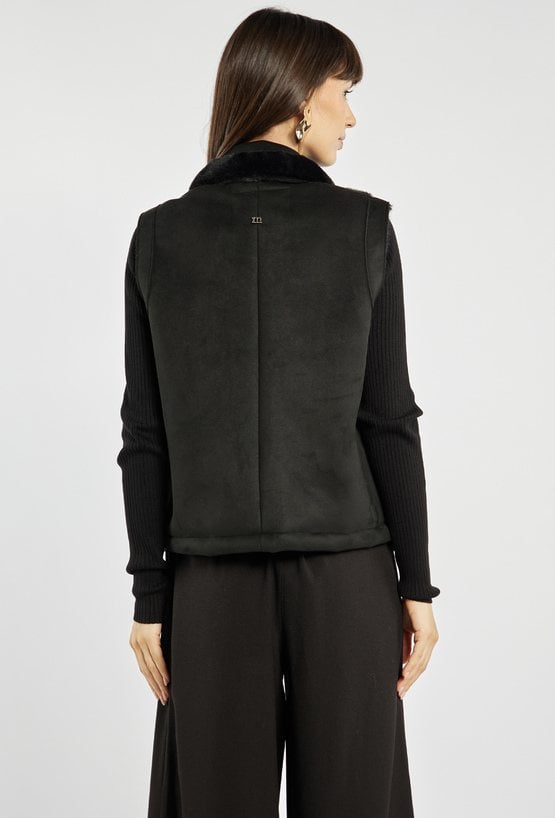 Miękka, welurowa kamizelka o wyjątkowo przyjemnej w dotyku strukturze to doskonały wybór na chłodniejsze dni. Asymetryczne zapięcie na suwak i klasyczny kołnierz dodają jej nowoczesnego charakteru. Model wyposażony jest w praktyczne kieszenie, co zwiększa jego funkcjonalność. Idealna do noszenia na swetry i golfy. Modelka na zdjęciu ma 177 cm wzrostu i prezentuje rozmiar 36.