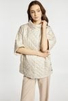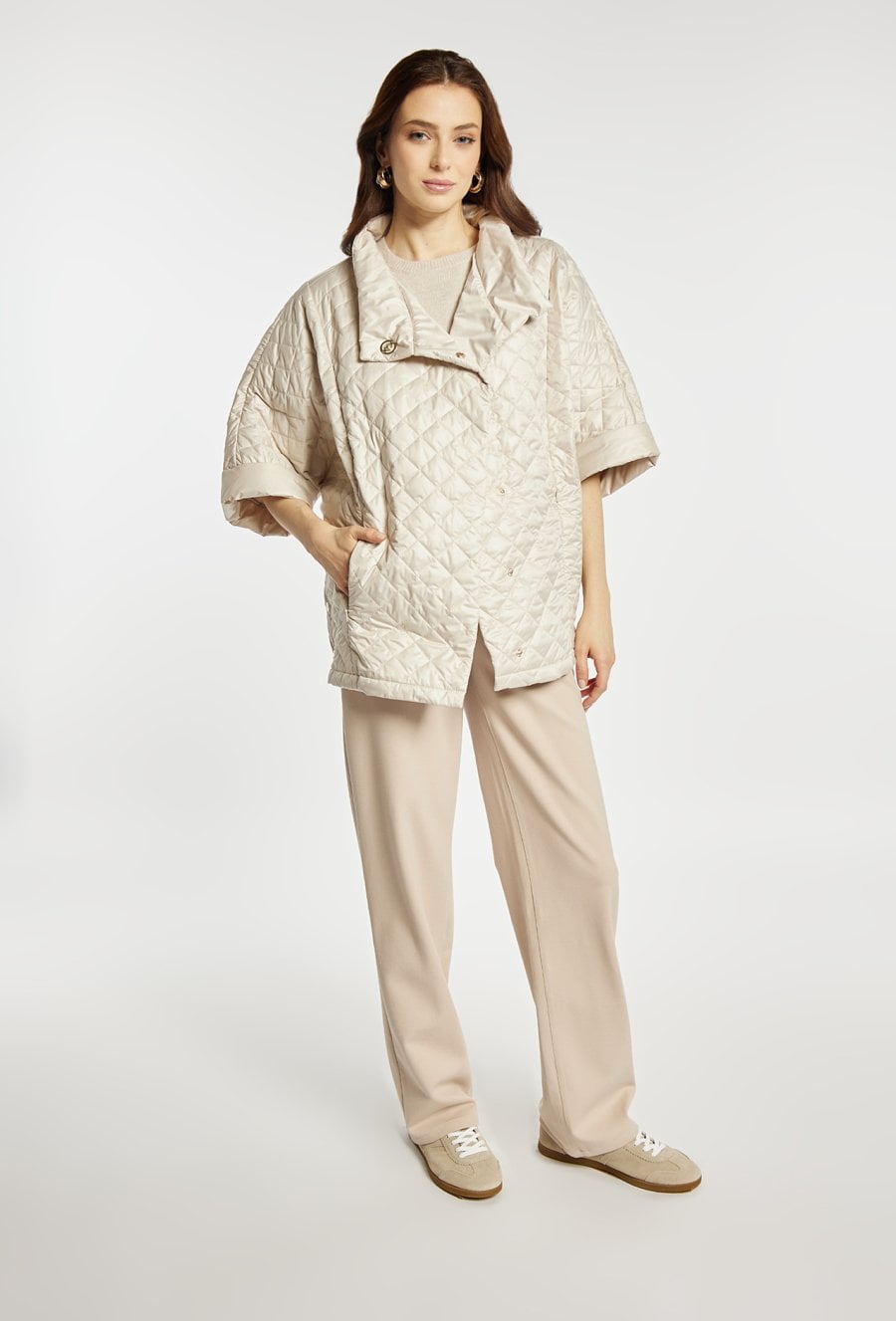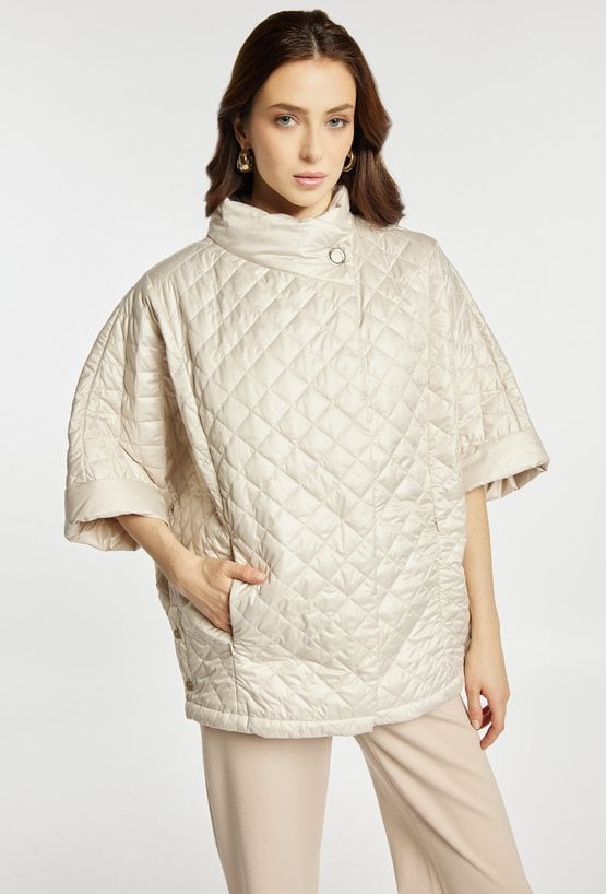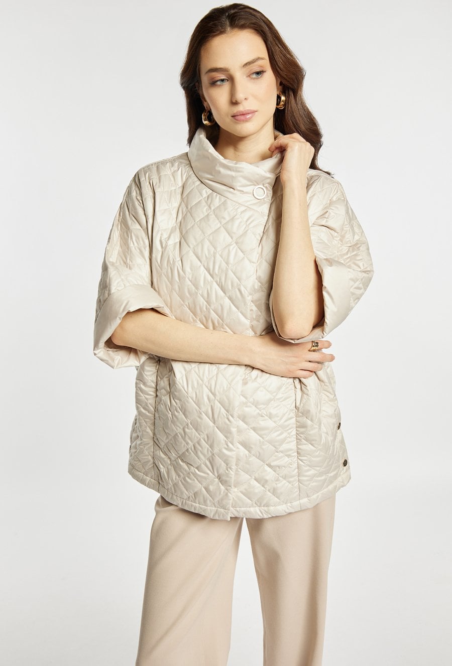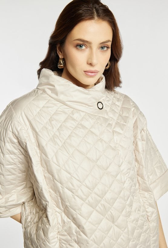 Kamizelka damska wykonana z lekkiego, pikowanego materiału, idealna na wiosenne dni. Kamizelka o luźnym, ponczowym kroju z wysoką stójką i krótkim rękawem zapewnia swobodę noszenia i nowoczesny wygląd. Model świetnie sprawdzi się jako stylowe uzupełnienie codziennych stylizacji. Modelka na zdjęciu ma 177 cm wzrostu i prezentuje rozmiar S/M.