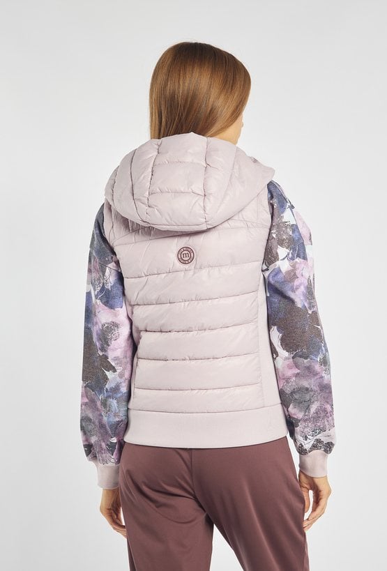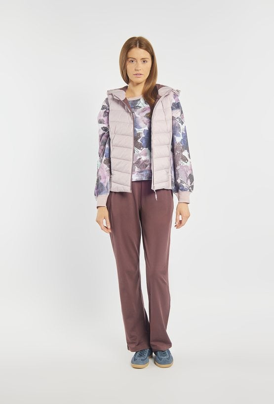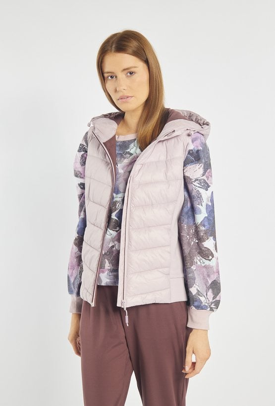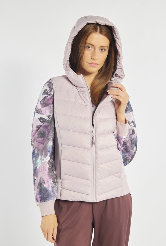 Kamizelka z kolekcji Joy&Relax. Lekka i wygodna, idealna jako dodatkowa warstwa na chłodniejsze dni. Pikowana część frontowa i kaptur nadają jej sportowego charakteru, a elastyczne wstawki po bokach zapewniają swobodę ruchów i komfort noszenia. Doskonale sprawdzi się w codziennych stylizacjach oraz podczas aktywności na świeżym powietrzu. Modelka na zdjęciu ma 177 cm wzrostu i prezentuje rozmiar S.